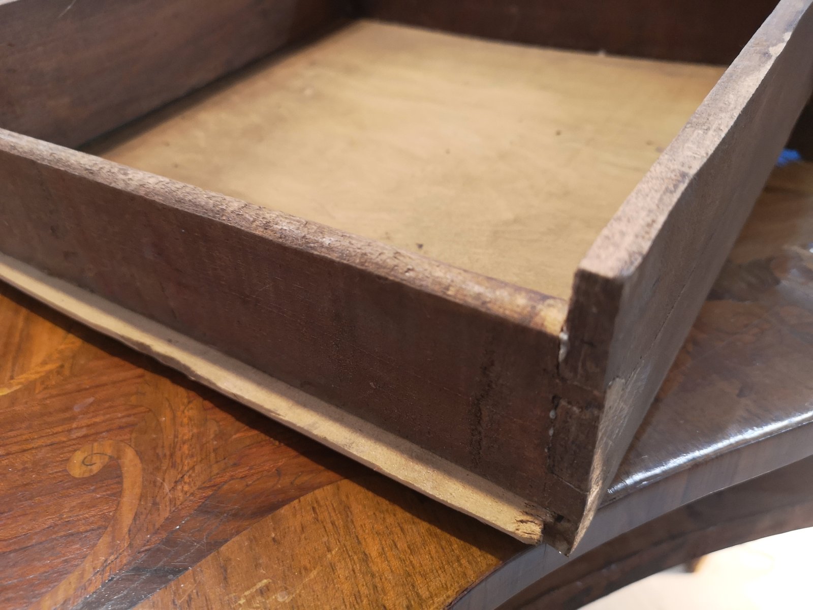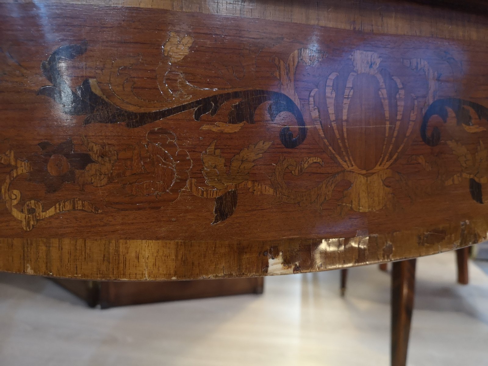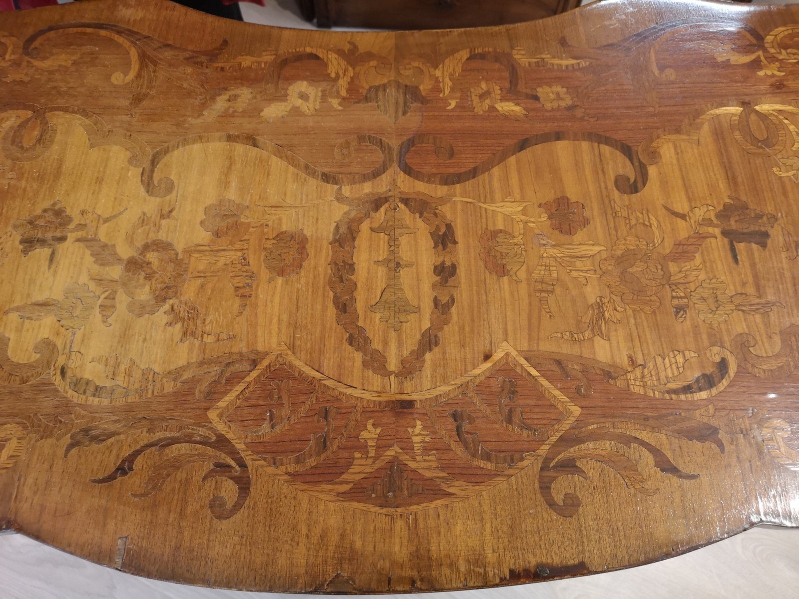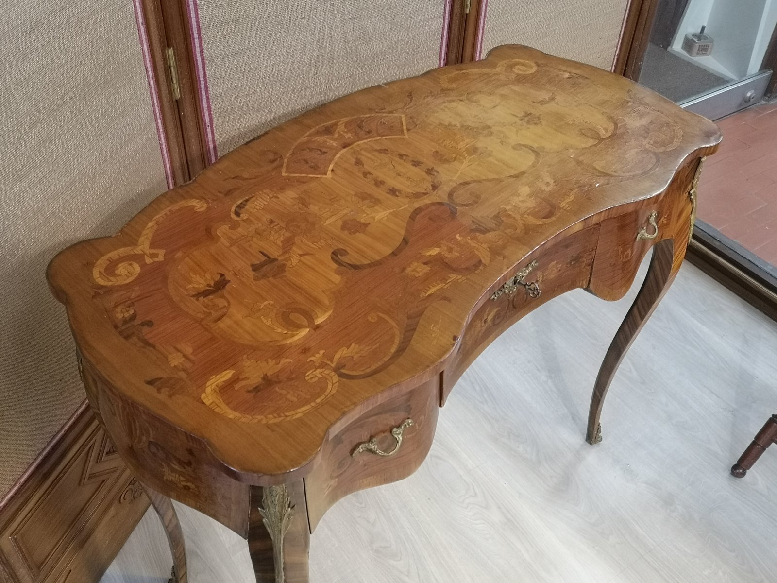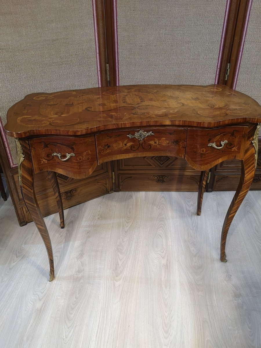Tisch mit floralen Intarsien aus Holz und Bronze mit Schubladen