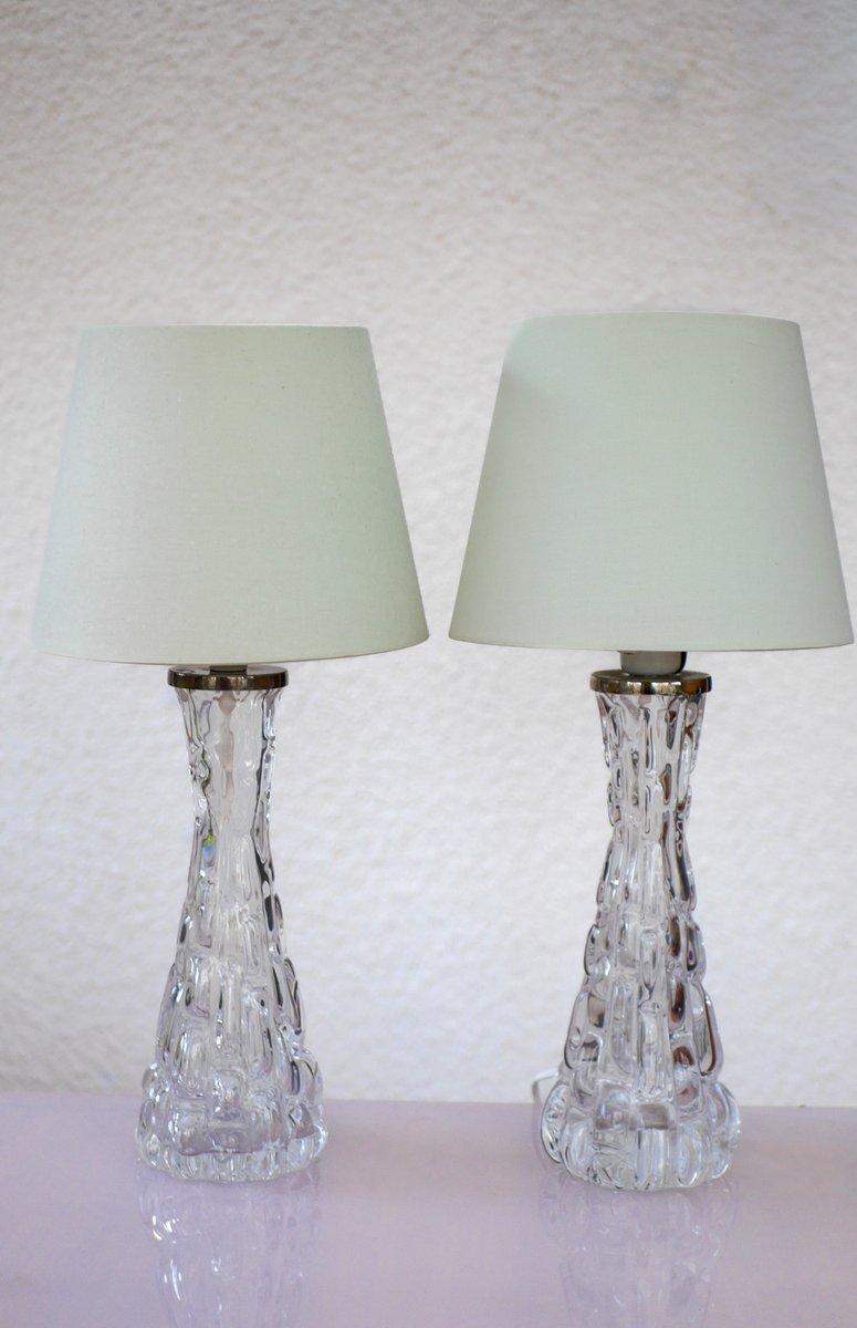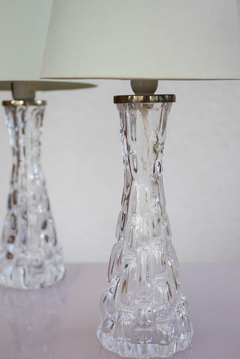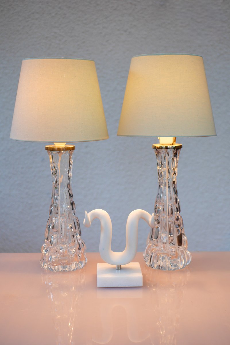 Ein außergewöhnliches Paar Kristallglas-Tischlampen, Modell RD 1477, entworfen von Carl Fagerlund für den renommierten schwedischen Glashersteller Orrefors, hergestellt in den 1970er Jahren. Diese Lampen sind ein Beispiel für Fagerlunds raffinierten Ansatz im Lichtdesign, bei dem die Klarheit der Form und des Materials im Mittelpunkt steht. Die massiven Kristallsockel haben eine elegante, längliche Tropfenform und sind sowohl skulptural als auch zurückhaltend. Die Schlichtheit des Designs lässt die Brillanz des Kristalls zur Geltung kommen und schafft ein raffiniertes Zusammenspiel von Licht und Reflexion. Trotz ihres Vintage-Ursprungs besitzen die Lampen eine ausgesprochen zeitgemäße Ausstrahlung, sodass sie sich gleichermaßen für moderne und klassische Innenräume eignen. Carl Fagerlund, bekannt für seine Arbeit bei Orrefors, wird dafür gefeiert, dass er Kristall in zeitlose Beleuchtungsobjekte verwandelt, und dieses signierte Paar ist ein schönes Beispiel für sein bleibendes Vermächtnis.