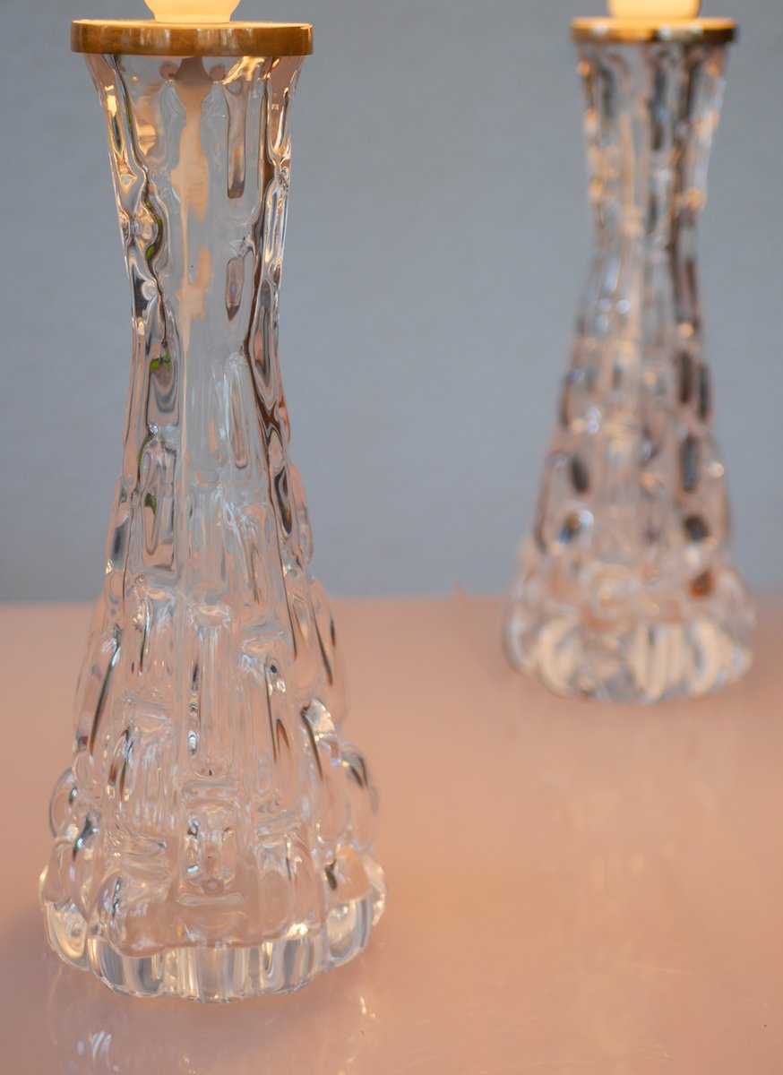Shaped in an elegant, elongated teardrop silhouette, the solid crystal bases are both sculptural and understated. The simplicity of the design allows the brilliance of the crystal to shine, creating a sophisticated interplay of light and reflection. Despite their vintage origin, the lamps possess a distinctly contemporary presence, making them equally suited to modern and classic interiors.