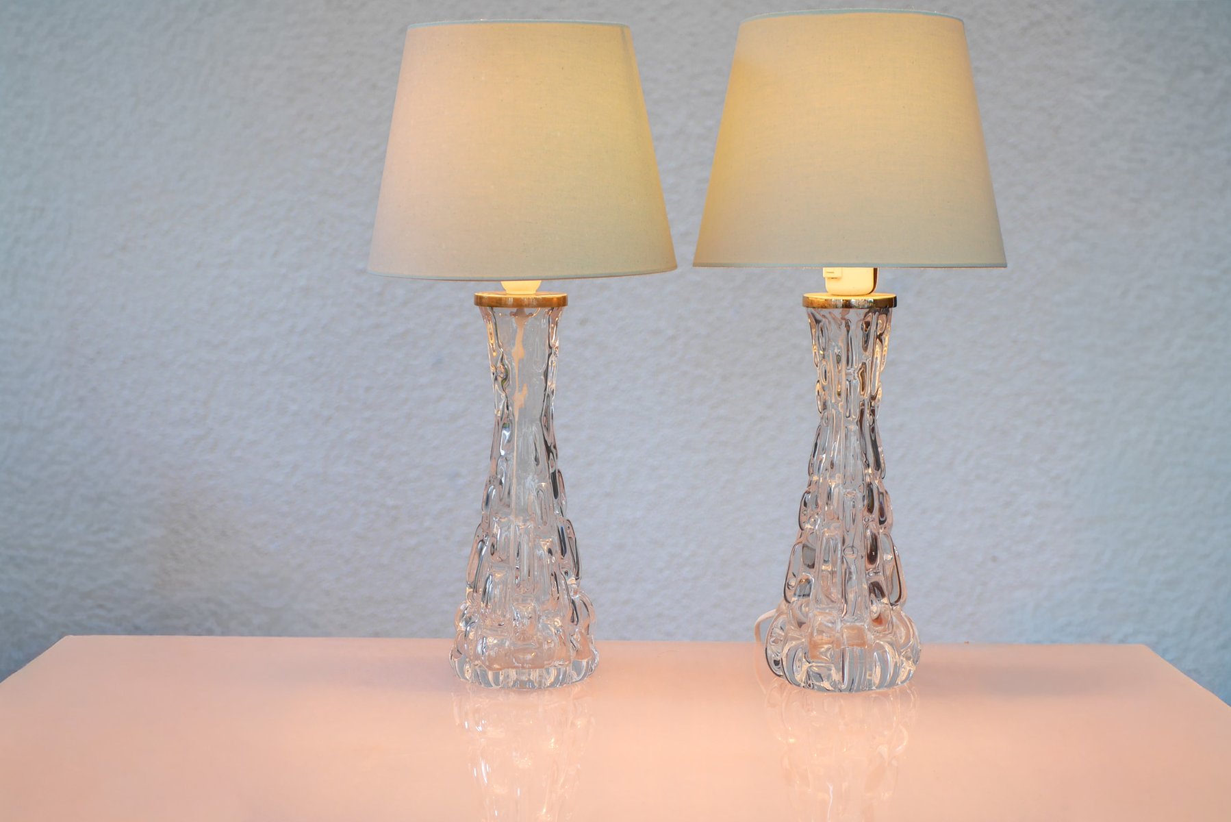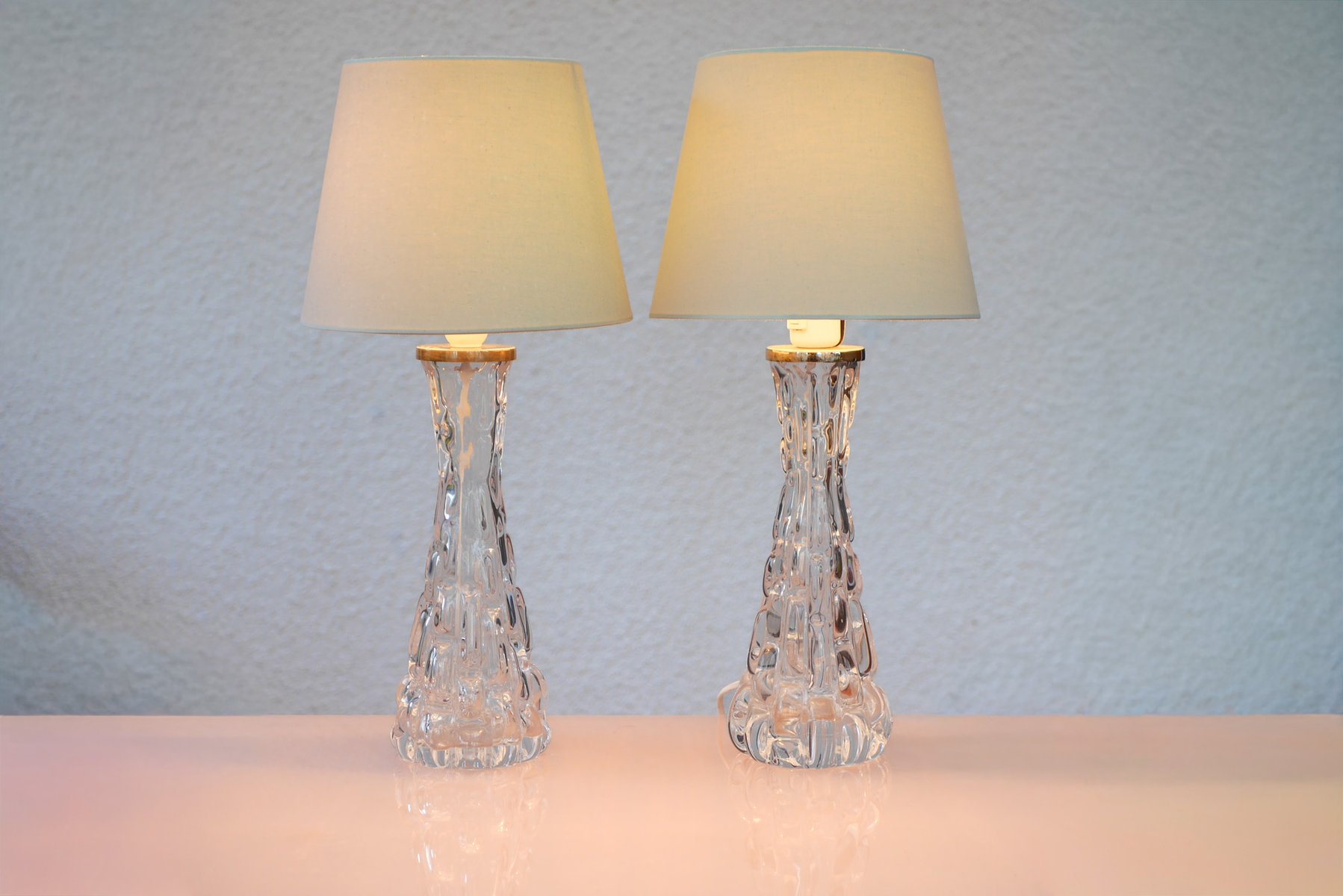 Renowned for his work with Orrefors, Carl Fagerlund is celebrated for transforming crystal into timeless lighting objects, and this signed pair is a fine example of his enduring legacy.