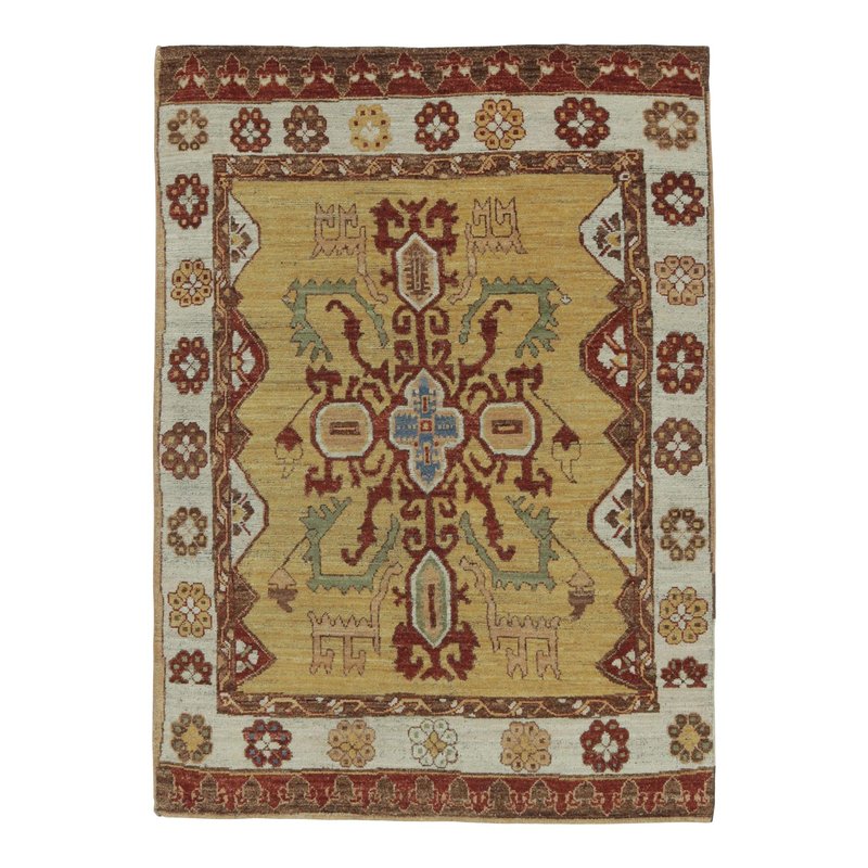 Hand-knotted in wool, this 4x6 rug is a new addition to Rug&Kilim’s custom-classics Burano Collection. This line represents a bold and luxurious new exploration of important classics and period pieces, like this tribal rug inspired by antique Caucasian rugs of great historical significance to the craft. On the Design: Admirers of the craft may know Kazak rugs for their particularly bright, vibrant hues among their many beauties, and appreciate this unexpected approach to the style. In this piece, the more traditional, rich colors of such provenance have been exchanged for these bright, contemporary hues in a whole new way to look at the style. Golds, cool blues, creams, beige-browns and reds underscore the same bold, graphic geometric patterns and tribal medallion of the Kazak sensibility—a fresh, revitalized approach to a classic. Keen eyes for the tactile will further admire an especially soft, comfortable texture and beauty inherent to the wool that underscores this piece. It’s an intentional contribution to a classic for a more contemporary level of comfort, and one of the many beauties that makes this collection a sophisticated, smart new language in design.