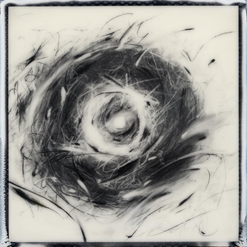 Descent into Fusion is an abstract study of fusion as a universal event: two separate fields drawn into one outcome. Built through layered charcoal on paper, the image follows a clear progression, clean separation, inward fall, compression, and a single breach, until a dense, dark nucleus forms and a pale halo lifts around it. The original drawing is then photographed on Polaroid film, preserving the work as a time-stamped analogue object in which pressure, abrasion, and chemical bloom hold the image in a single, irreversible state. The result is both physical and atmospheric: a record of matter under force, distilled into a quiet, decisive form. Archival pigment print on Hahnemühle Photo Rag Baryta paper. Stamped, labelled, and accompanied by a signed Certificate of Authenticity.