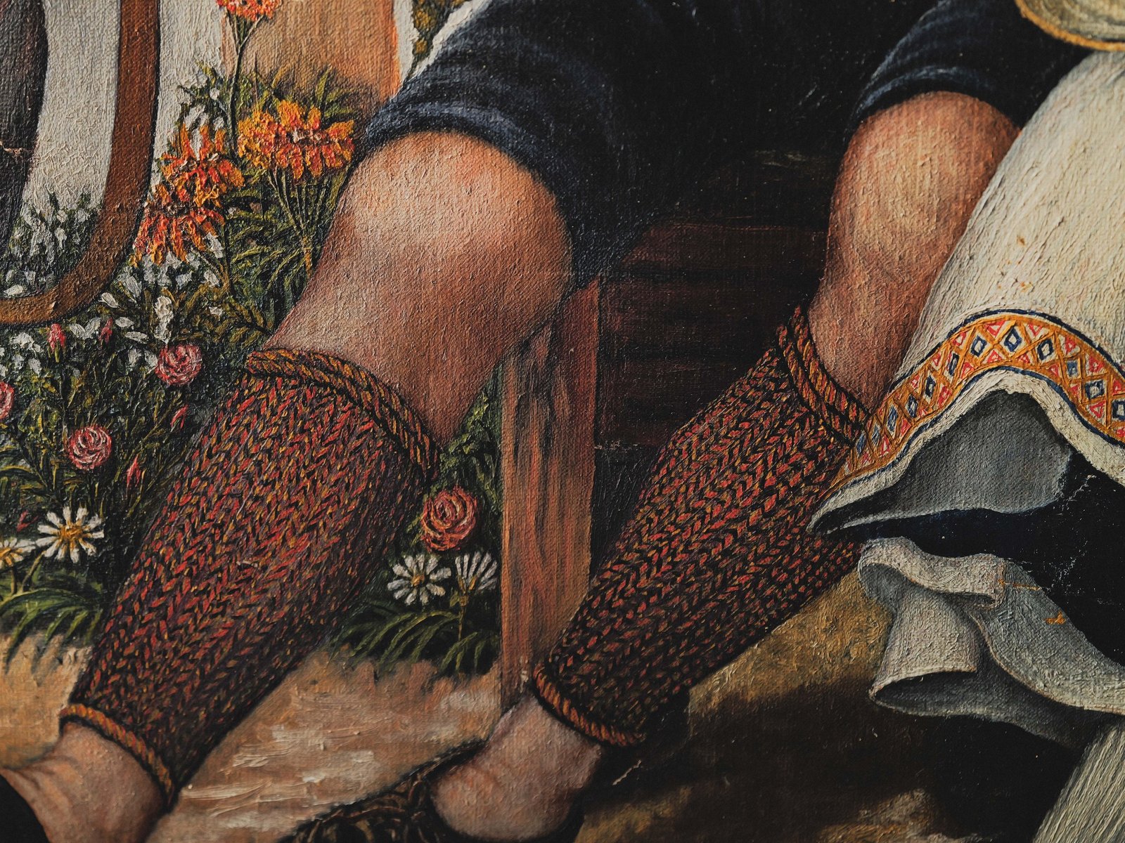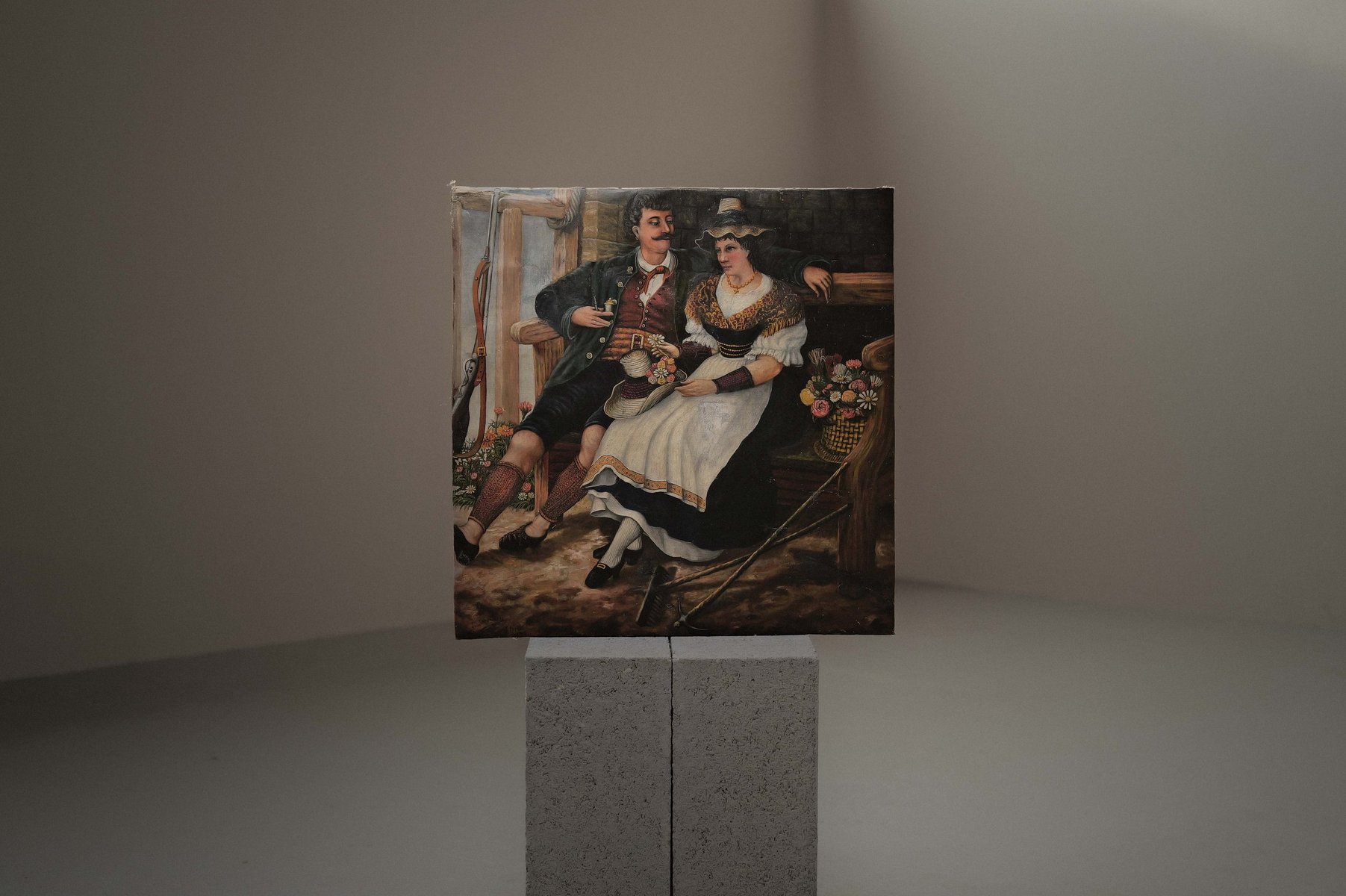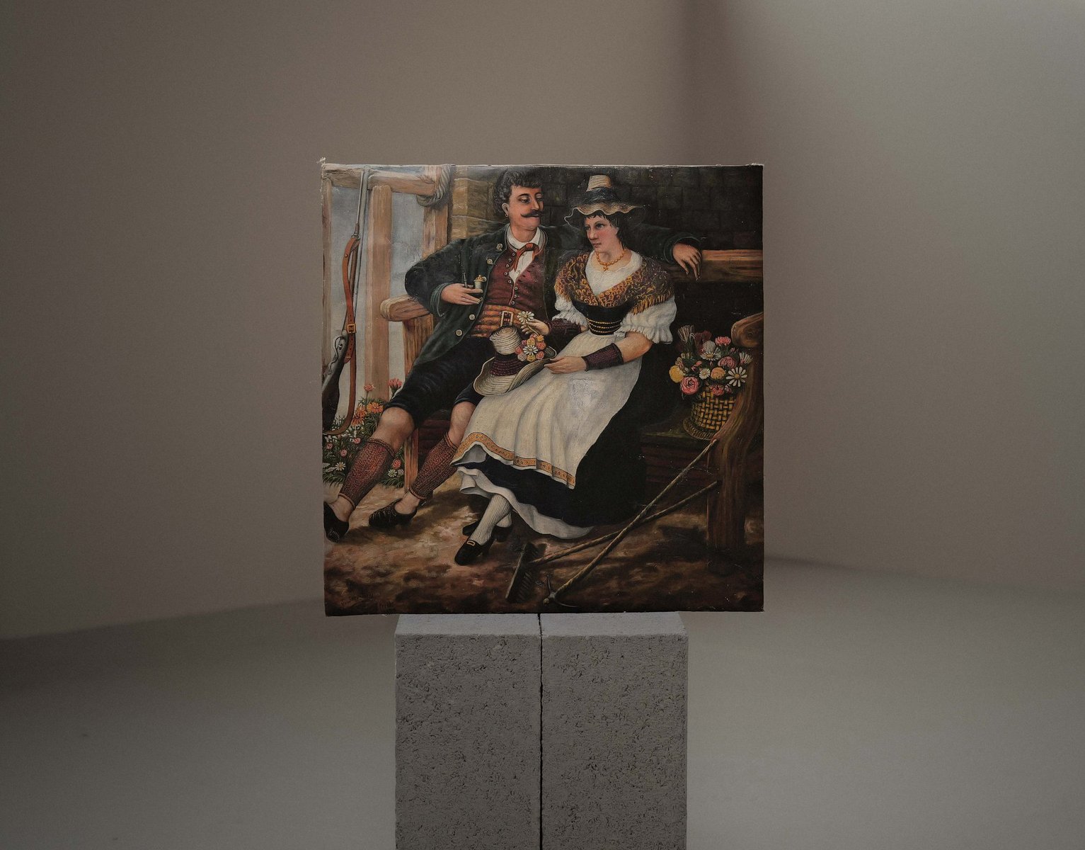 The composition depicts a Bavarian couple in traditional attire, seated before a rustic backdrop. The painter pays particular attention to fabrics, folkloric accessories, and the intimate, narrative posture of the pair. The treatment of the faces, flowers, and furniture reflects a naturalist eye typical of the period.
