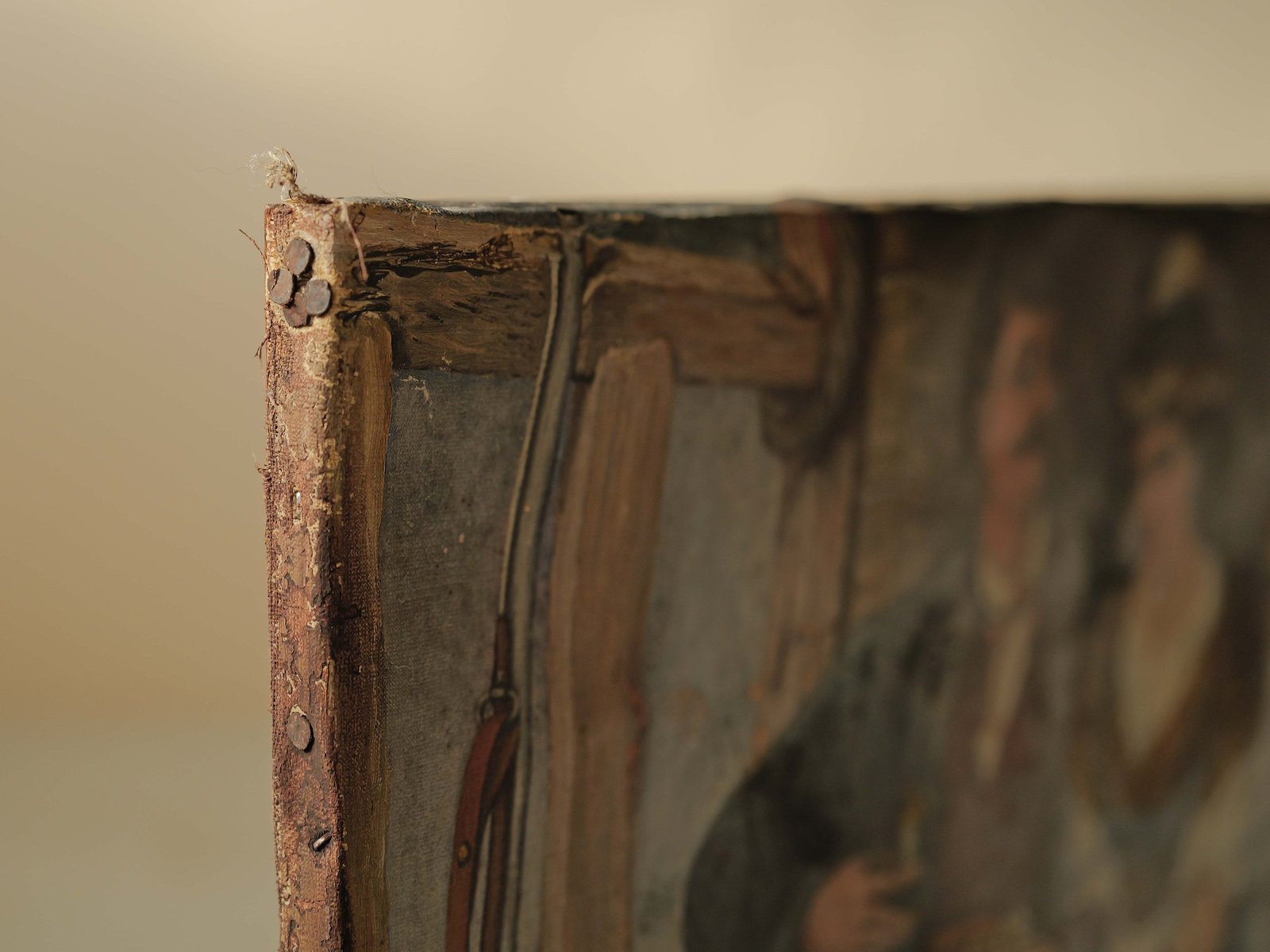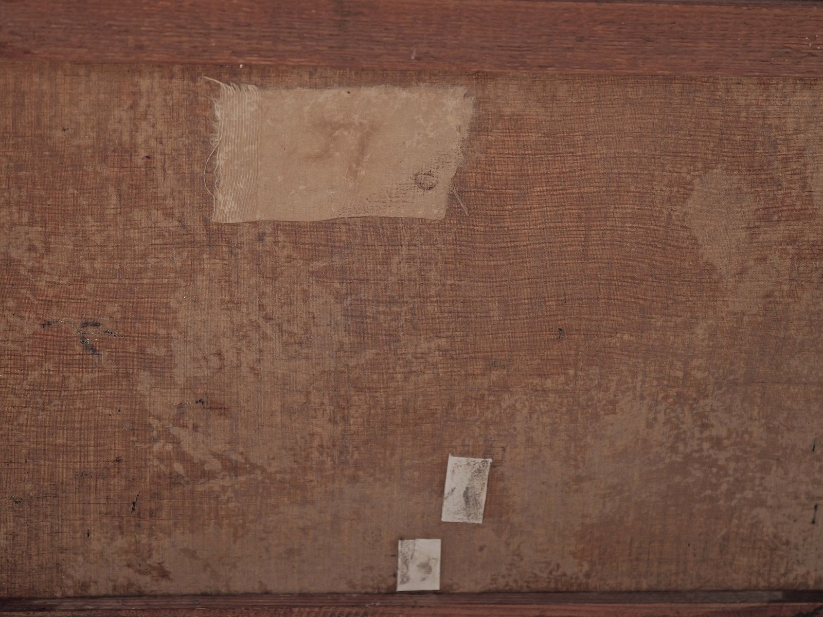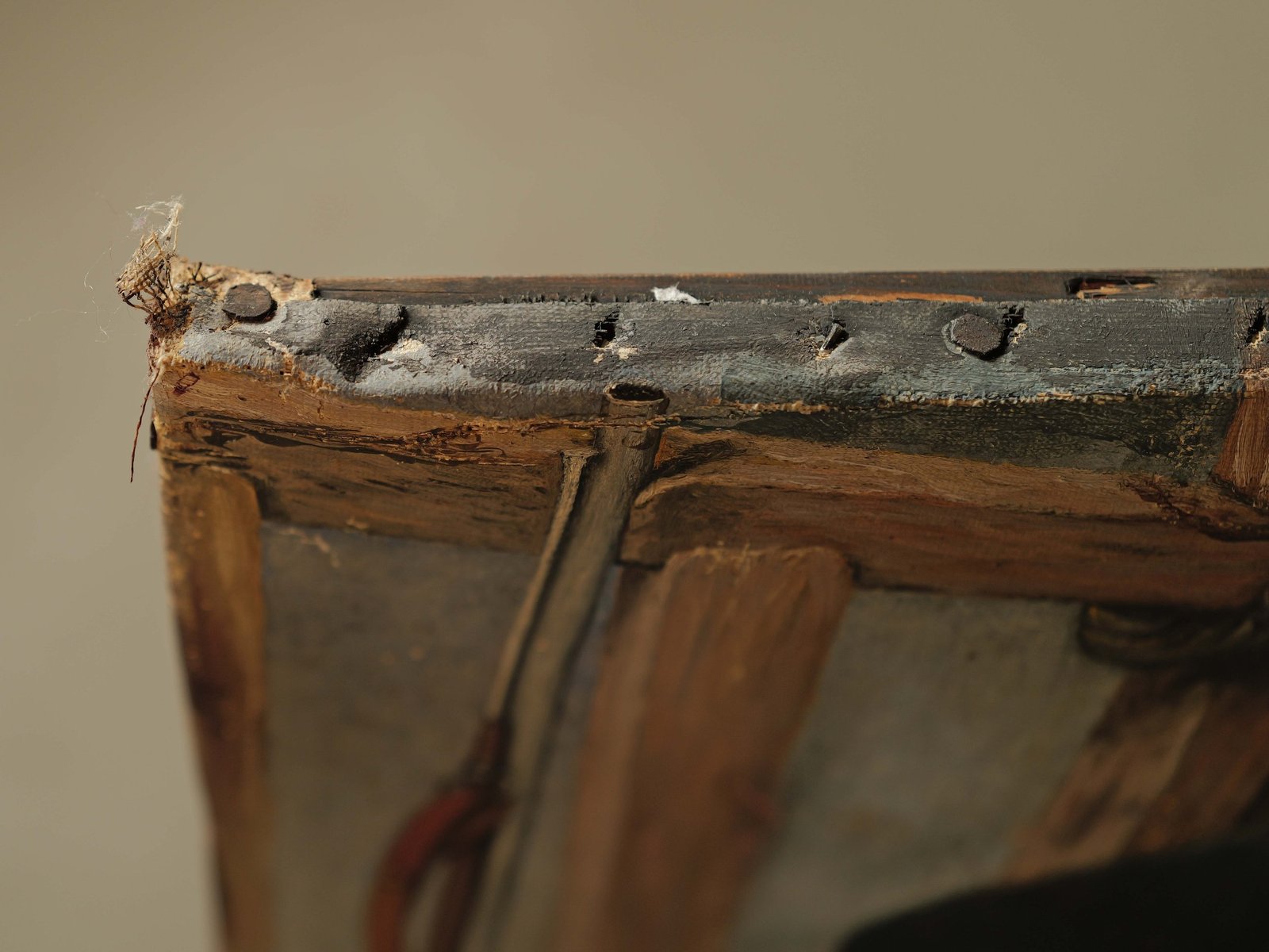 Die Originalleinwand ist auf einen alten hölzernen Keilrahmen aufgezogen und weist eine patinierte Rückseite, eine horizontale Stützleiste und Spuren früherer Restaurierungen auf.