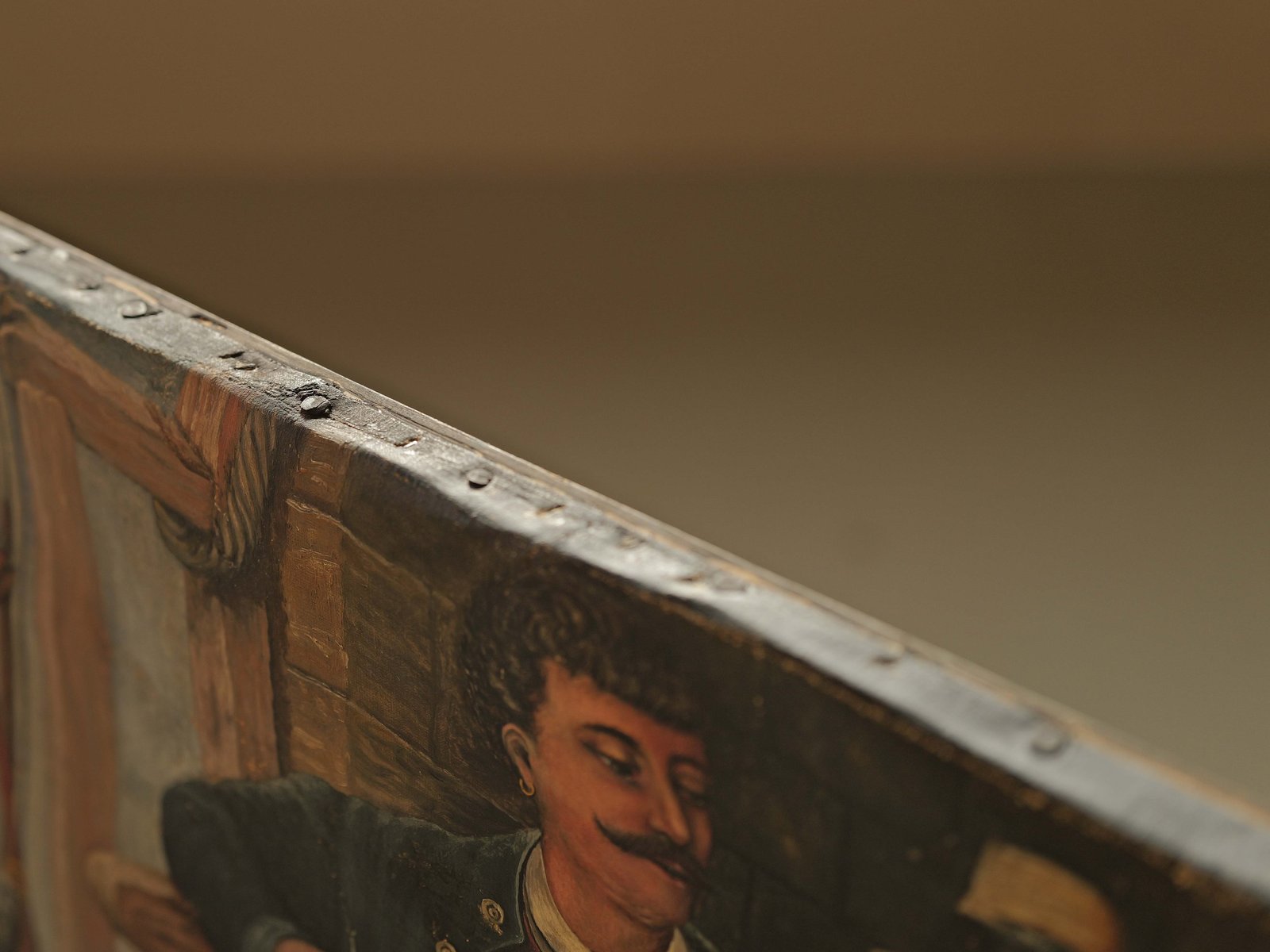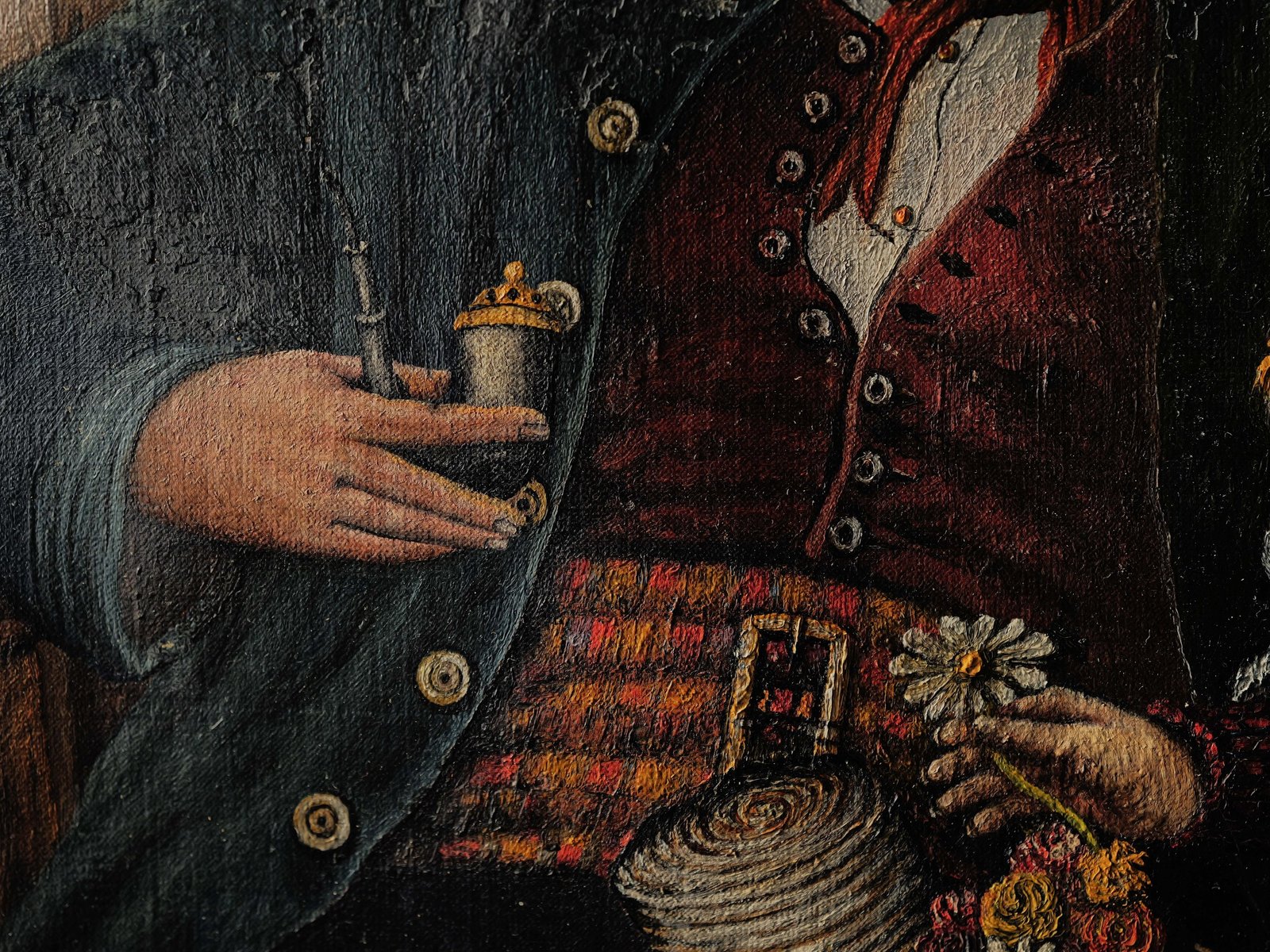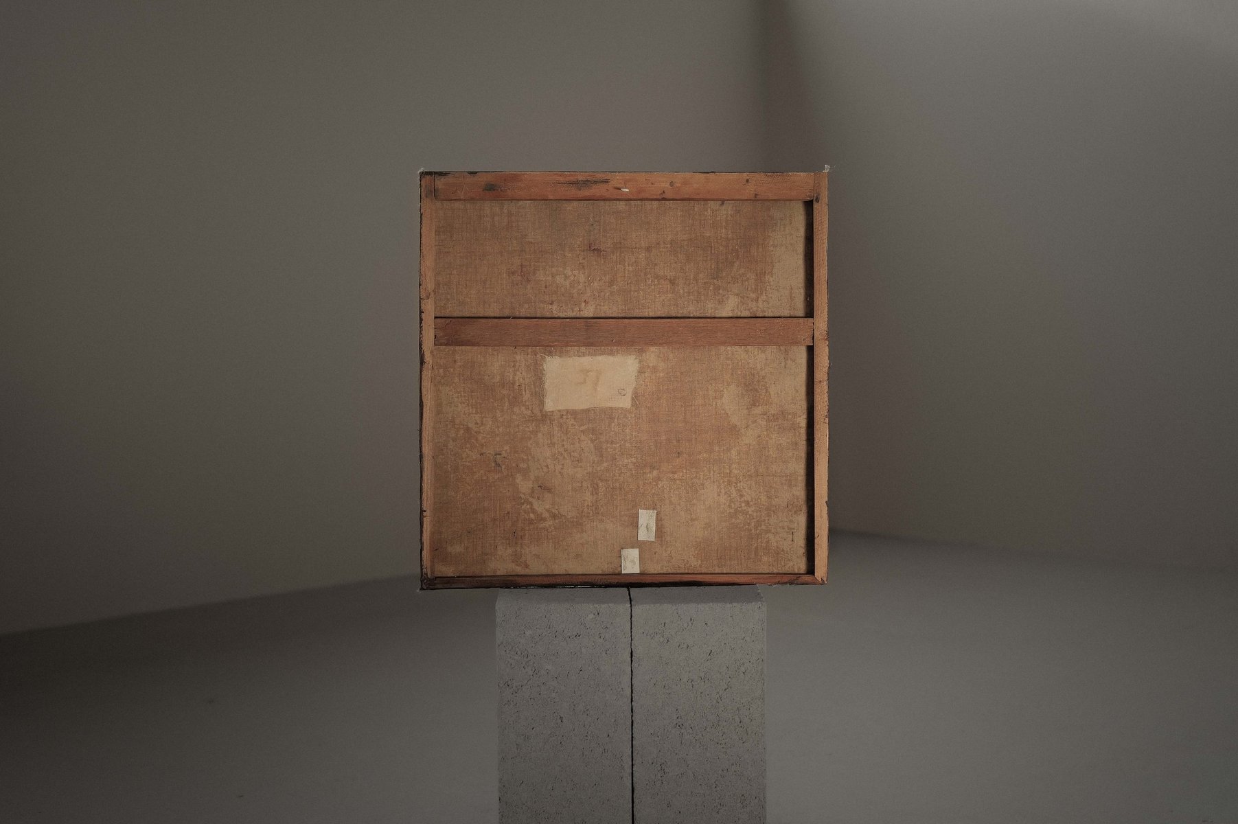Die Originalleinwand ist auf einen alten hölzernen Keilrahmen aufgezogen und weist eine patinierte Rückseite, eine horizontale Stützleiste und Spuren früherer Restaurierungen auf.