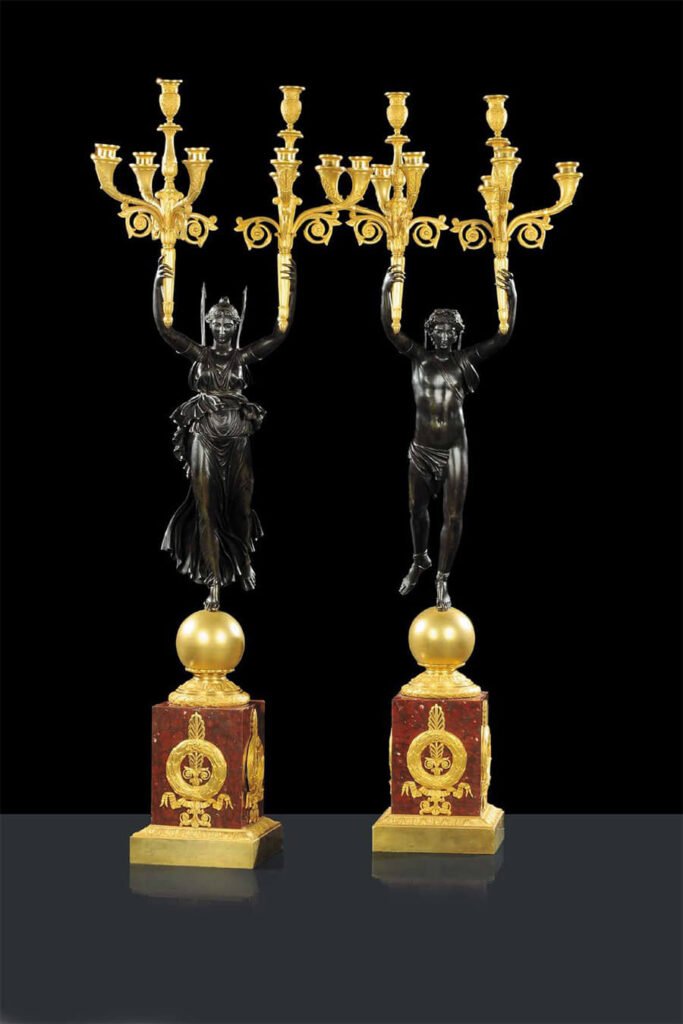 Monumental figural candelabra of this height, sculptural ambition and level of execution are exceptionally rare. While smaller Empire candelabra are relatively well documented, examples exceeding one metre in height — and preserved as a complete and harmonious pair — are seldom encountered. Their survival reflects both the extraordinary quality of their manufacture and the importance of their original setting.