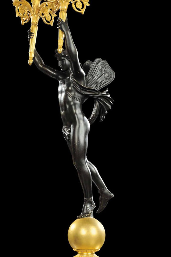 Jeder Kandelaber wird von einer fein modellierten geflügelten Figur getragen, einer männlichen und einer weiblichen, die aus reich patinierter Bronze gegossen sind. Die Figuren sind in dynamischem Kontrapost gestaltet, ihre Körper sind subtil animiert und verbinden klassische Zurückhaltung mit einem starken Bewegungsgefühl. Die männliche Figur ist mit selbstbewusster anatomischer Präzision dargestellt, während die weibliche Figur sich durch fließende Gewänder auszeichnet, die sich zart an die Form schmiegen und das Gefühl von Eleganz und Rhythmus verstärken.