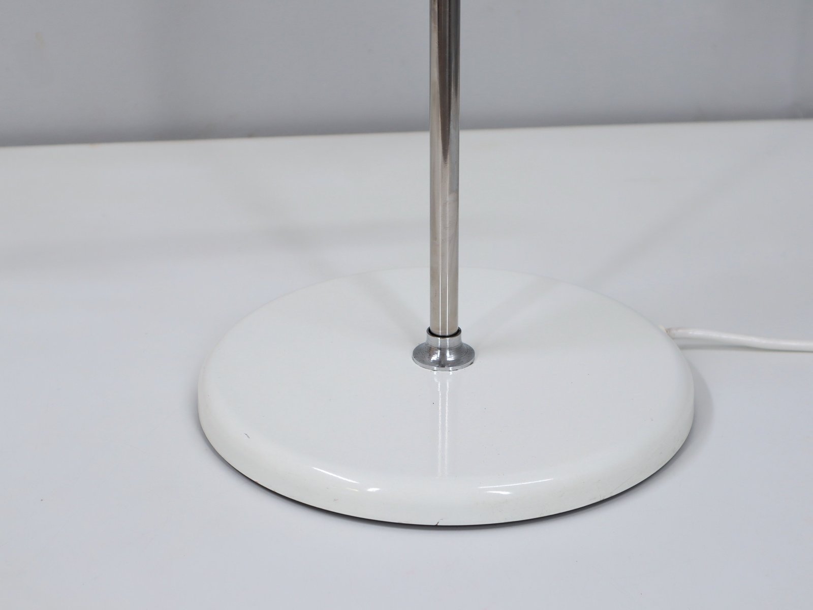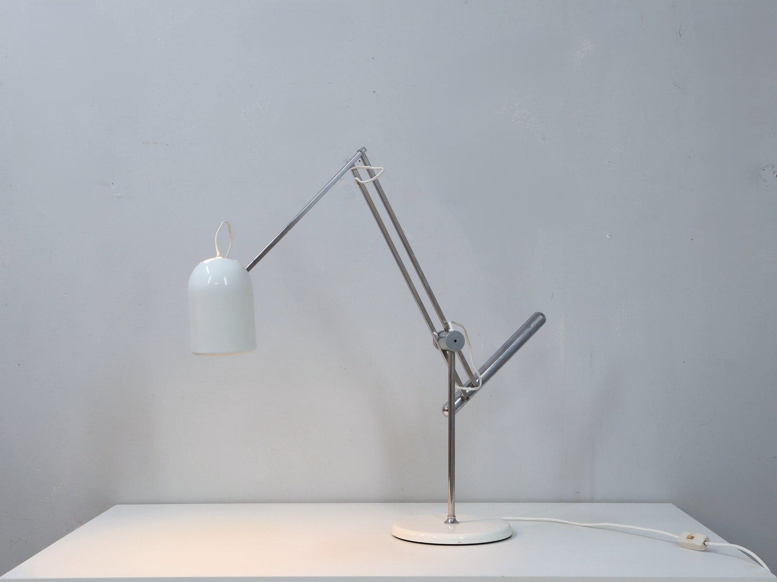 An iconic model that perfectly combines functionality and formal purity, featuring an adjustable chrome-plated steel arm and a white lacquered metal shade. The round base, also lacquered, bears the Reggiani embossed logo, ensuring authenticity and origin.