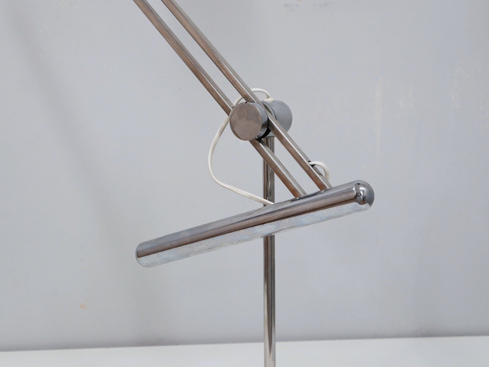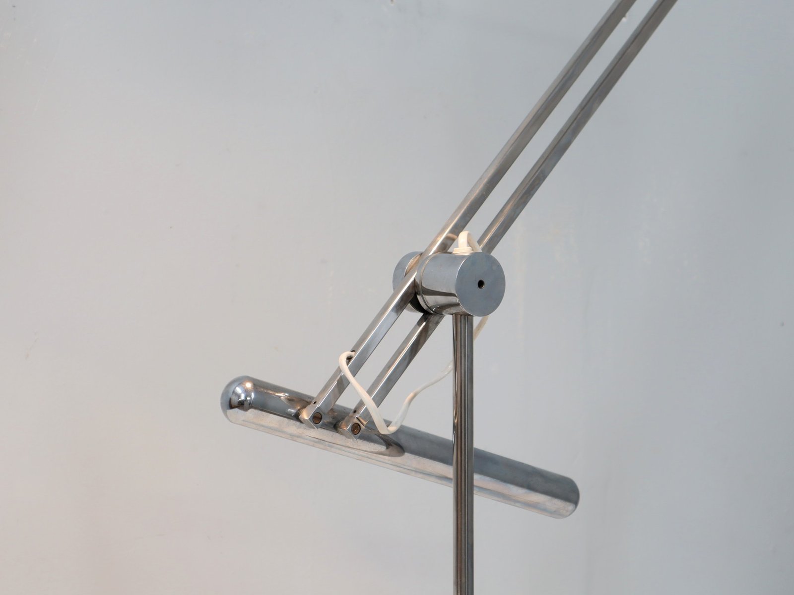 Ein ikonisches Modell, das Funktionalität und formale Reinheit perfekt verbindet, mit einem verstellbaren Arm aus verchromtem Stahl und einem weiß lackierten Metallschirm. Der runde, ebenfalls lackierte Sockel ist mit dem geprägten Reggiani-Logo versehen, das Authentizität und Herkunft garantiert.
