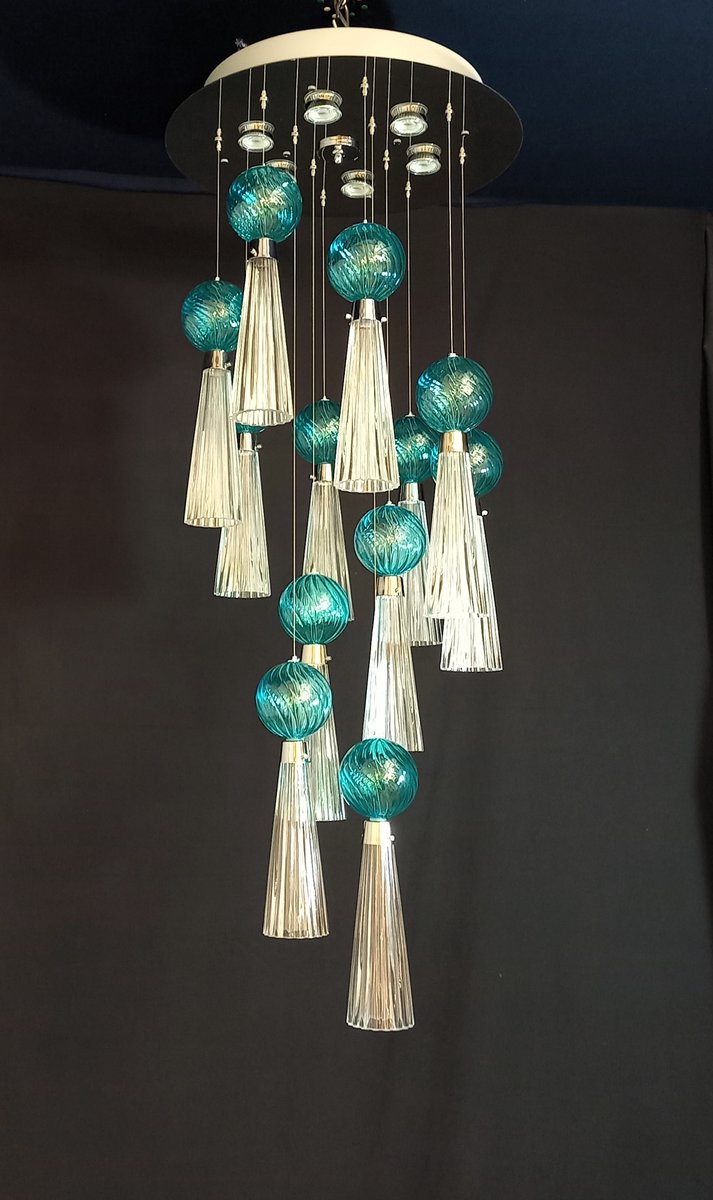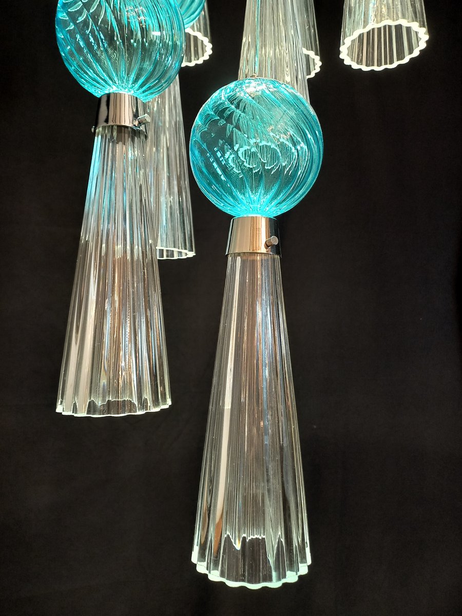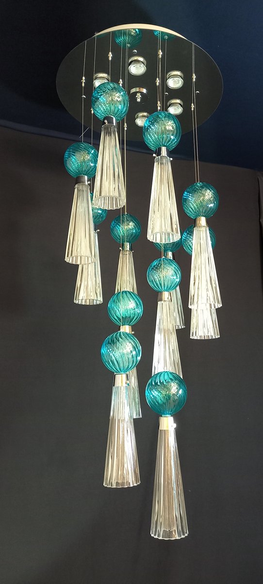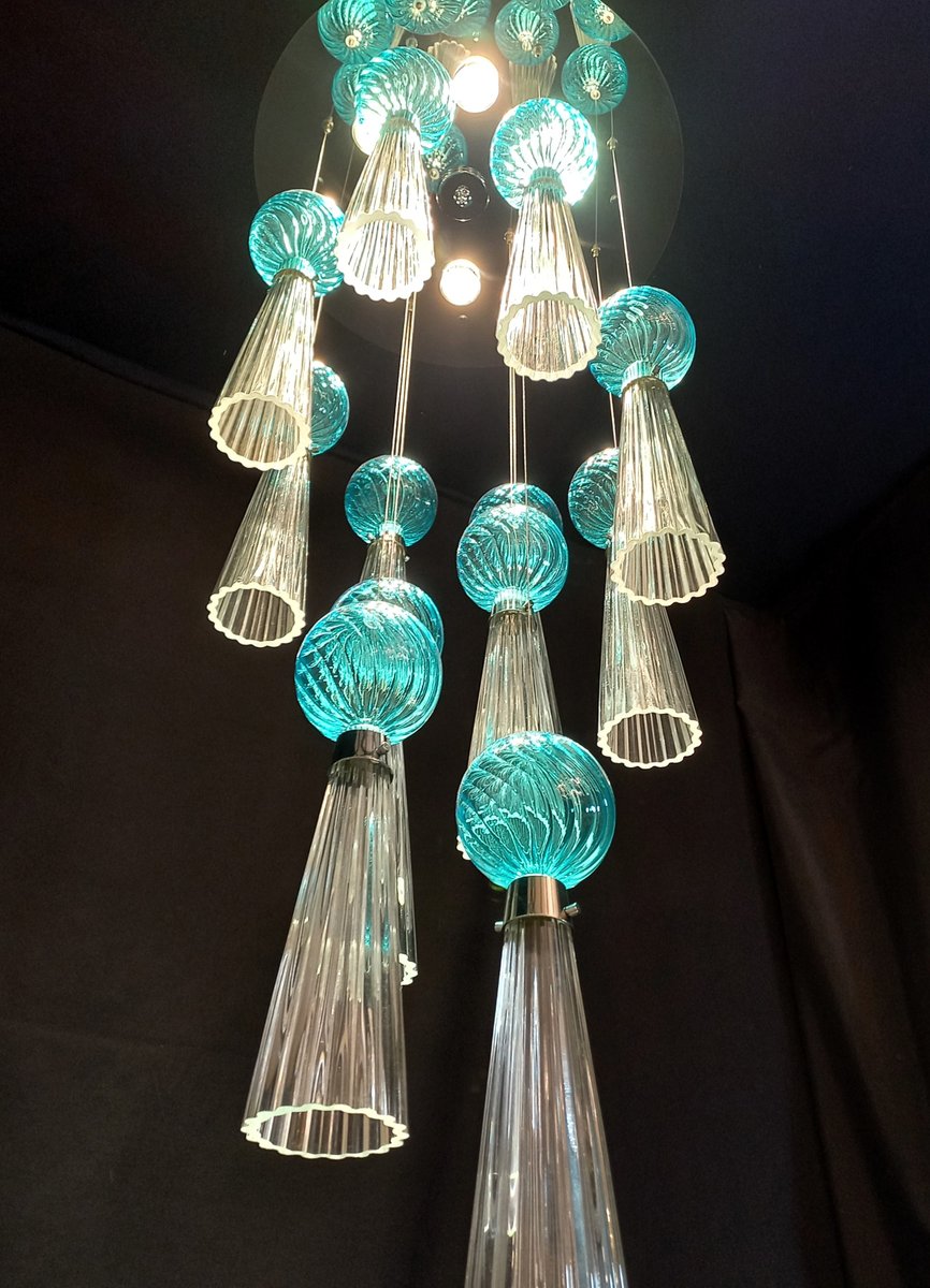 To summarize: Ceiling light composed of a 50 cm diameter steel plate in reflective polished chrome, in which 6 GU10 LED lights are embedded. Twelve steel cables extend from the plate, adjustable up to a length of 150 cm, from which 12 hand-blown Murano glass lamps are securely suspended. These consist of a blown aquamarine blue sphere and a cone-shaped glass with a striped pattern in handmade Murano crystal.