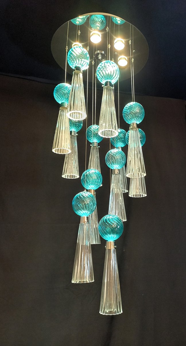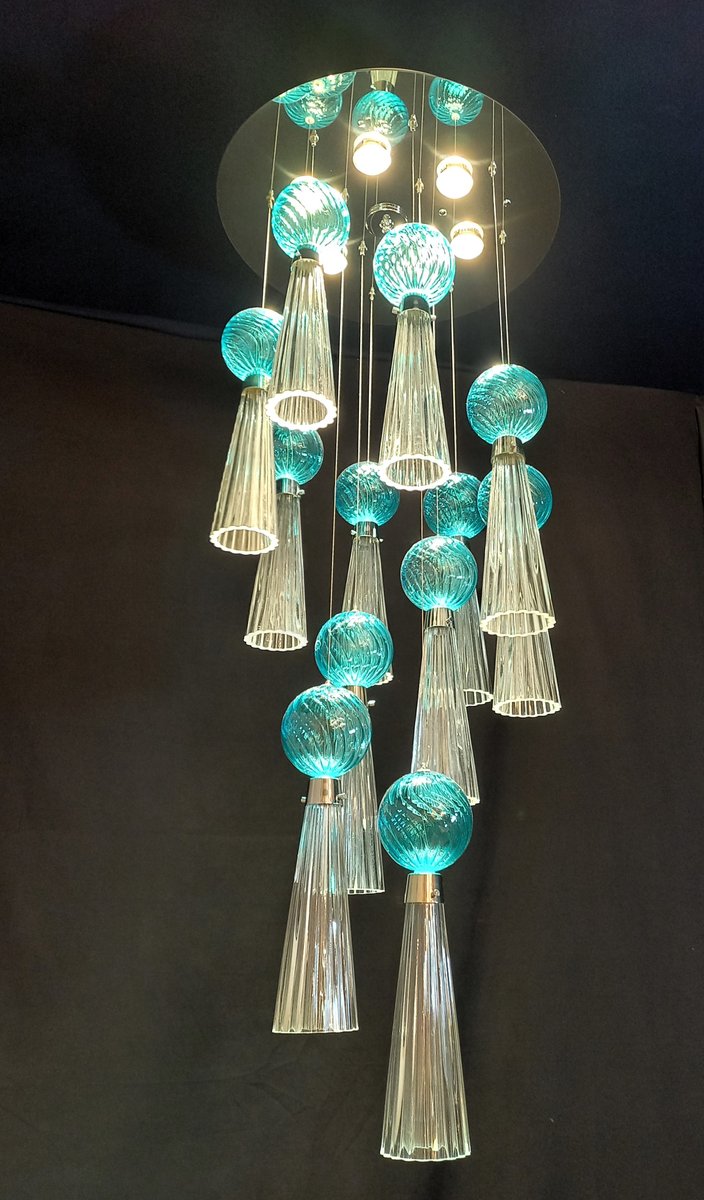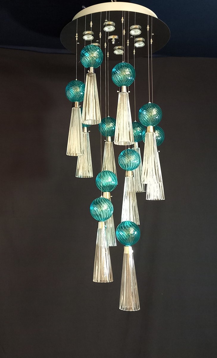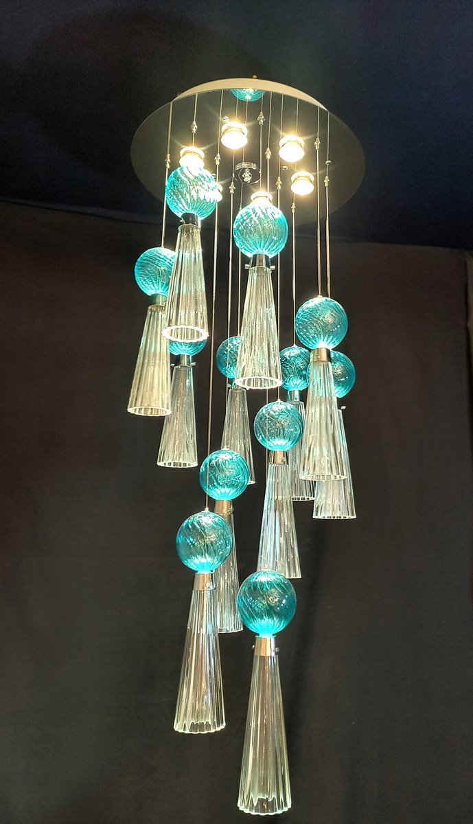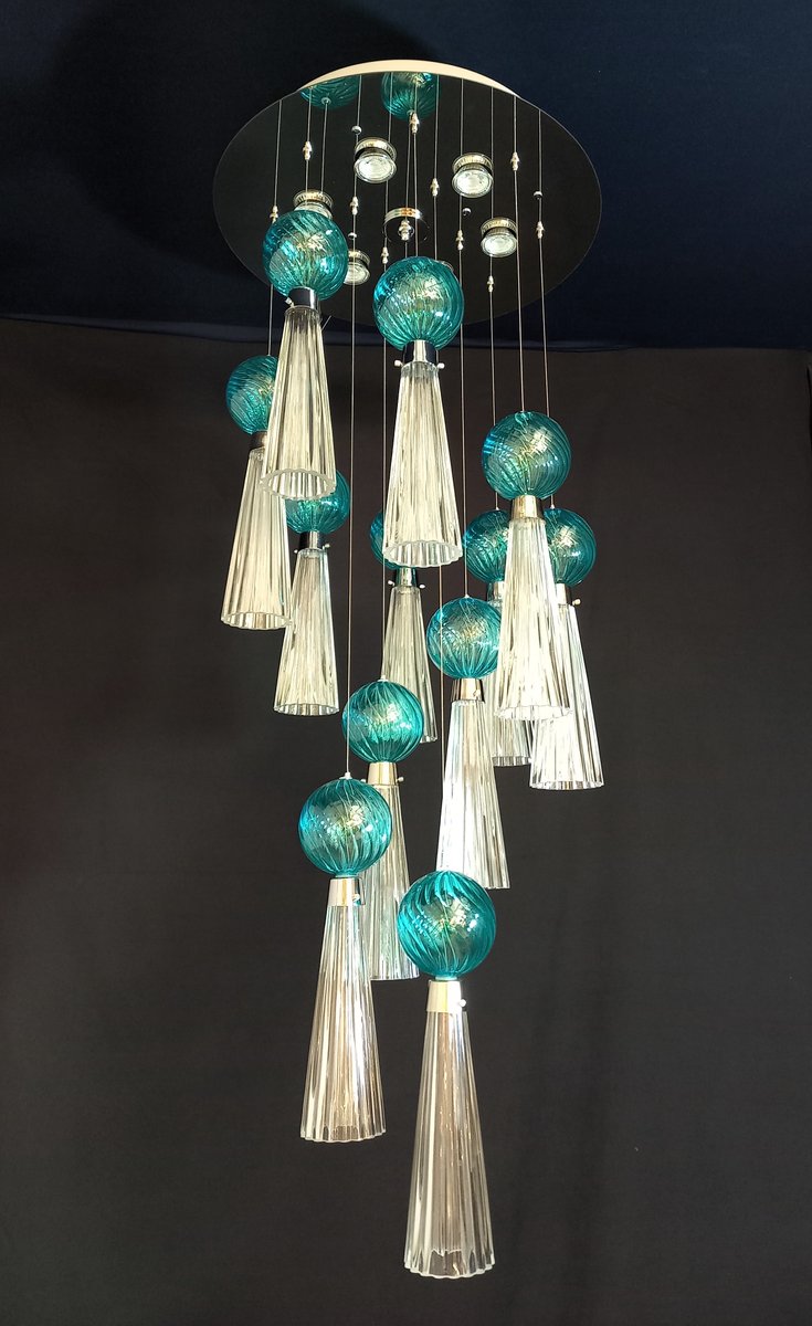 To summarize: Ceiling light composed of a 50 cm diameter steel plate in reflective polished chrome, in which 6 GU10 LED lights are embedded. Twelve steel cables extend from the plate, adjustable up to a length of 150 cm, from which 12 hand-blown Murano glass lamps are securely suspended. These consist of a blown aquamarine blue sphere and a cone-shaped glass with a striped pattern in handmade Murano crystal.
