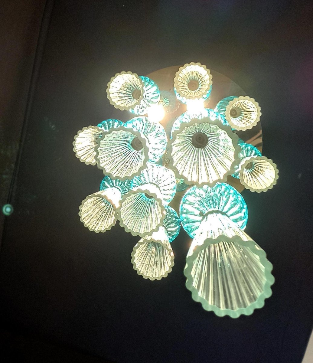 Zusammengefasst: Die Deckenleuchte besteht aus einer Stahlplatte mit einem Durchmesser von 50 cm in reflektierendem, poliertem Chrom, in die 6 GU10 LED-Leuchten eingelassen sind. Von der Platte gehen zwölf Stahlseile aus, die bis zu einer Länge von 150 cm verstellbar sind und an denen 12 Lampen aus mundgeblasenem Muranoglas sicher aufgehängt sind. Diese bestehen aus einer mundgeblasenen aquamarinblauen Kugel und einem kegelförmigen Glas mit Streifenmuster aus handgefertigtem Muranokristall.