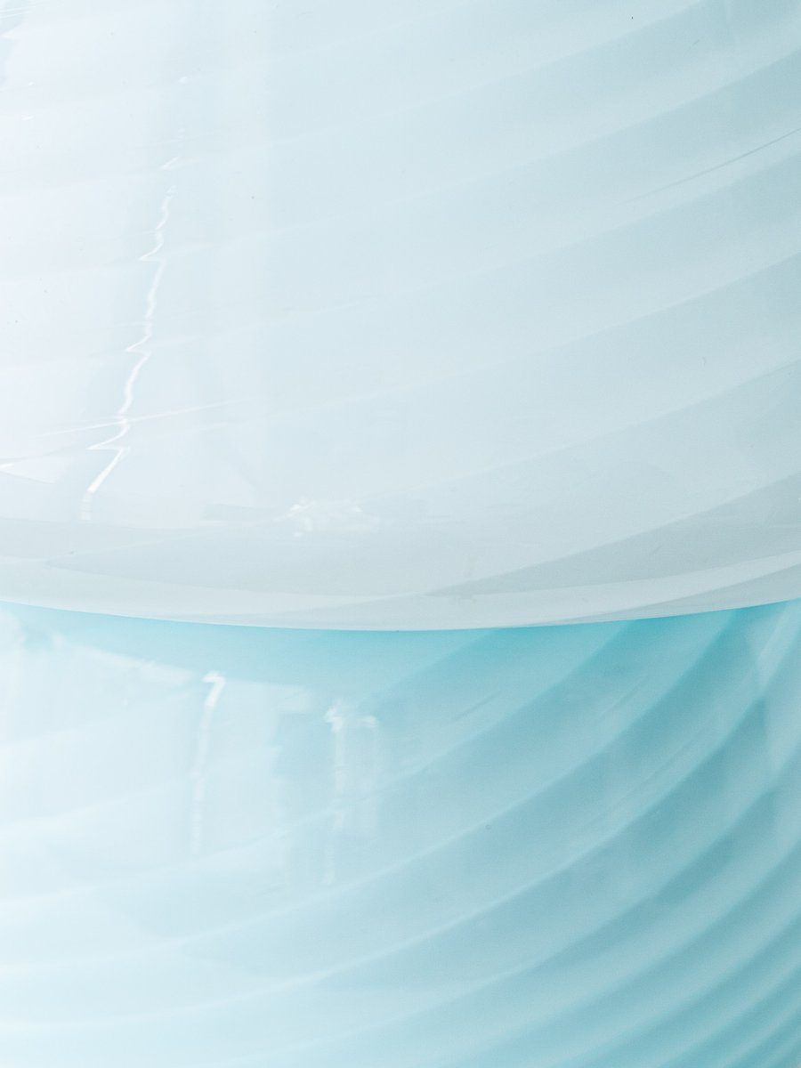 Das Glas ist aus Opalino mit hellblauem, spiralförmigem Rigadin-Dekor gearbeitet, das einen weichen Streifeneffekt erzeugt, der bei Beleuchtung warm leuchtet. Mit einer Höhe von knapp 30 cm eignen sich die Lampen ideal als Nachttisch- oder Akzentbeleuchtung. Ihre skulpturale Präsenz ist im ausgeschalteten Zustand ebenso überzeugend wie im beleuchteten Zustand.