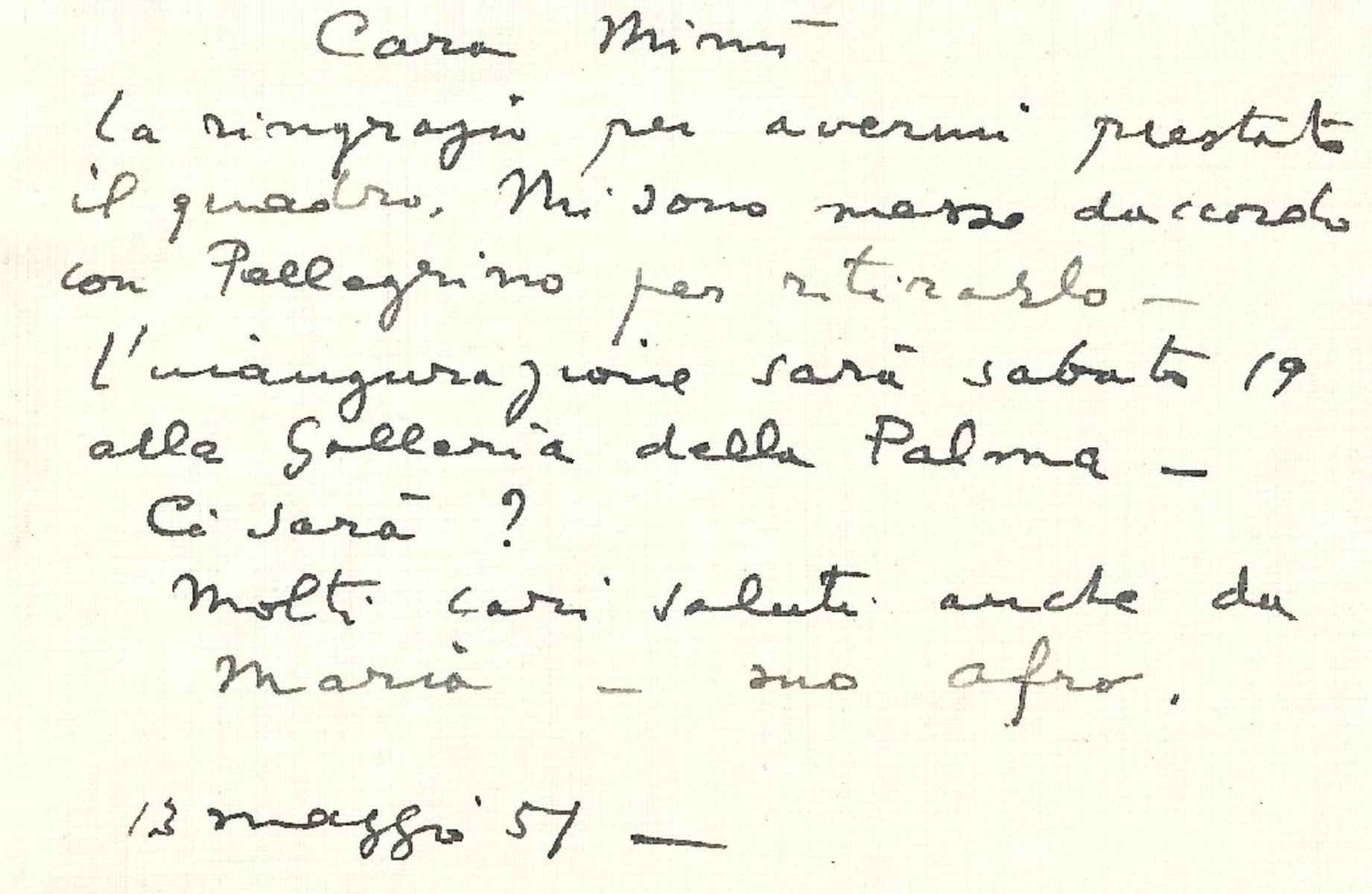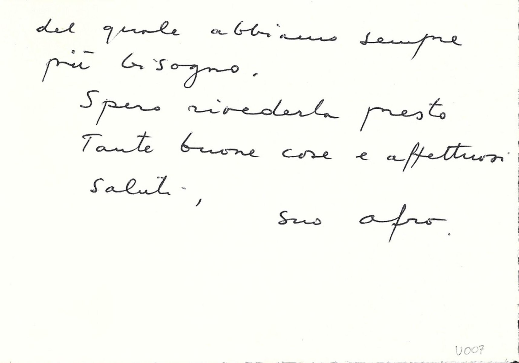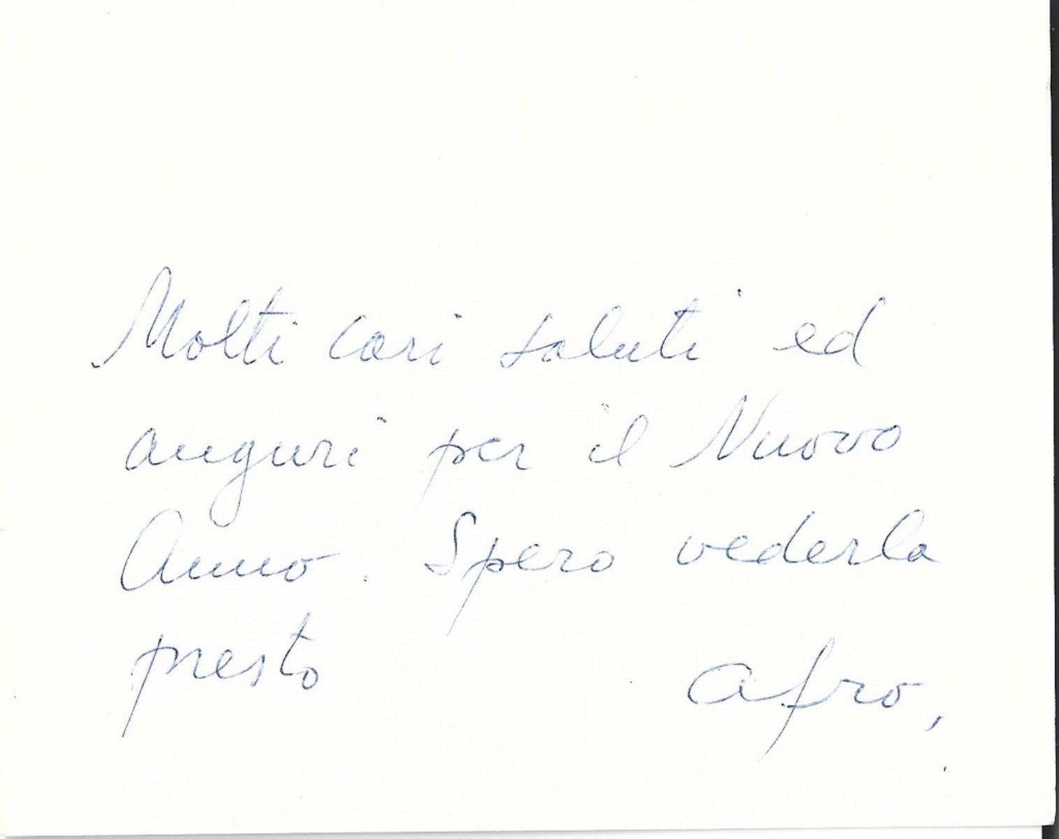 This Lot of Manuscripts by Afro Basaldella to the Countess Anna Laetitia Pecci Blunt is composed by three autograph card written and signed by the Italian artist between 1951 and 1970. In Italian. In perfect condition, with the original envelopes included. In detail: - An Autograph Card of request and invitation Signed. Rome, May 13th 1951. - A Autograph Card Signed. Rome, January 3th 1970. A really touching autograph note of greetings written during the last and precarious health years of the artist: ''Ho ritrovato in questa triste occasione gli amici di un tempo più vicini''. - An Happy New Year Autograph Card Signed. Rome, January 2nd 1967 Afro Libio Basaldella (March 4, 1912 – July 24, 1976) Afro Libio Basaldella, generally known by the single name Afro. was an Italian painter in the post-war period, working together with Alberto Burri and Lucio Fontana, and beginning as a member of the Scuola Romana.