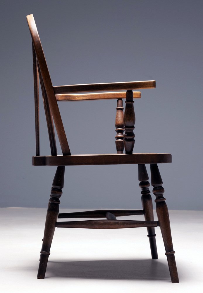 Each armchair features a turned spindle backrest, shaped solid seat, and gracefully curved arms, reflecting the workmanship associated with the furniture-making workshops of High Wycombe, England — the historic center of Windsor chair production.