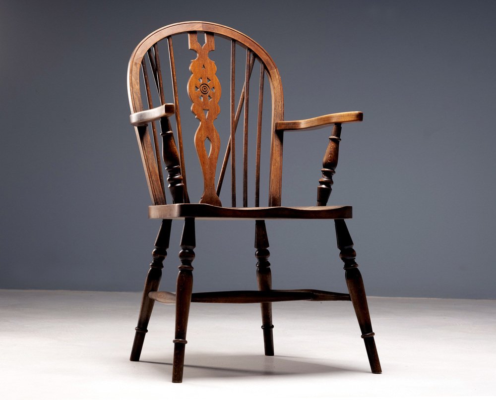 A pair of Victorian Windsor-style armchairs crafted from oak and elm, dating to around 1870. These chairs embody the classic English tradition of Windsor craftsmanship, celebrated for its timeless balance of elegance, comfort, and structural integrity.