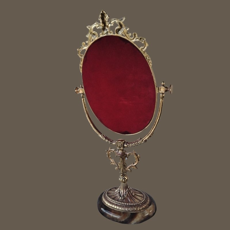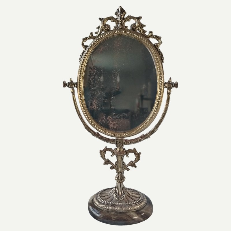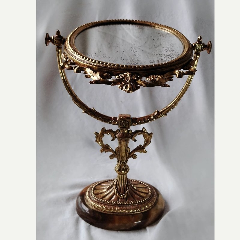 The mirror is fully functional, and the marble base is free of cracks or chips, retaining its brilliance and solidity.