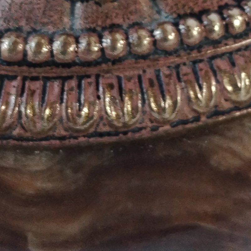 Der Bronzerahmen weist Patina auf, die typisch für die natürliche Oxidation ist, mit dunklen Tönen, die dem Stück einen einzigartigen Charakter verleihen und seine Geschichte unterstreichen.