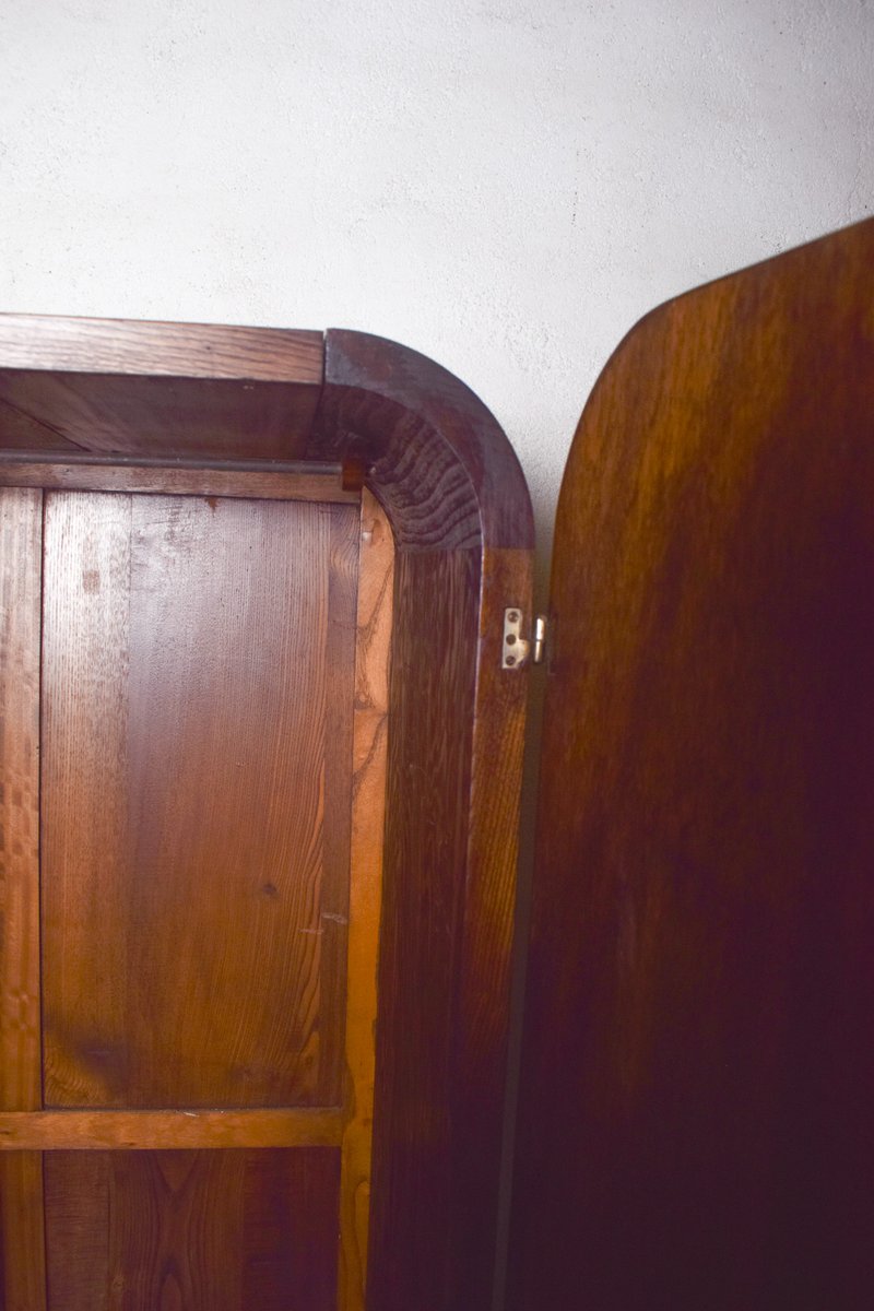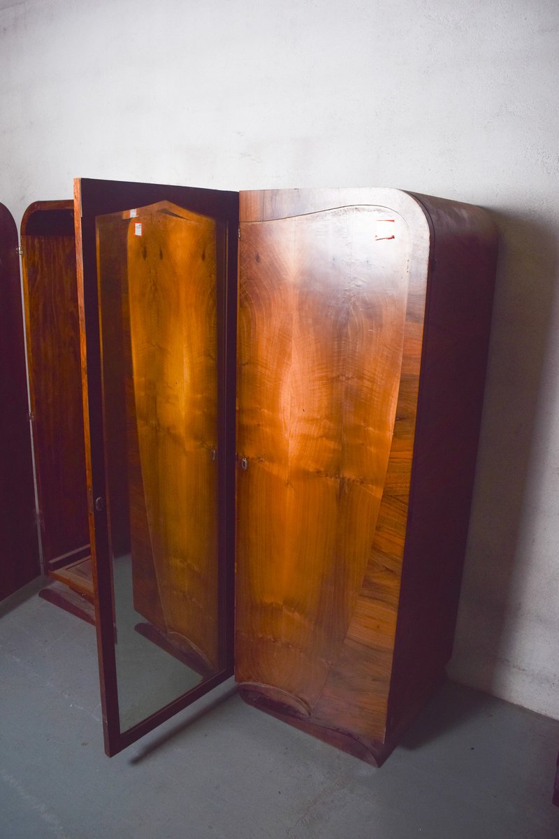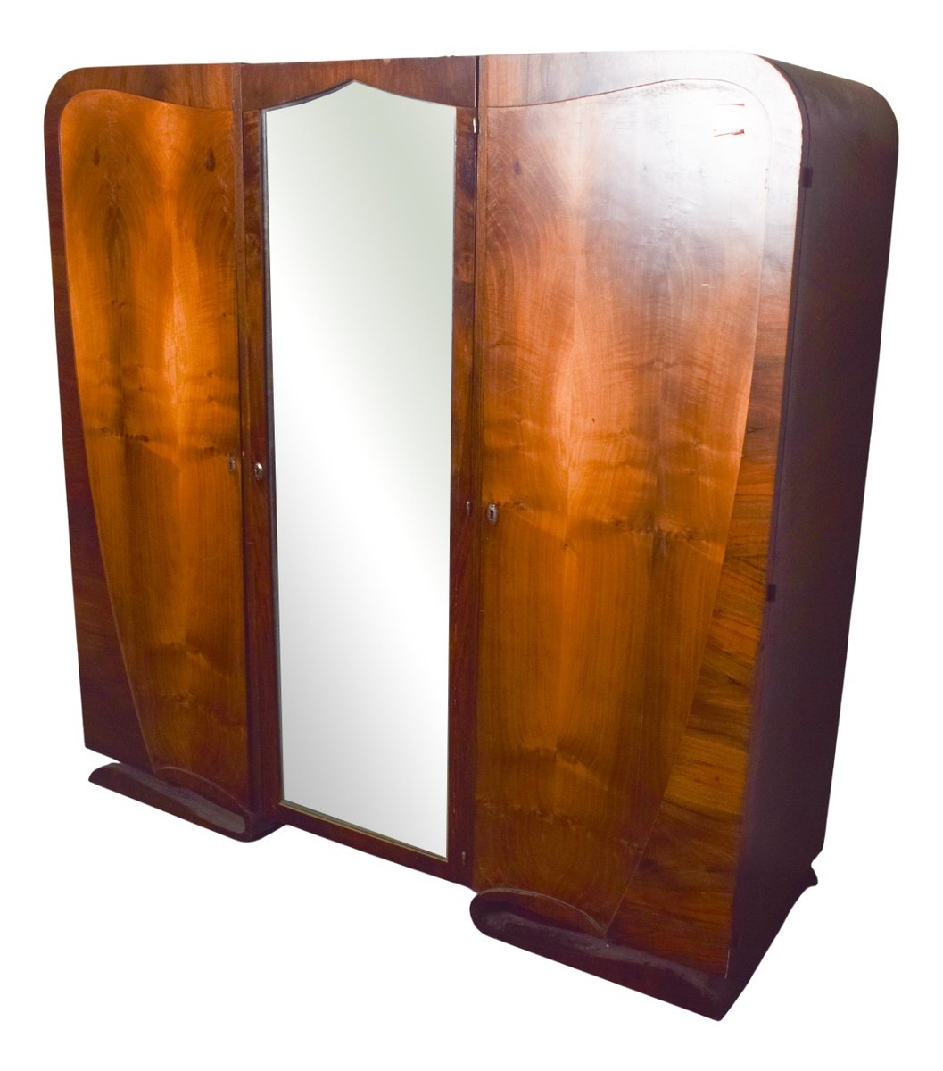 This elegant Art Deco wardrobe, crafted in walnut, reflects the clean lines and refined style of the early 20th century. It features three doors, with the central one fitted with a tall mirror that adds both practicality and sophistication, while also enhancing the sense of space in a room. The warm walnut veneer highlights the natural grain of the wood, giving the piece depth and richness. The design is simple yet stylish, with subtle geometric accents characteristic of the Deco period.