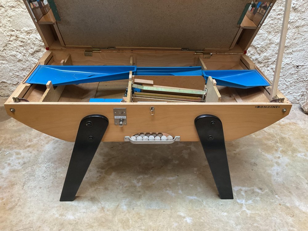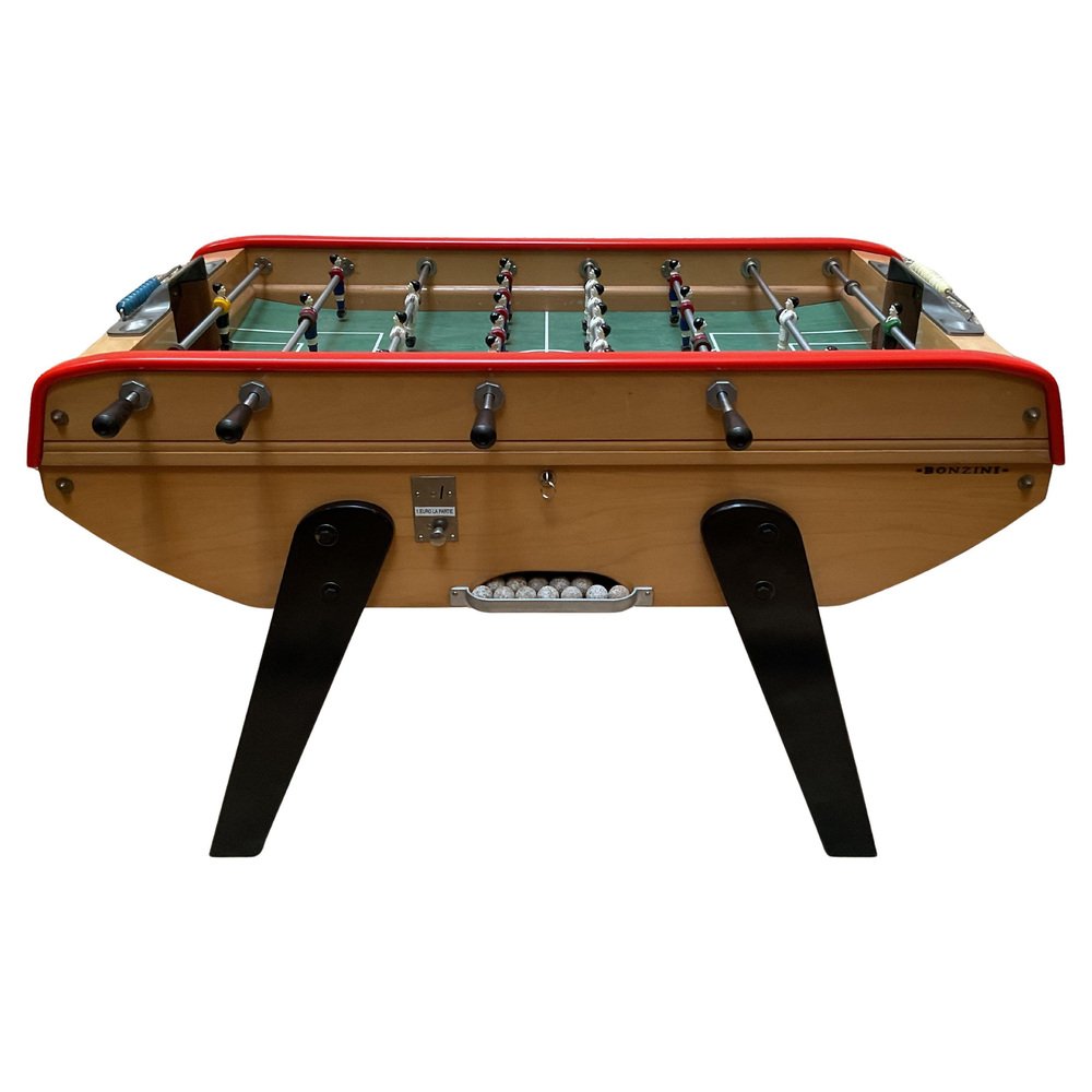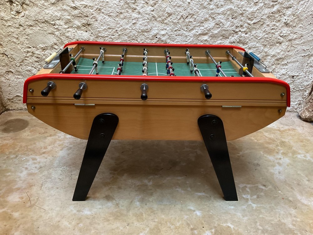 Rare Bonzini B60 “El Clásico” edition foosball table, a special collectible version celebrating the legendary rivalry between Futbol Club Barcelona and Real Madrid. Handcrafted in France by Bonzini, the renowned manufacturer known for its superior babyfoot tables since 1927, this limited edition model features custom team colors and player details representing the two Spanish football giants. This table is numbered 111163, dating from around 2007–2008, according to Bonzini’s production records. Built with Bonzini’s signature solid wood cabinet, chrome accents, and precision steel rods, it delivers professional-level playability and durability. In excellent original condition, showing only light wear consistent with age and use, the table preserves its authentic finish and components. A perfect centerpiece for sports memorabilia collectors, design enthusiasts, or vintage gaming aficionados, blending craftsmanship with football heritage. Model: Bonzini B60 “Babyfoot El Clásico” Serial No.: 111163 (circa 2007–2008) Theme: FC Barcelona vs Real Madrid Dimensions: 150 D × 100 W × 95 H cm Materials: Wood, Metal, Rubber