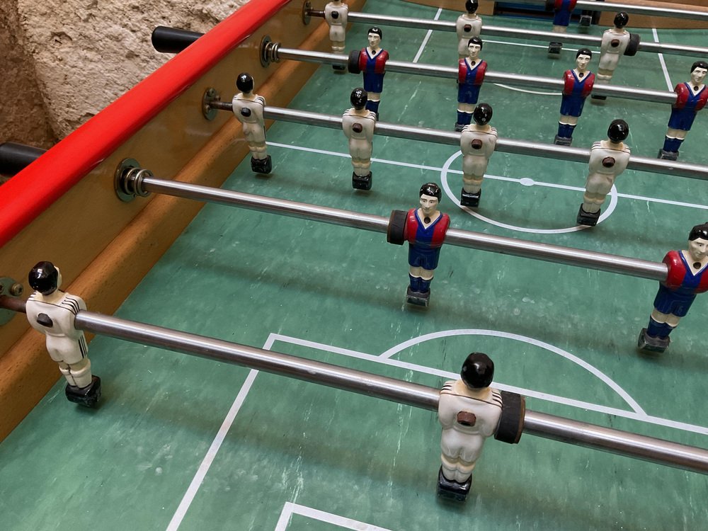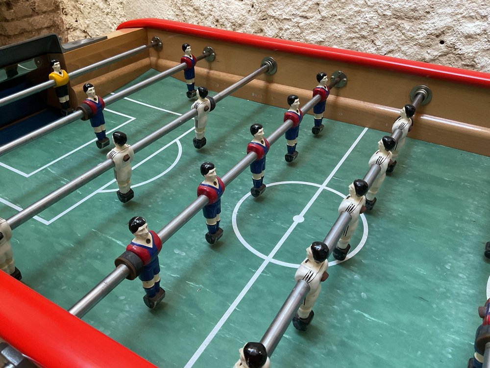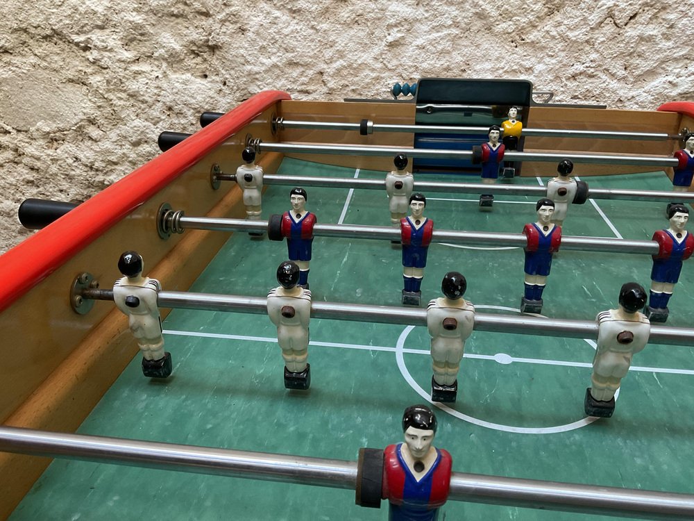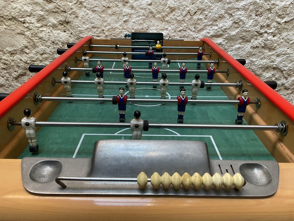 Seltener Bonzini B60 "El Clásico"-Edition-Kickertisch, eine spezielle Sammlerversion zur Feier der legendären Rivalität zwischen dem Futbol Club Barcelona und Real Madrid. Handgefertigt in Frankreich von Bonzini, dem renommierten Hersteller, der seit 1927 für seine hochwertigen Babyfoot-Tische bekannt ist, weist dieses Modell in limitierter Auflage individuelle Teamfarben und Spielerdetails auf, die die beiden spanischen Fußballgiganten repräsentieren. Dieser Tisch trägt die Nummer 111163 und stammt laut den Produktionsunterlagen von Bonzini aus den Jahren 2007-2008. Mit dem für Bonzini typischen Massivholzgehäuse, verchromten Akzenten und Präzisionsstahlstangen bietet er Spielbarkeit und Haltbarkeit auf professionellem Niveau. Der Tisch befindet sich in einem ausgezeichneten Originalzustand und weist nur leichte alters- und gebrauchsbedingte Abnutzungserscheinungen auf, wobei die authentische Oberfläche und die Komponenten erhalten sind. Er ist das perfekte Schmuckstück für Sammler von Sportmemorabilien, Designliebhaber oder Liebhaber von Vintage-Spielen und verbindet Handwerkskunst mit dem Erbe des Fußballs. Modell: Bonzini B60 "Babyfoot El Clásico" Serien-Nr.: 111163 (ca. 2007-2008) Thema: FC Barcelona gegen Real Madrid Abmessungen: 150 T × 100 B × 95 H cm Materialien: Holz, Metall, Gummi