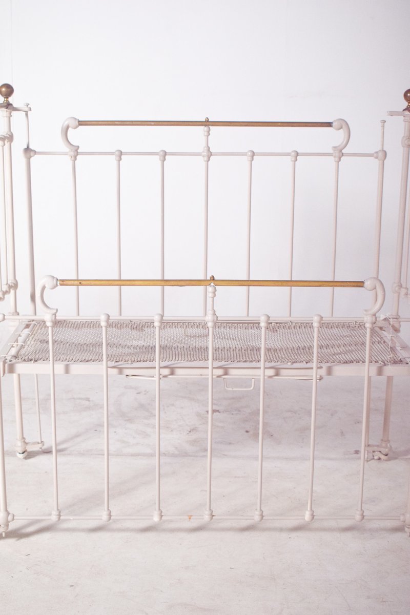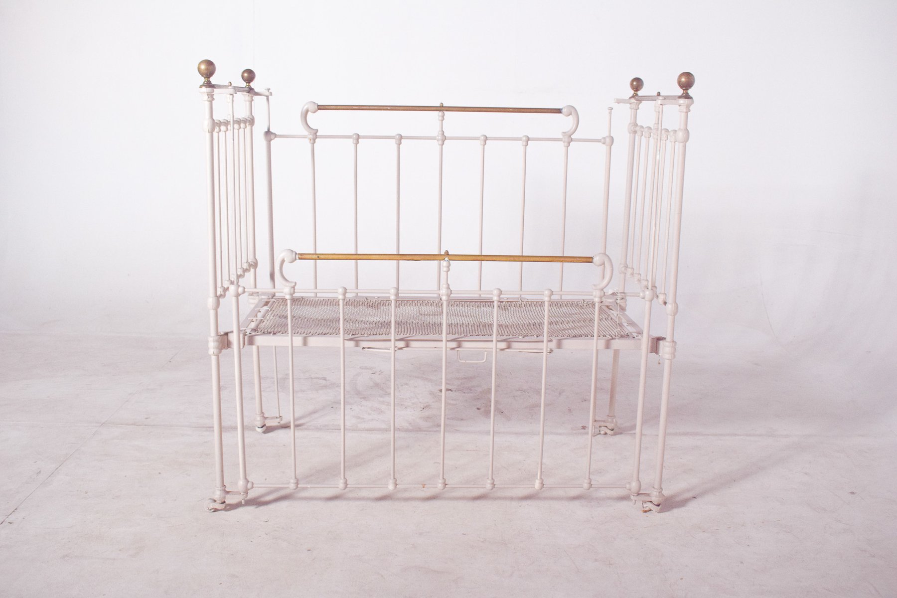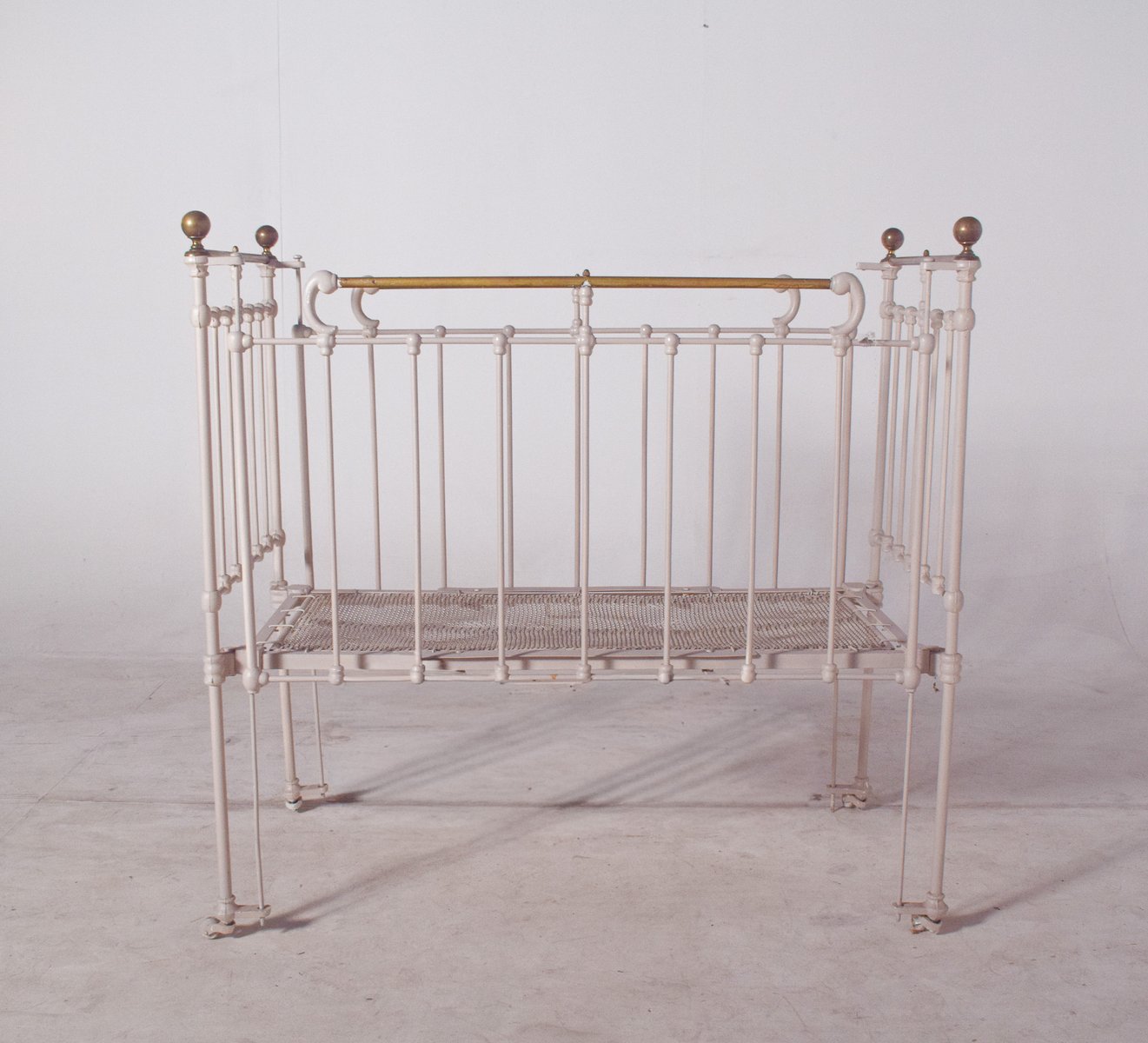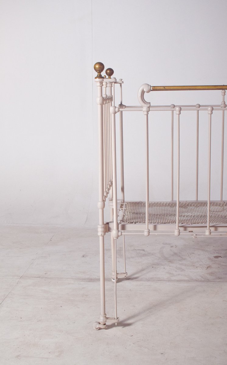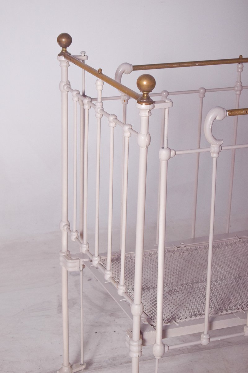 Dieses bezaubernde Vintage-Babybett ist aus robustem Eisen gefertigt und wunderschön weiß lackiert, was ihm einen weichen, zeitlosen Look verleiht. Die Struktur weist zarte Messingakzente auf, darunter abgerundete Endstücke und Stäbe, die einen Hauch von Eleganz und Raffinesse verleihen. Mit seinen komplizierten Metallarbeiten und seinem langlebigen Design spiegelt dieses Kinderbett die Qualität und den Stil der Handwerkskunst des frühen 20. Jahrhunderts wider. Auf kleinen Rädern ruhend, ist es sowohl praktisch als auch dekorativ, ideal für Sammler antiker Kinderzimmermöbel oder als einzigartiges Einzelstück in einem Interieur im Vintage-Stil.