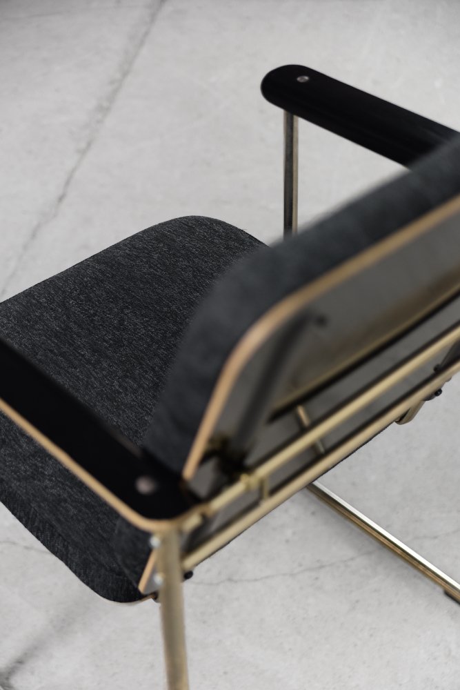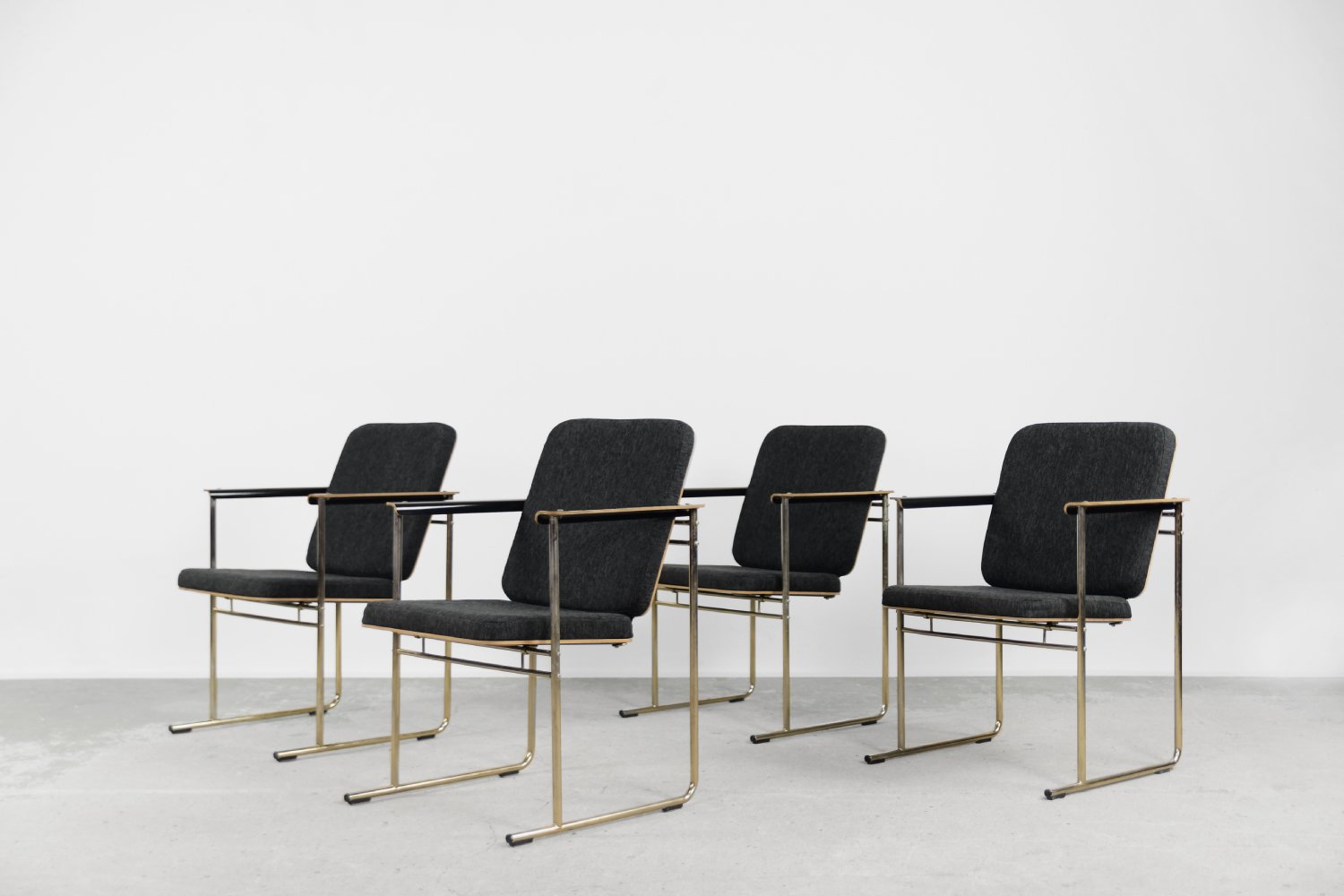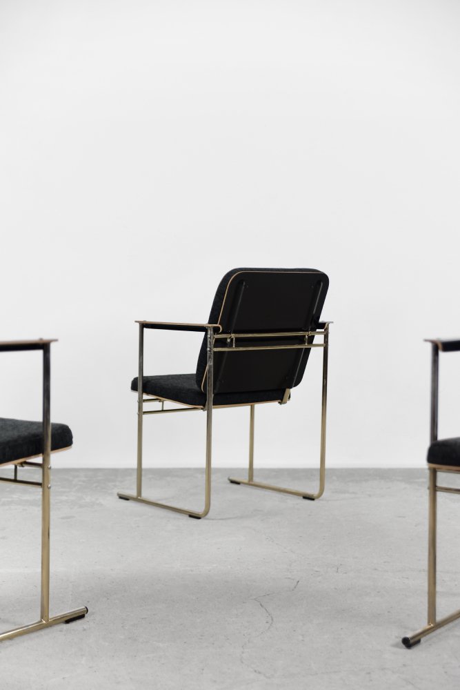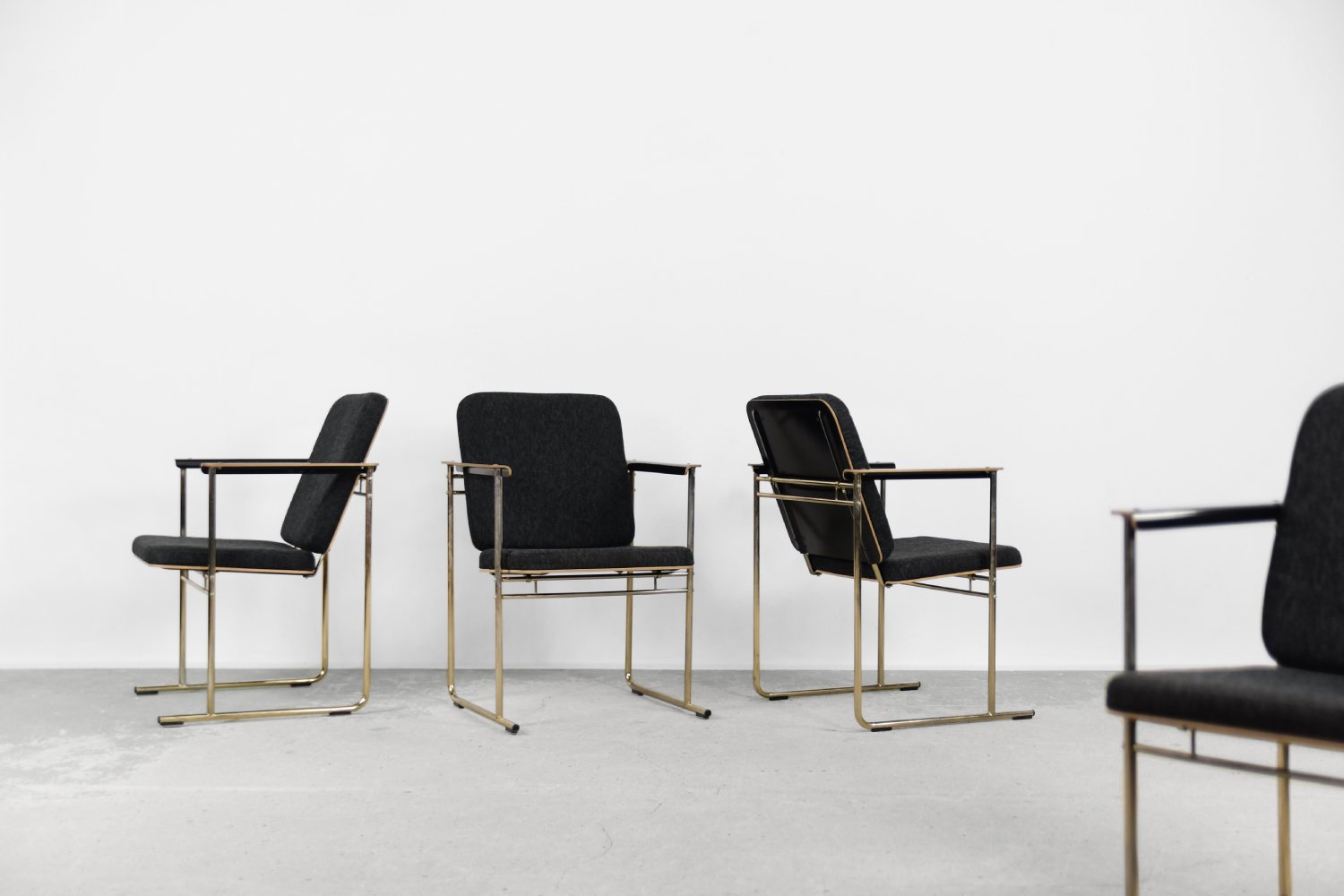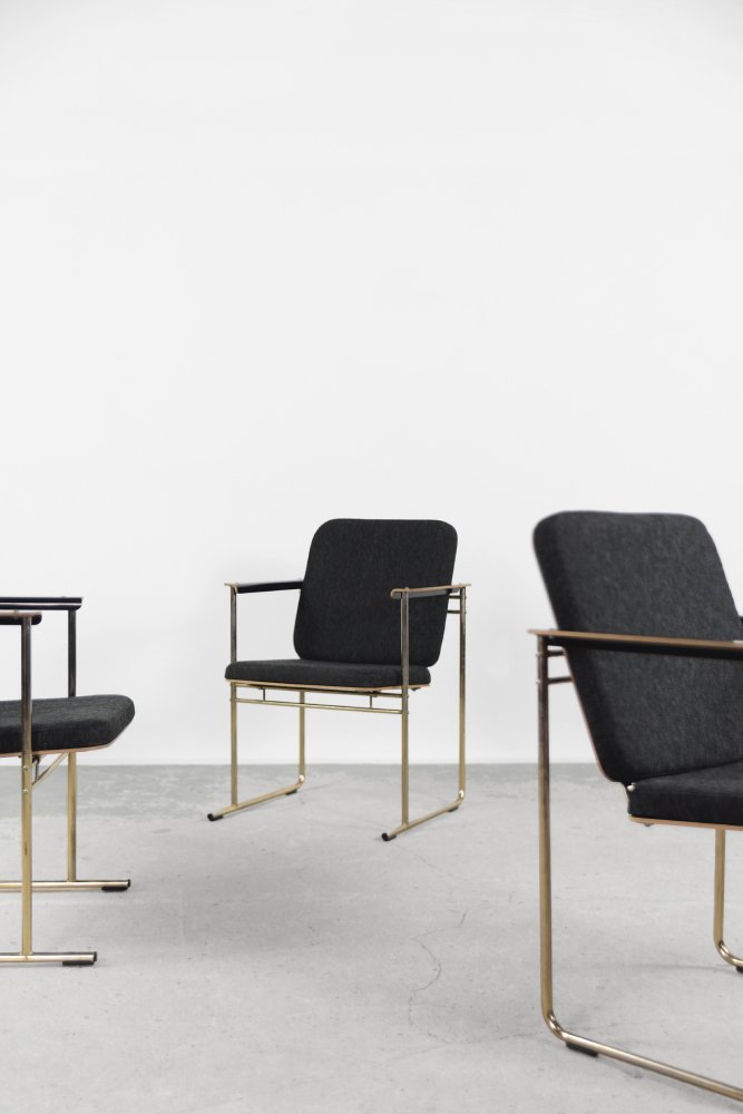 This set of four Skaala chairs was designed by Yrjö Kukkapuro for the Finnish Avarte manufacture during the 1980s. Due to their modern and minimal look, they will easily find their place in the living room or office. The Skaala chair perfectly reflects Kukkapuro's love for ergonomic furniture. This innovative combination of aesthetics and functionality refers to idea from Bauhaus shool. The frame is made of chrome-plated goldish metal. The seat and backrest are upholstered with high-quality gray fabric, and additional armrests are made of birch plywood.