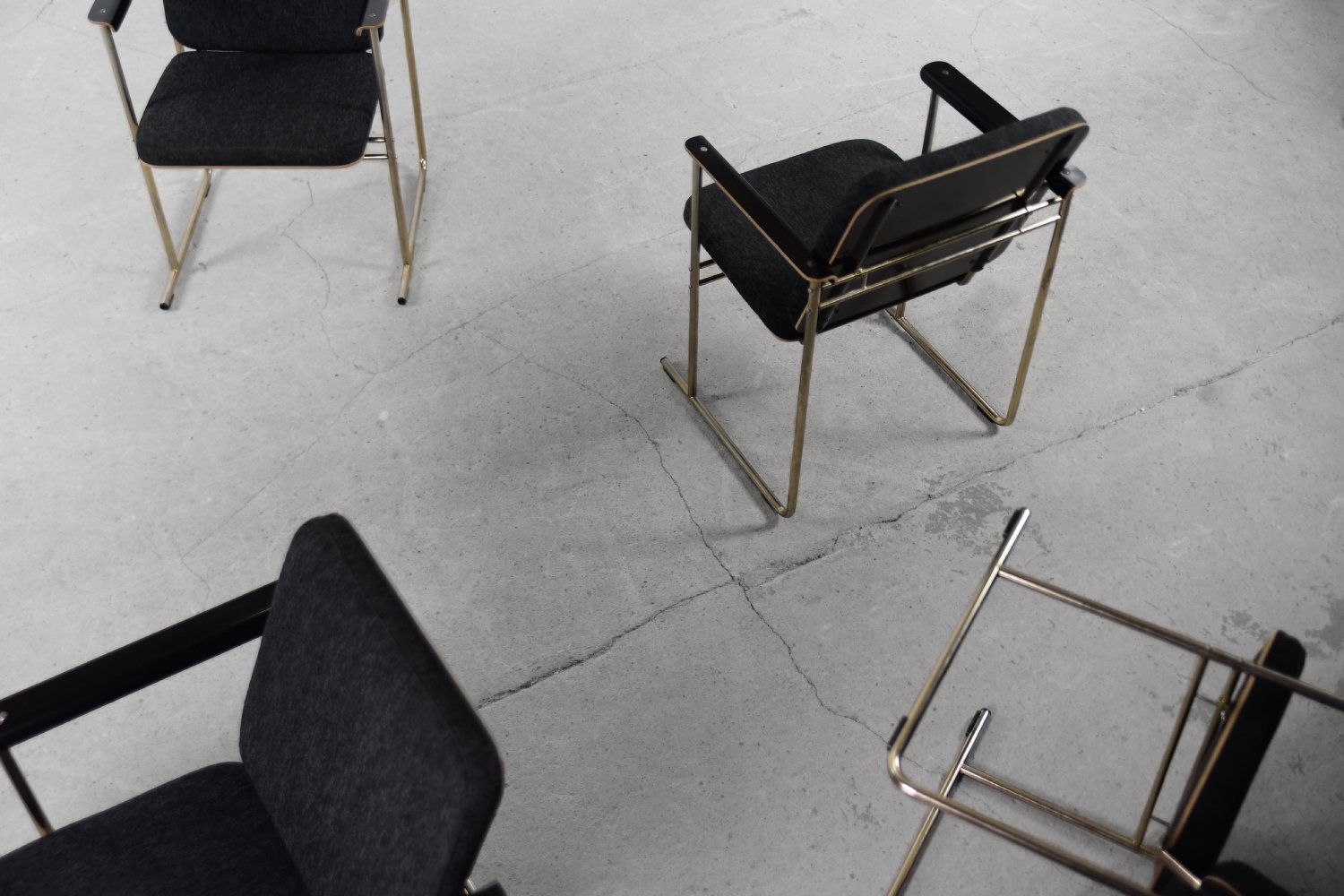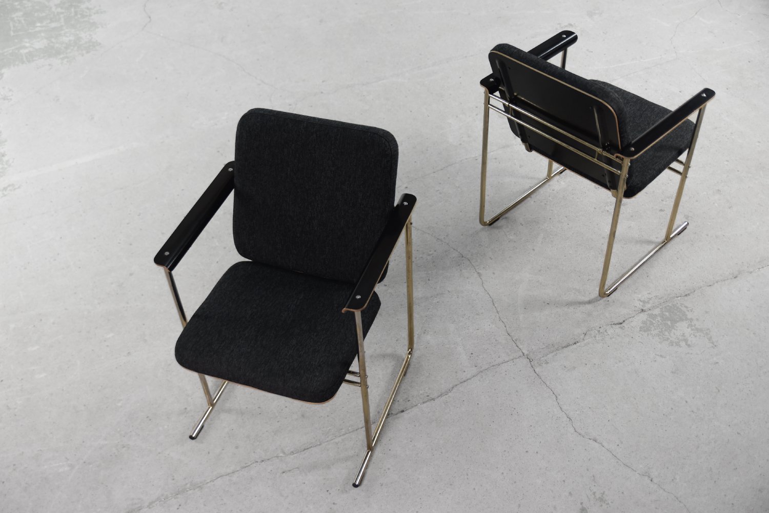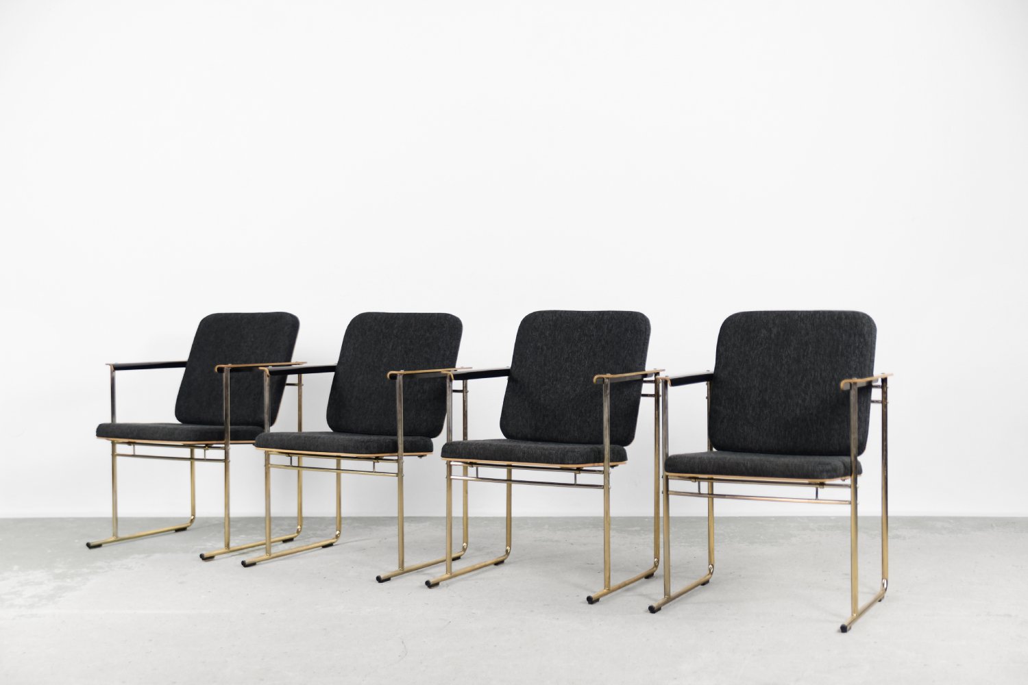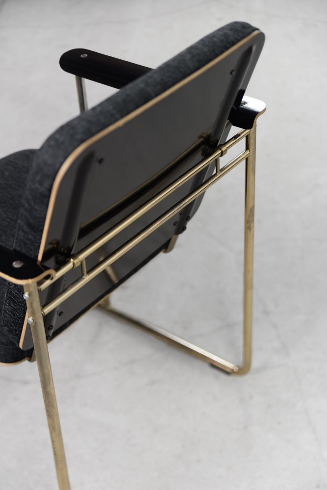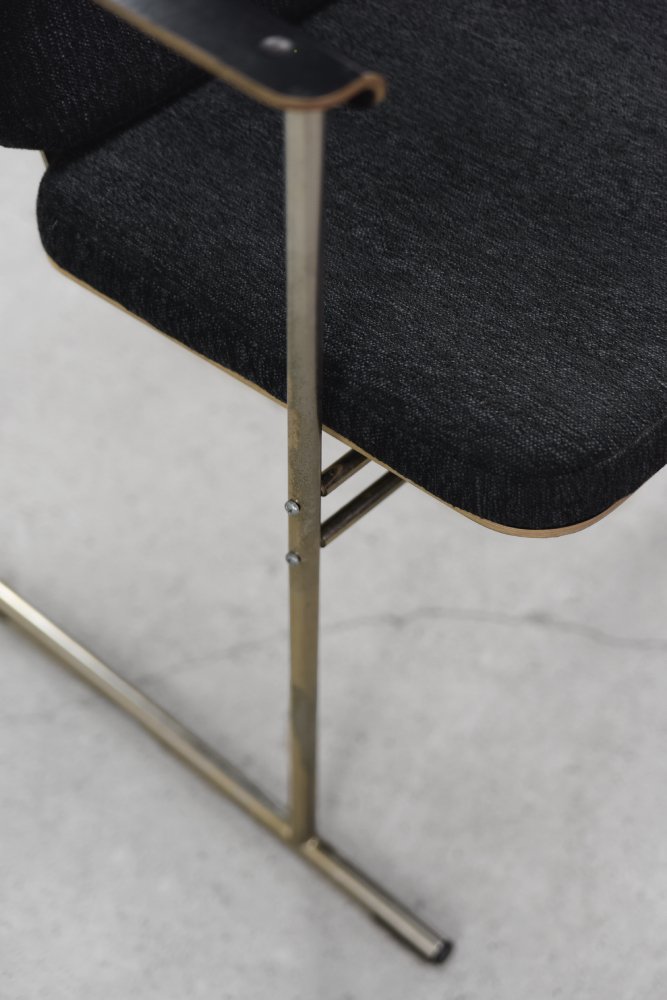 This set of four Skaala chairs was designed by Yrjö Kukkapuro for the Finnish Avarte manufacture during the 1980s. Due to their modern and minimal look, they will easily find their place in the living room or office. The Skaala chair perfectly reflects Kukkapuro's love for ergonomic furniture. This innovative combination of aesthetics and functionality refers to idea from Bauhaus shool. The frame is made of chrome-plated goldish metal. The seat and backrest are upholstered with high-quality gray fabric, and additional armrests are made of birch plywood.