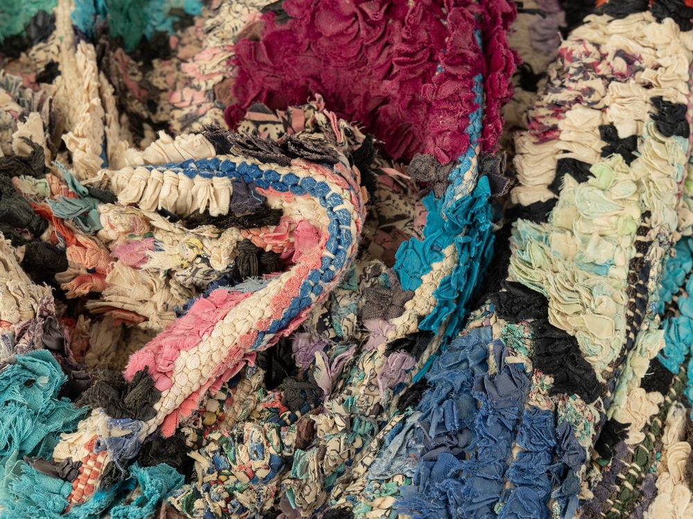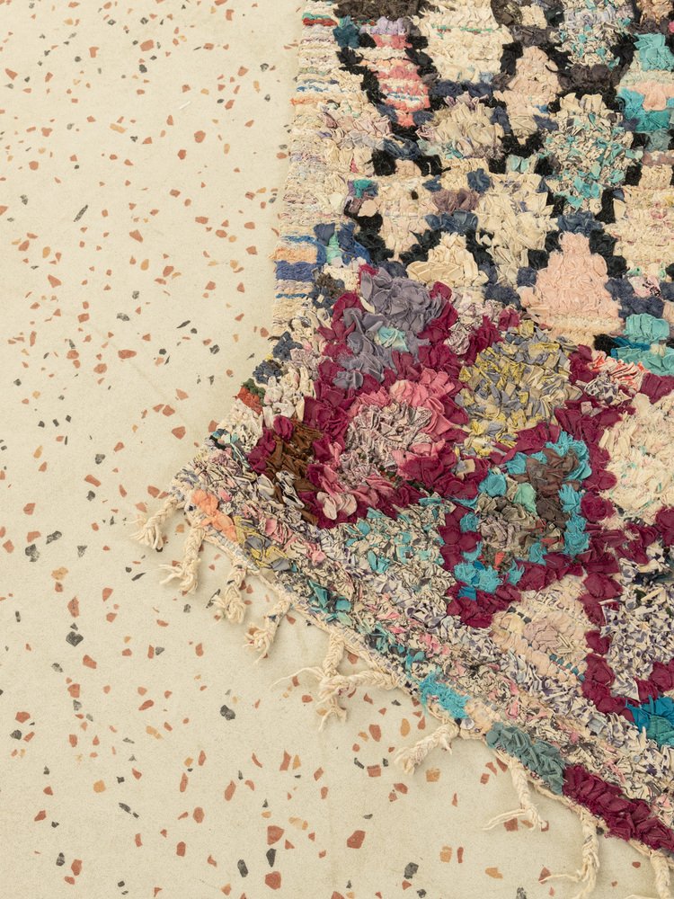 Dieser Boucherouite ist ein Vintage Berber Teppich, der zu 100% aus recycelter Kleidung und Stoffresten besteht – weich und gemütlich unter den Füßen. Unsere Berber Teppiche sind handgeknüpft, ein Knoten nach dem anderen. Jeder Berber Teppich ist ein langlebiges Unikat, nachhaltig hergestellt mit regionalen Materialien.