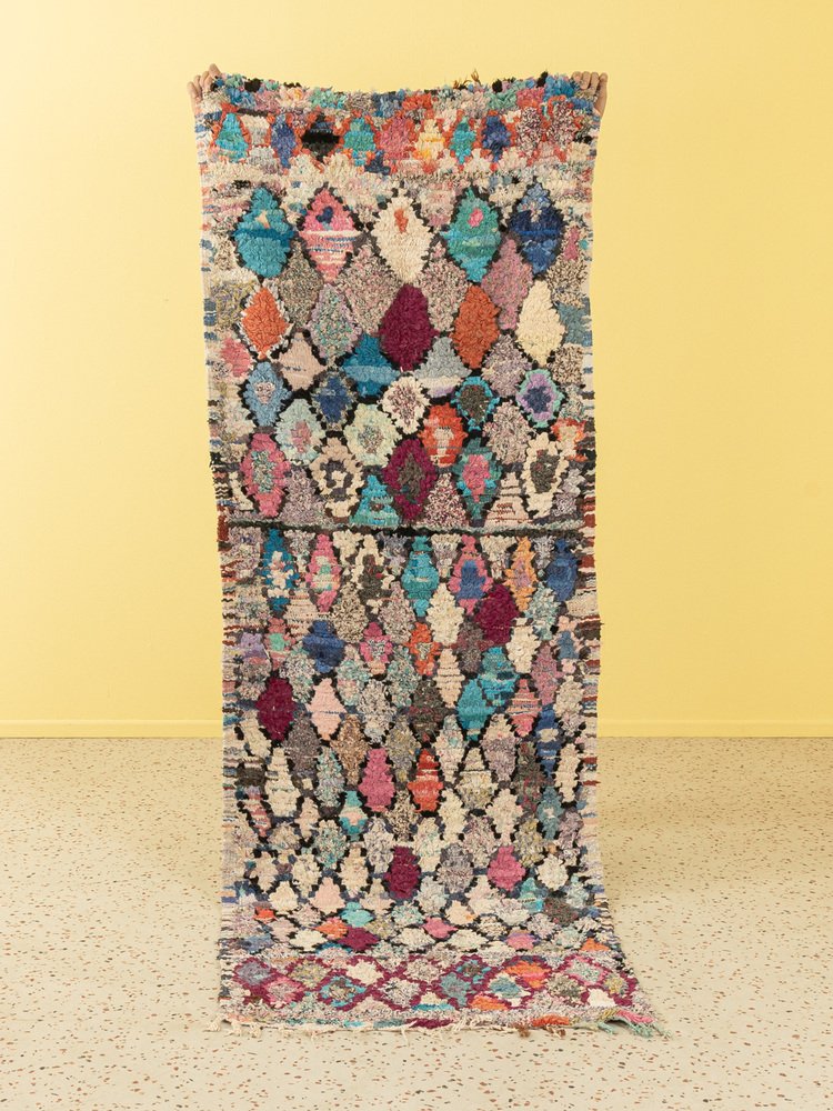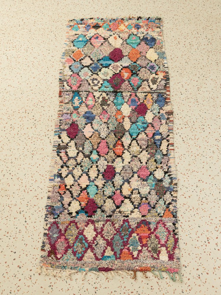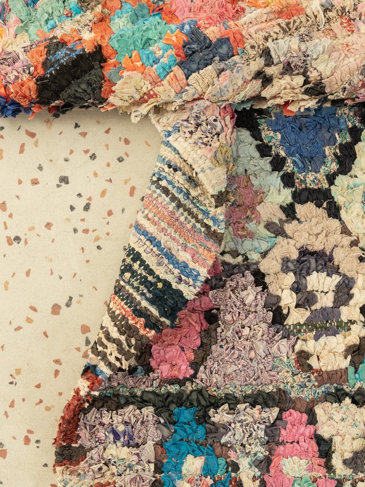 This Boucherouite is a vintage Berber rug made from 100% recycled clothing and fabric scraps - soft and cozy underfoot. Our Berber rugs are hand knotted, one knot at a time. Each Berber rug is a long-lasting unique piece, sustainably made with regional materials.