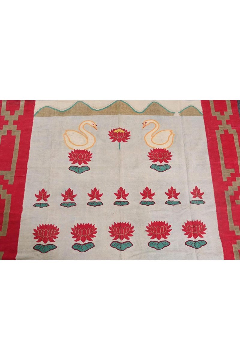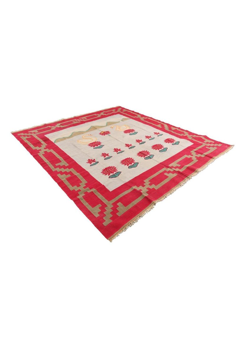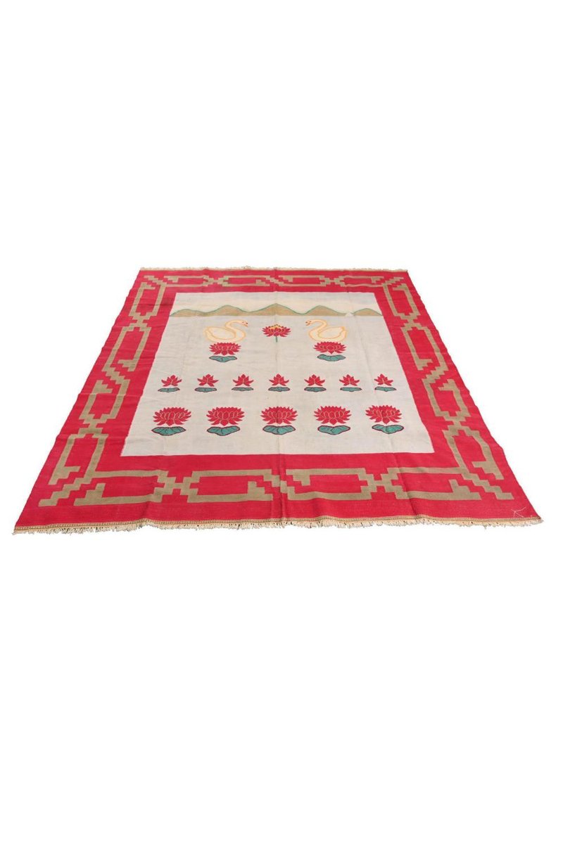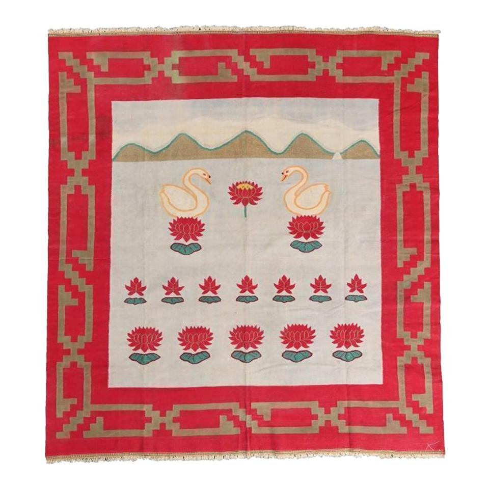 Vintage Dhurrie Flachgewebe in Rot und Blau mit Schwanenbildern von Rug&Kilim, 1950er