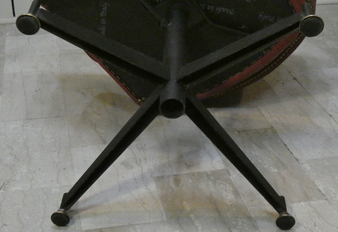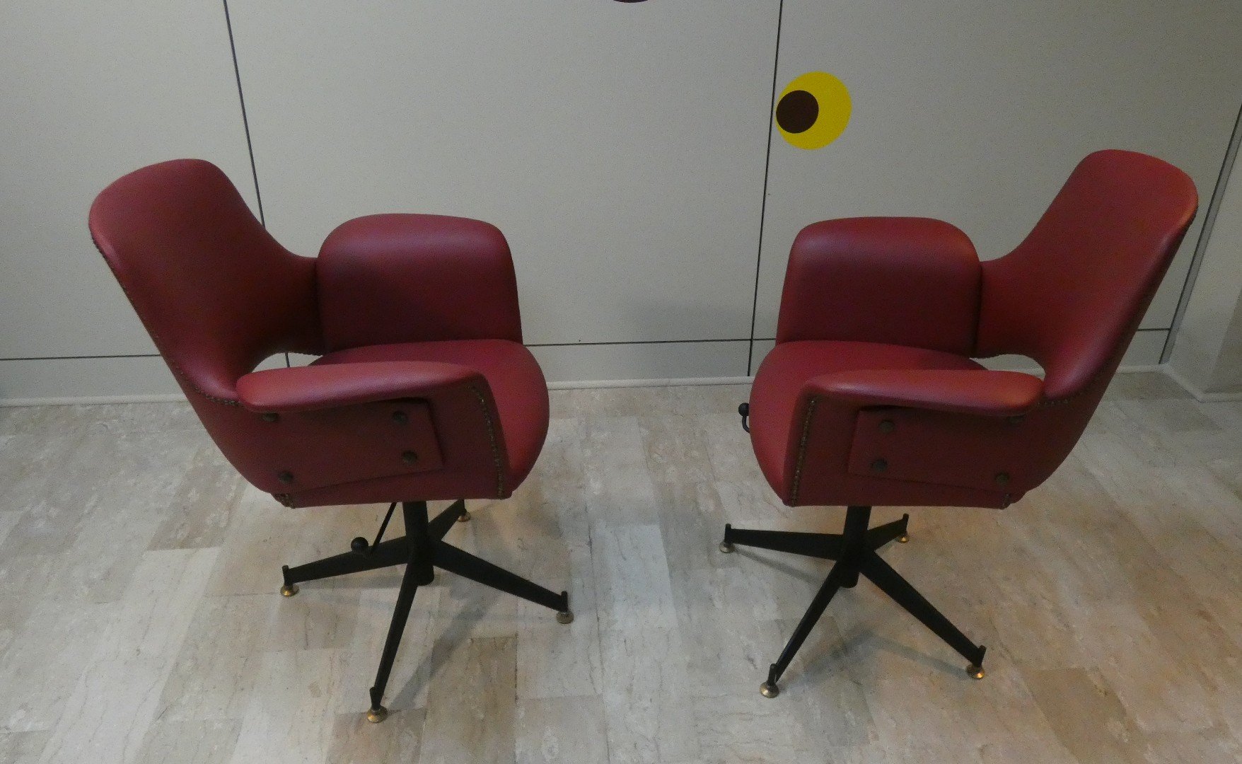 Wunderschöne Sessel aus den 1960er Jahren, vollständig restauriert, mit burgunderroter Polsterung und Messingnieten. Diese Stühle zeichnen sich durch einen zarten Stil, ein lineares Design und eine einladende Form aus. Die umhüllende Rückenlehne und die geschwungenen Armlehnen umschmeicheln die Figur und bieten Komfort. Das Gestell mit vier Speichen und Messingfüßen verleiht dem Sessel eine leichte, elegante Ausstrahlung und ist ein Markenzeichen der damaligen Zeit. Der Sessel ist um 360° drehbar, und dank einer speziellen Stange unter der Sitzfläche kann diese Drehung bis zum völligen Stillstand begrenzt werden. Die Rückenlehne umschließt den gesamten Sessel und endet unter den Armlehnen, so dass ein Seitenhalt entsteht... Diese Form verleiht Solidität und zeugt von Liebe zum Detail. Ein zeitloser Sessel, ideal für die stilvolle Einrichtung des Wohnzimmers oder für ein elegantes Arbeitszimmer oder Wartezimmer.