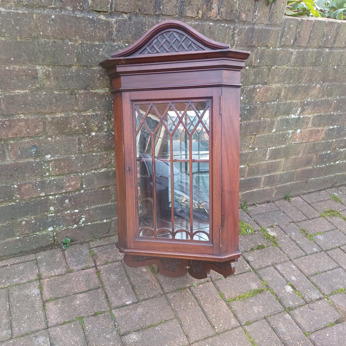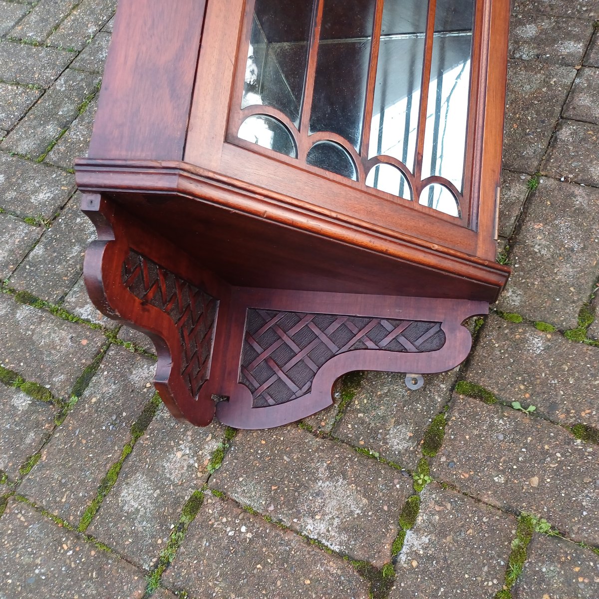 The intricate crisscross fretwork adorns the rounded top and lower sections of the cupboard. This elegant yet subtle design enhances the overall aesthetics, blending seamlessly with the beautifully detailed door.