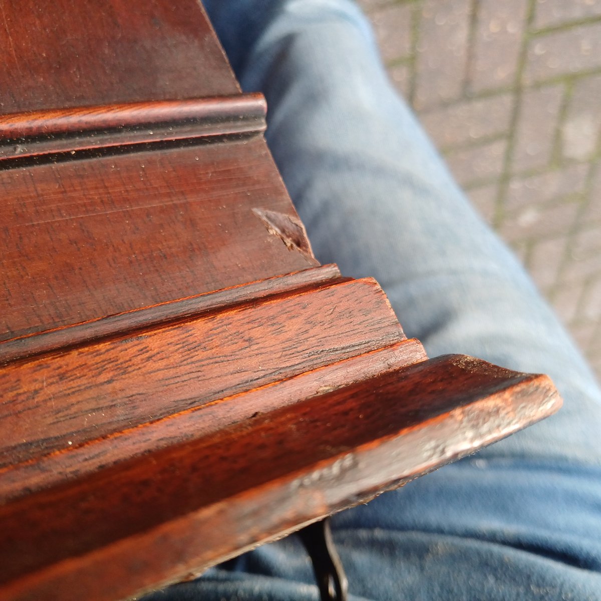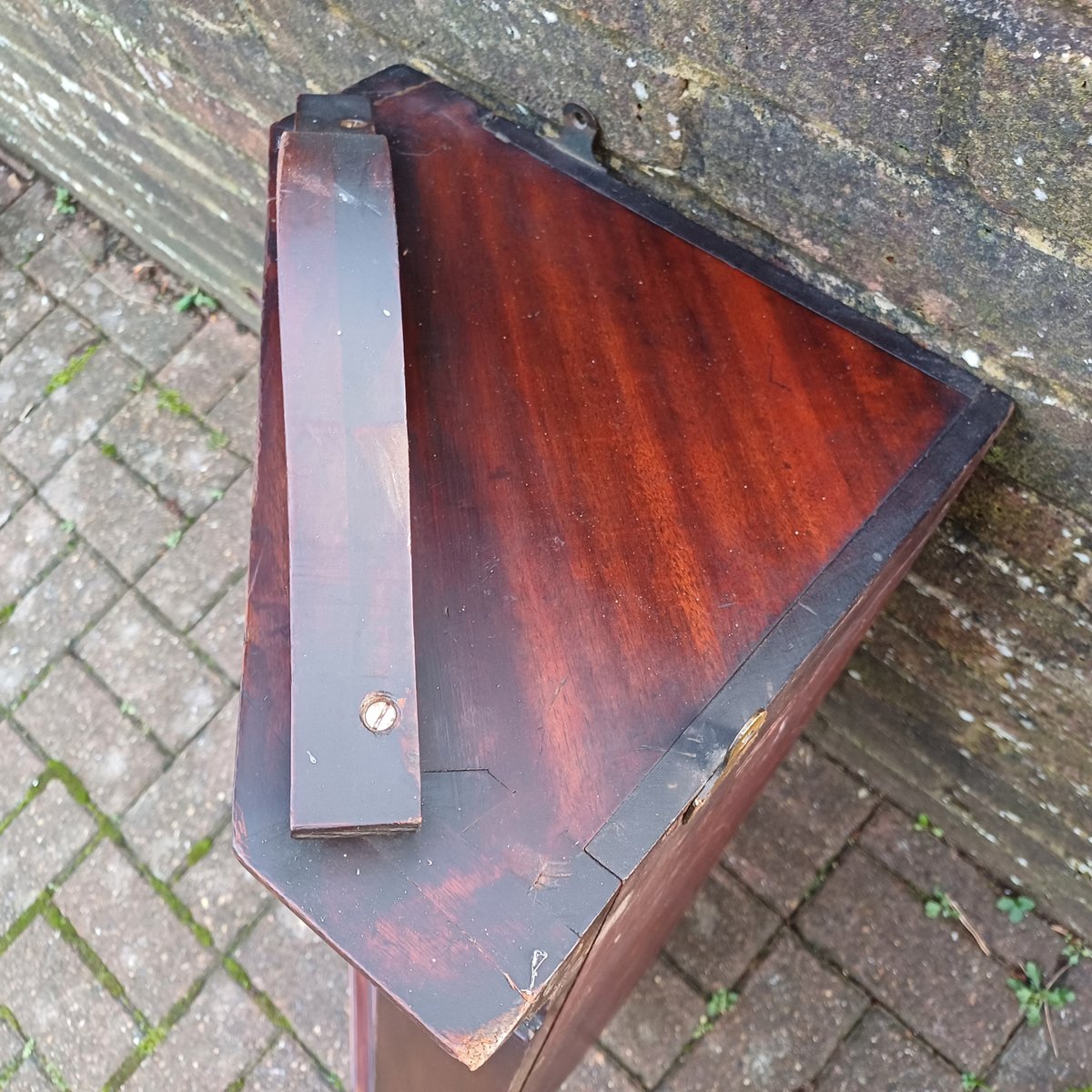 Das tiefe Gesims sorgt für einen zusätzlichen optischen Effekt. Die beiden Seitenteile weisen leichte Anzeichen früherer Reparaturen auf, wobei der obere Teil irgendwann einmal neu verleimt wurde.