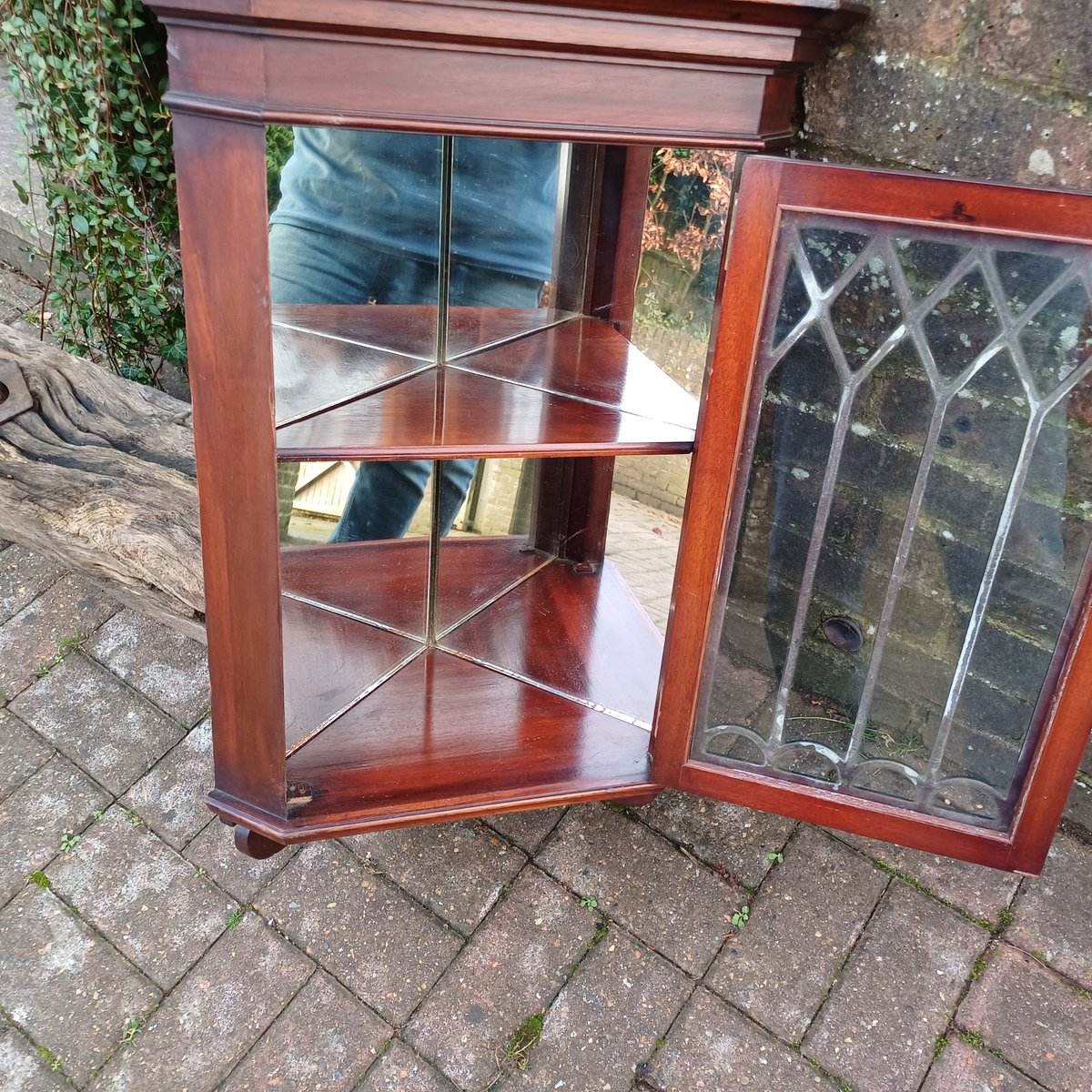 Die Rückseite dieses Eckschranks besteht aus zwei dicken, breiten Holzbrettern, ein seltenes Merkmal bei Stücken dieser Qualität. Diese robuste Rückwand wurde wahrscheinlich zum Schutz der beiden Spiegel im Inneren des Schranks entworfen, die für mehr Tiefe sorgen und die Präsentation der darin aufbewahrten Gegenstände verbessern.