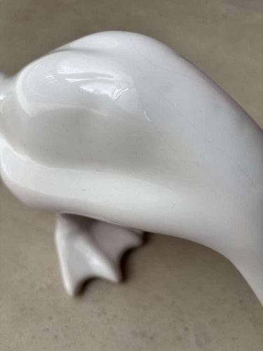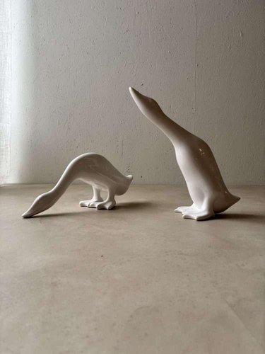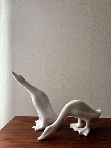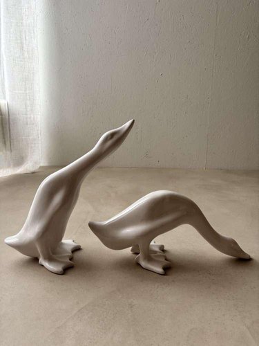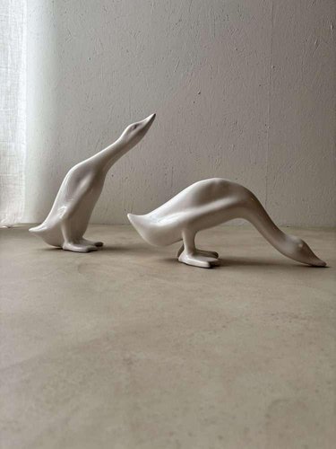 A unique set of two minimalist geese, crafted from white porcelain in the 1980s. These decorative figurines are versatile and fit beautifully into a variety of interior styles, from minimalist to modern and Japandi. Designed as a playful duo, the pair can also be placed separately in a room. Their pure design and soft white appearance create a sense of calm and elegance wherever they are placed. The set has been carefully cleaned by us and is in very good, undamaged condition. They can be used immediately as a stylish statement in your interior. We sell these only as a set of two, not individually. Dimensions: Model: High neck: Height 35.5 cm, Width 34.5 cm, Depth 16 cm, Model: Low neck: Height 19 cm, Width 43.5 cm, Depth 15 cm