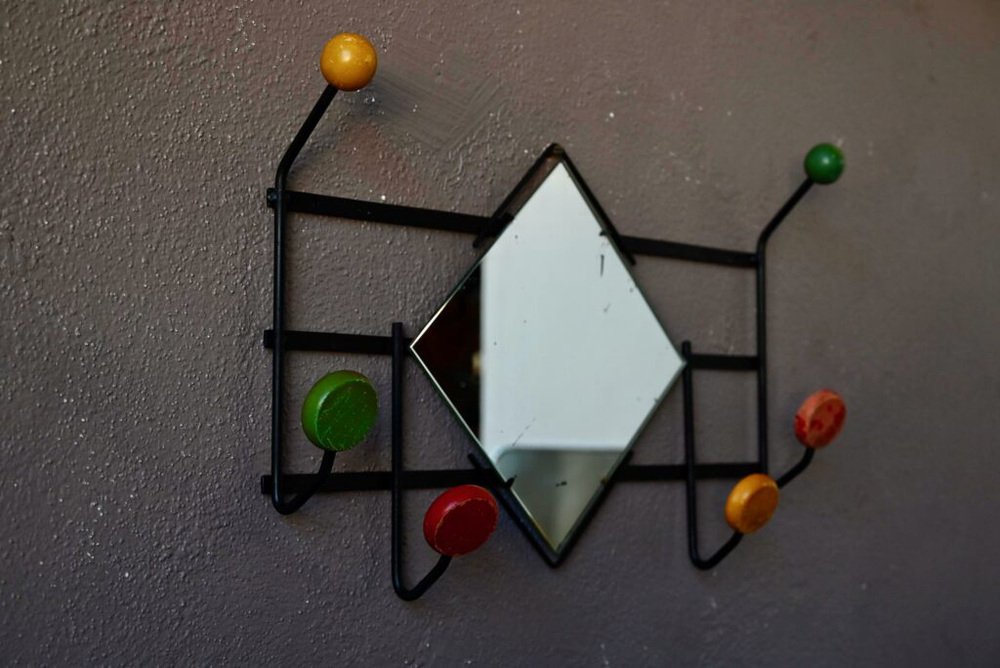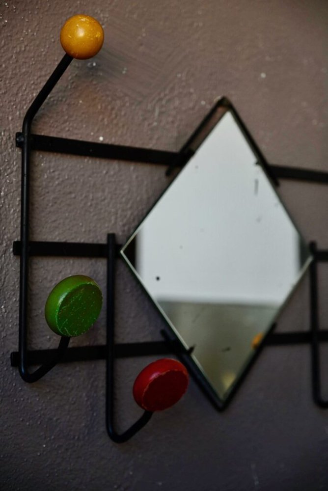 Schwarzes Metall, das von bunten Holzmänteln, einem Spiegel, 2 Kugeln und 4 Kügelchen zum Aufhängen von Kleidung und Accessoires gekrönt wird ... Alles ist in diesem Gefängnisträger aus den 1950er Jahren versammelt, um Ihren Eingang oder Ihr Badezimmer zu verschönern! Im Einklang mit den farbenfrohen Midcentury-Produktionen, finden wir die Mischung von Materialien, funktionellem Design und Vitamin-Linien ... Ein letzter Blick in den Spiegel, um sich zu schminken, und auf in den schönsten der Tage!
