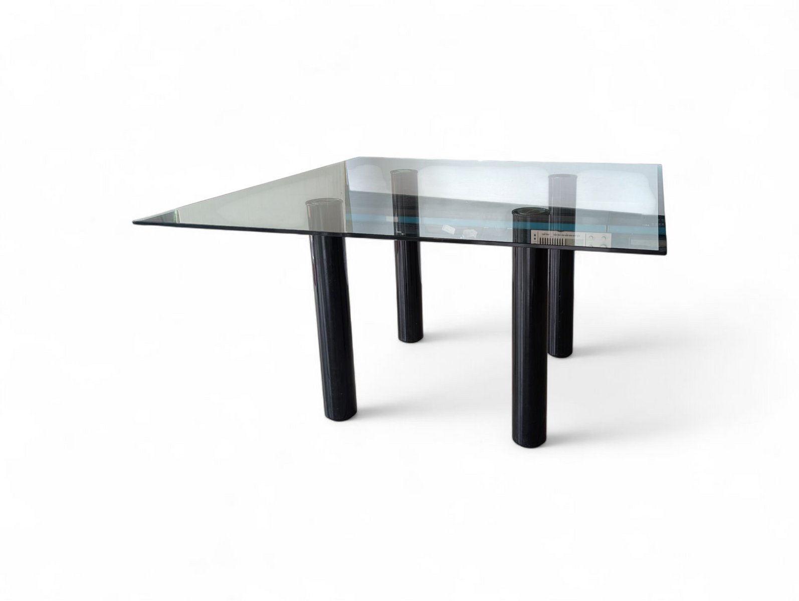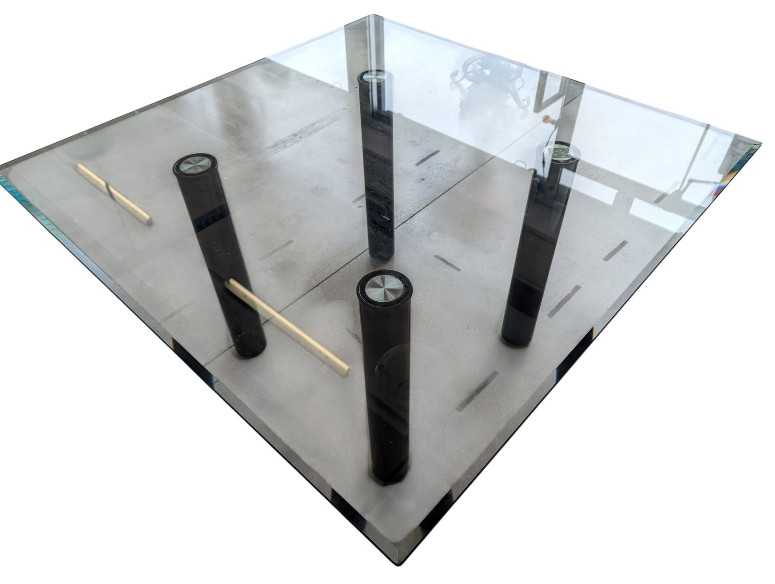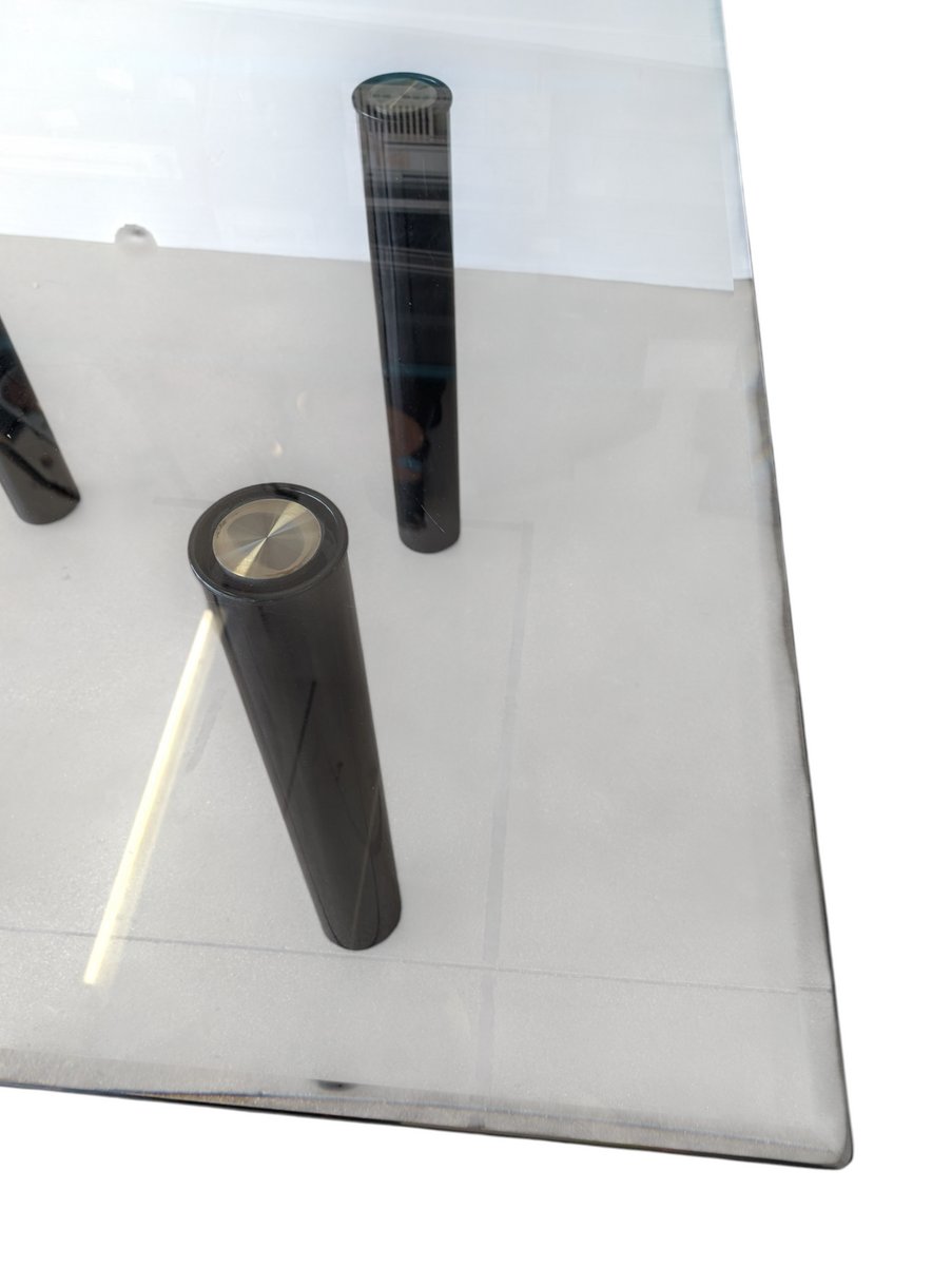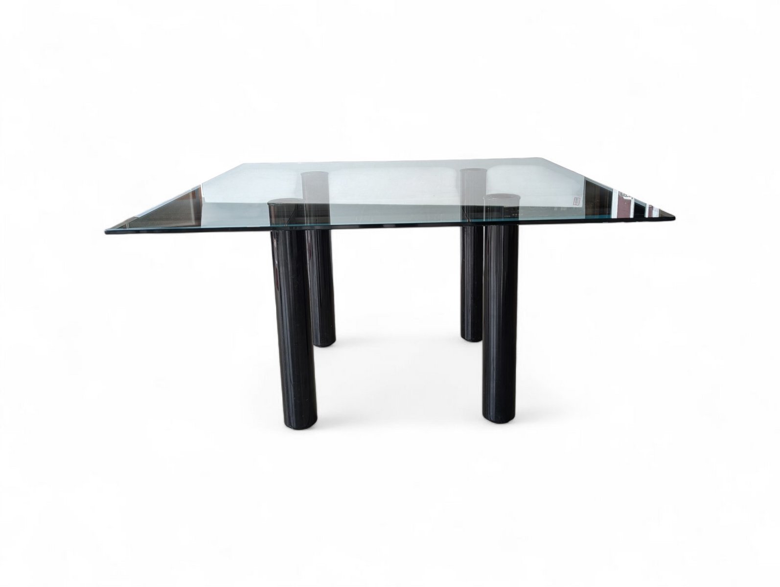 This table represents a remarkable example of contemporary design, expertly balancing materials and forms. The piece is crowned by a large square clear glass top, whose reflectivity and lightness elegantly contrast with the base. Supporting the glass top are four sturdy cylindrical legs, crafted from black enameled metal. This finish gives the columns a deep, uniform sheen, accentuating their sculptural solidity. The choice of enameled metal not only ensures stability and durability, but also adds a touch of sophisticated modernity, making this piece a visually striking focal point in any tastefully furnished space.