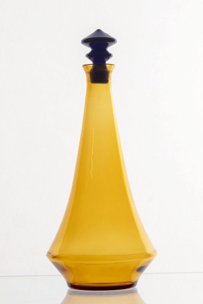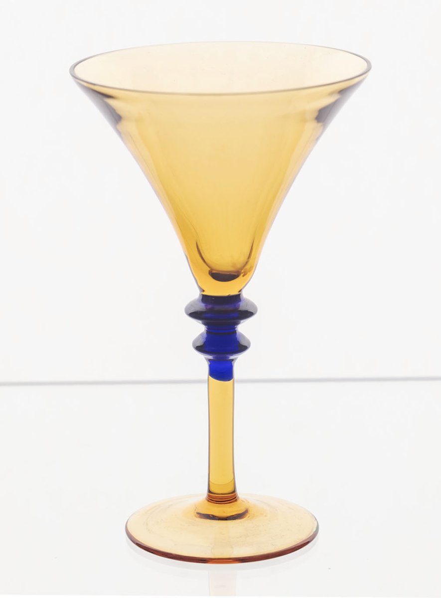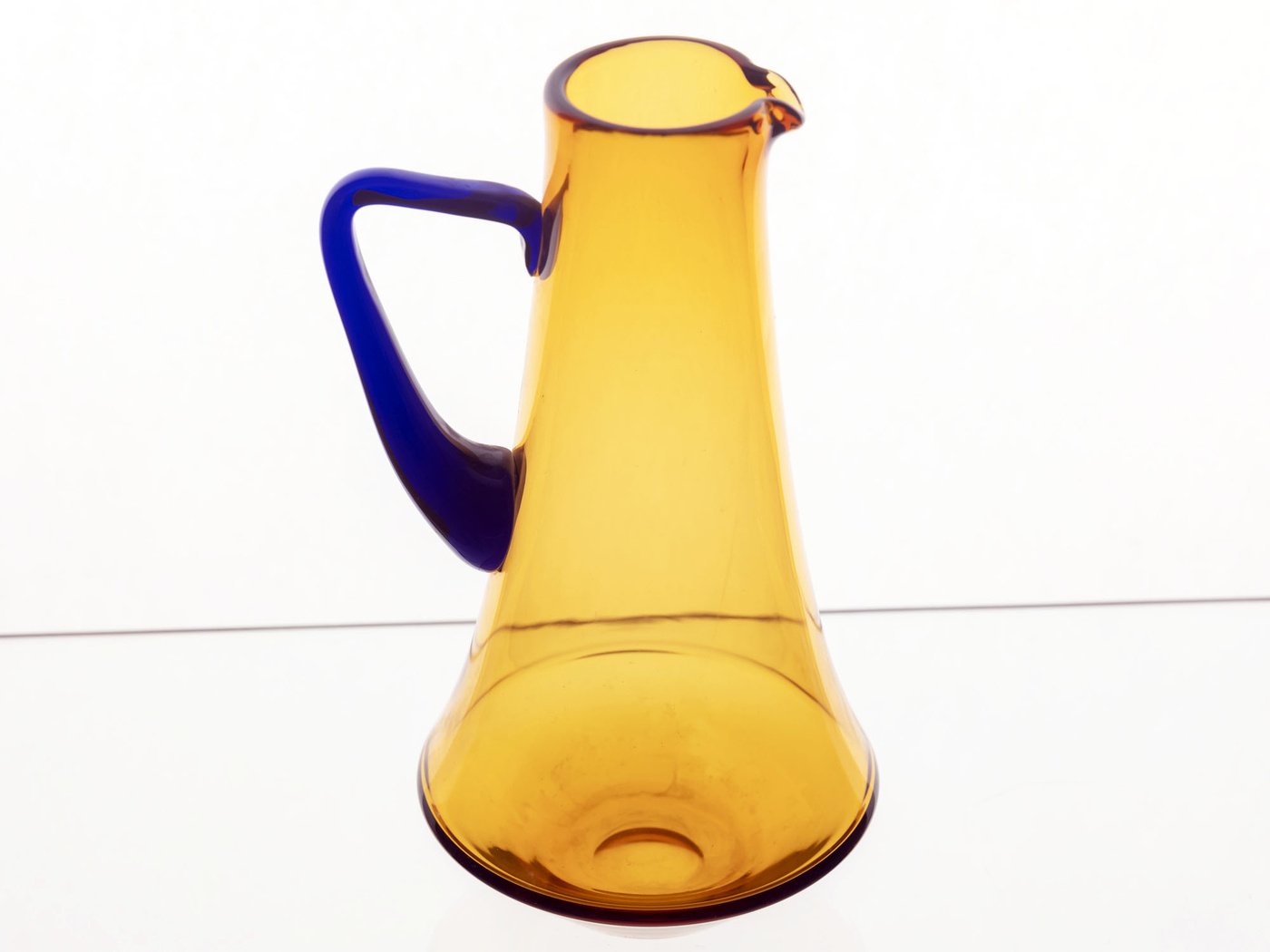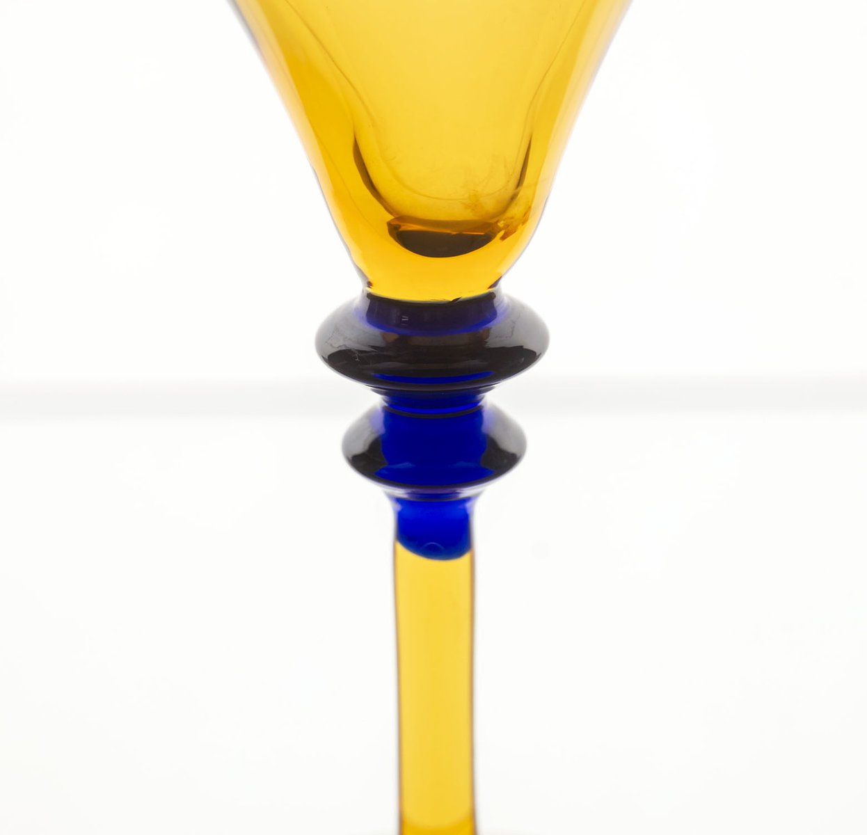 This seven-piece glassware set dates to the 1970s and is attributed to Exbor or Železný Brodské sklo, makers recognized for their decorative and artistic glasswork during this period. The set features a refined palette of amber, clear, and blue glass, creating a visually balanced and harmonious collection.