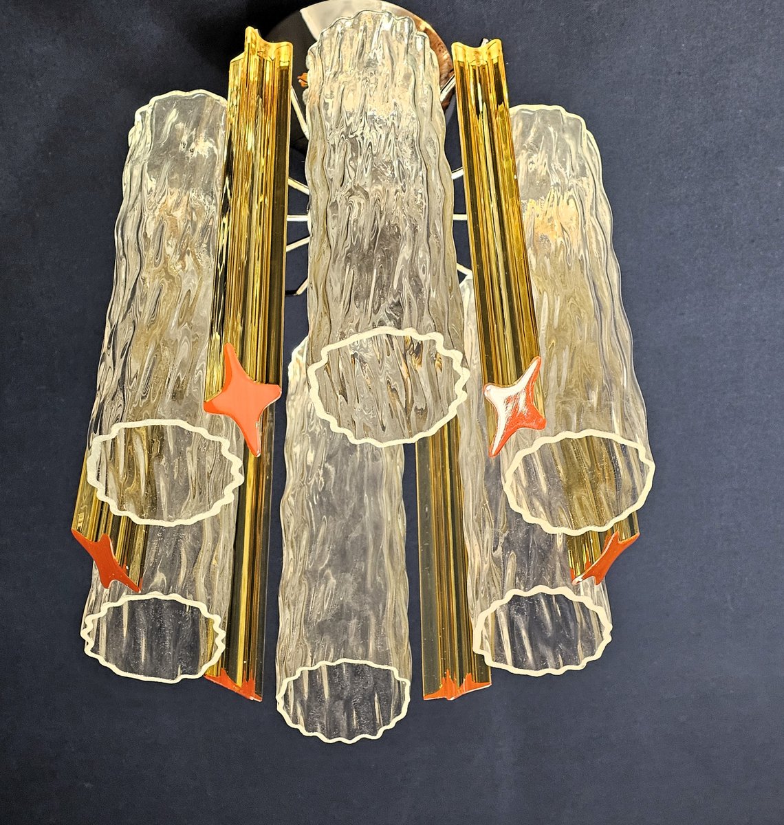 Vintage Murano Deckenleuchte, Barovier Stil, 1980er Jahre. mit zwei verschiedenen Arten von Murano-Glas, abwechselnd. Es handelt sich um quadratische Prismengläser aus bernsteinfarbenem Kristall. Und Murano-Röhren-Zylinder-Gläser mit einer besonderen, geriffelten Struktur in Kristall. Insgesamt gibt es 12 Gläser. Mit ihrem Stil, der zwischen Moderne und Vintage changiert, passt sich diese zeitlose Deckenleuchte perfekt an alle Umgebungen an und bietet viel Design. Die Ausführung des Kronleuchters ist aus poliertem Chrom, wodurch die Bernstein- und Kristallfarbe der beiden Muranogläser besser zur Geltung kommt. Er passt sich jeder Umgebung an und kann allein in kleinen Räumen aufgestellt werden. In größeren Räumen kann er paarweise in der gleichen Farbe oder in Kombination mit der anderen Deckenleuchte der gleichen Serie, aber in Kristall und Aquamarinblau, verwendet werden. Ihre Maße sind Durchmesser 30 cm. und Höhe 40 cm. Sie nimmt n. 1 E27 Glühbirne.