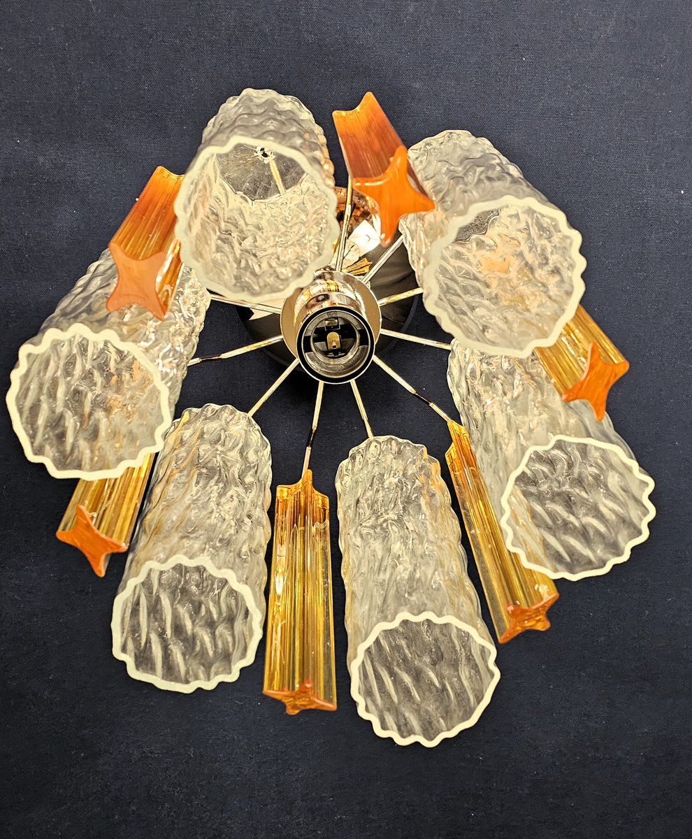 Vintage Murano ceiling lamp, Barovier style, 1980s. with two different types of Murano glass, alternating. In fact, there are quadrihedral prism glasses, in amber-colored crystal. And Murano tube-cylinder glasses, with a particular rippled texture, in crystal. For a total of n. 12 glasses. with a style that intertwines between modern and vintage, this timeless ceiling lamp adapts perfectly to all environments, creating a lot of design. The finish of the chandelier is polished chrome, which allows for greater emphasis to be given to the amber and crystal color of the two types of Murano glass. Adaptable to any environment, it can be placed alone in small rooms, or in larger rooms it can be used in pairs of the same color, or combined with the other ceiling lamp of the same series, but in crystal and aquamarine blue. Its measurements are diameter 30 cm. and height 40 cm. It takes n. 1 E27 bulb.