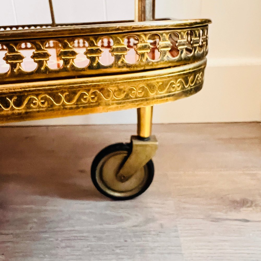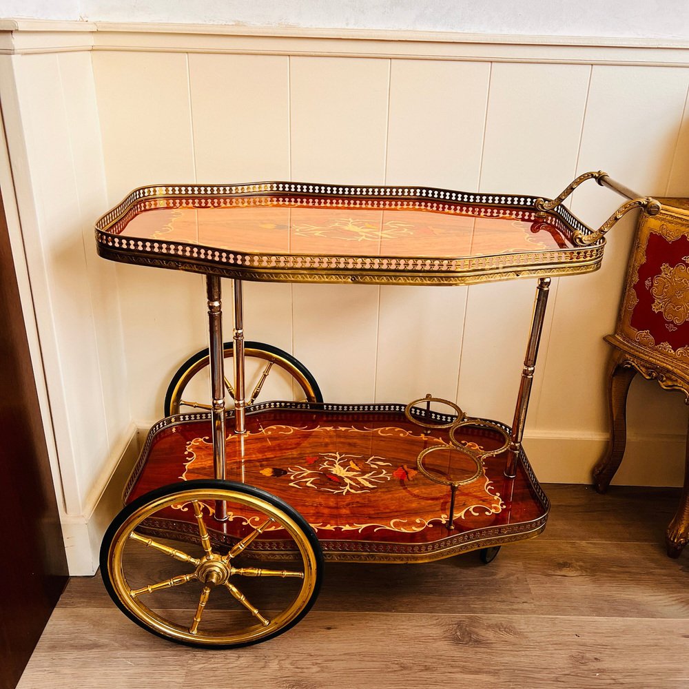 Intarsien Bar Cocktail, Tee, Wagen / Trolley Italienisch Hollywood Regency Stil. Hergestellt in Italien. Italienischer Barwagen im Hollywood-Regency-Stil mit Intarsien, Messingbeschlägen und ausziehbarer Tischplatte. Kann als Barwagen oder Teewagen verwendet werden. Eine tolle Ergänzung für Ihr Wohnzimmer. Dies ist ein schöner Barwagen für Unterhalter, funktionell mit 3 Rädern. Er eignet sich hervorragend für die Präsentation Ihres Bar-Sets oder zum Ausrollen von Gebäck und Teeservice. Dieser Wagen ist in gebrauchten Vintage-Zustand, mit einigen Anzeichen von Verschleiß und kleine Kratzer / Risse. Sehen Sie die Fotos für alle Details und die Unvollkommenheiten. Abmessungen: Höhe: 70 cm mit dem Griff / 27 Zoll, Breite: 68 cm / 26,7 Zoll, Tiefe: 42 cm durch die Räder / 16 Zoll. Durchmesser große Räder: 33 cm / 12 Zoll. Der Barwagen wird für einen sicheren Versand demontiert werden!