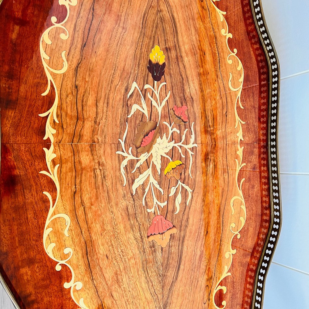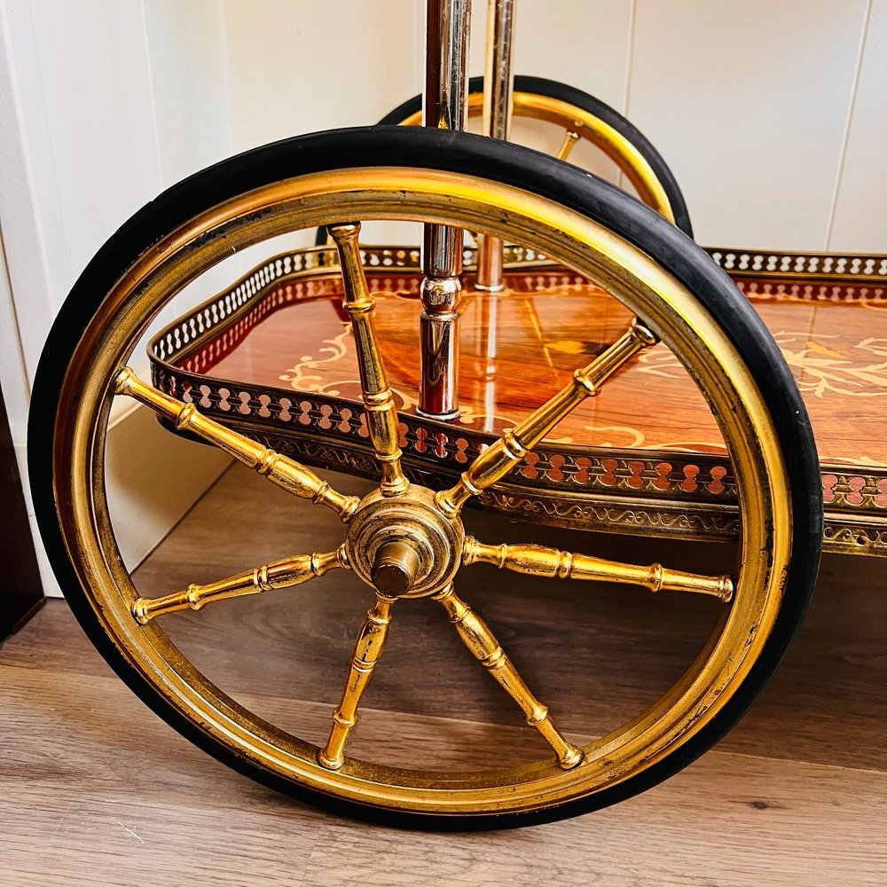 Marquetry Inlaid Bar Cocktail, Tea, Cart / Trolley Italian Hollywood Regency Style. Made in Italy. Vintage Italian Hollywood Regency inlaid marquetry bar cart with brass hardware and drop leaf tabletop. Can be used as a bar cart or tea trolley. An amazing addition to your living room. This is a lovely entertainer’s bar cart, functional with 3 wheels. Great for displaying your bar set, or a wonderful item to roll out with your pastries and tea sets. This cart is in used vintage condition, with some signs of wear and small scratches/cracks. See the photos for full details and the of any imperfections. Dimensions: Height: 70 cm with the handle / 27 inches, Width: 68 cm / 26.7 inches, Depth: 42 cm by the wheels / 16 inches. Diameter big wheels: 33 cm / 12 inches. The bar cart will be disassembled for a safety shipment!