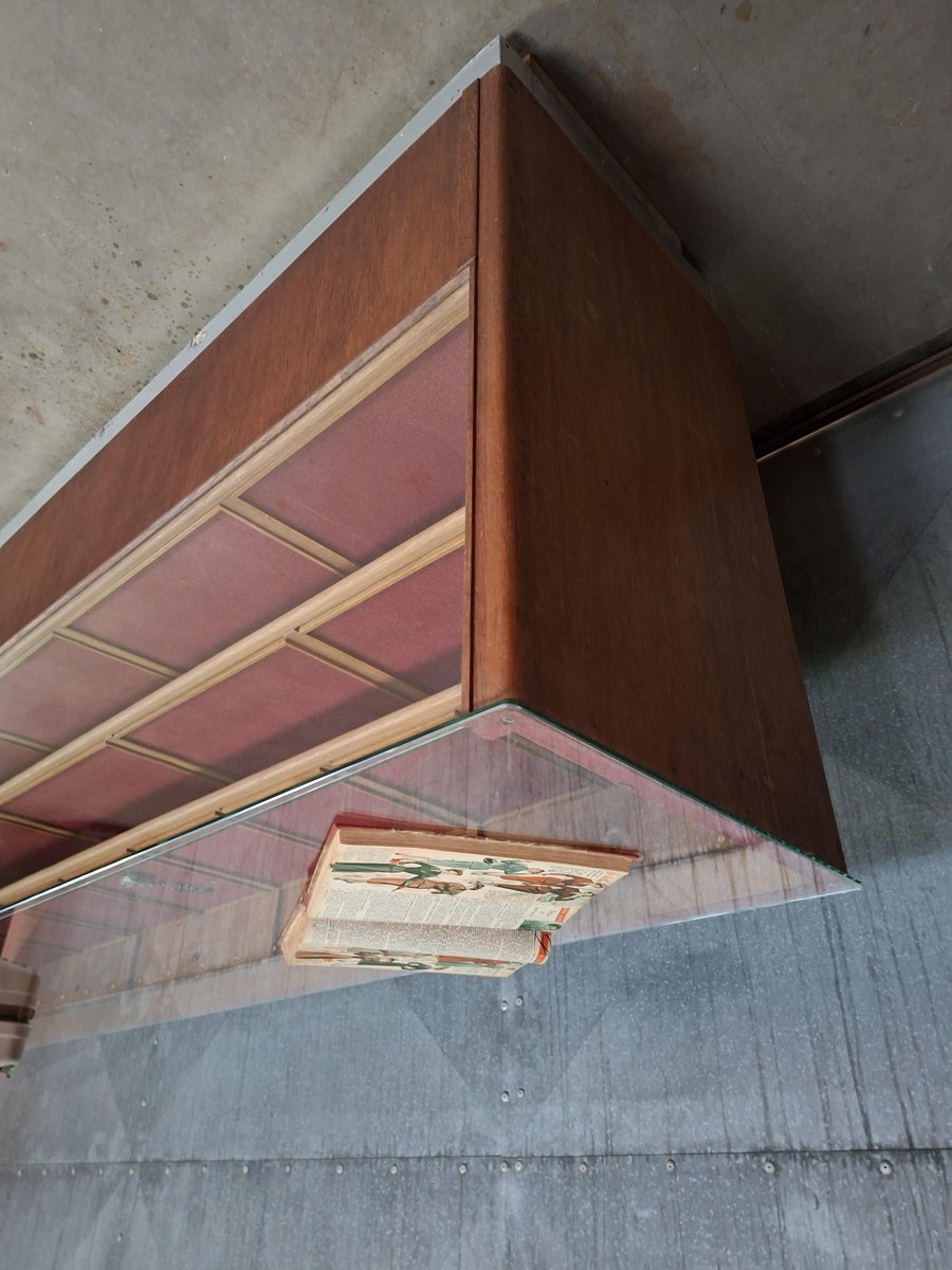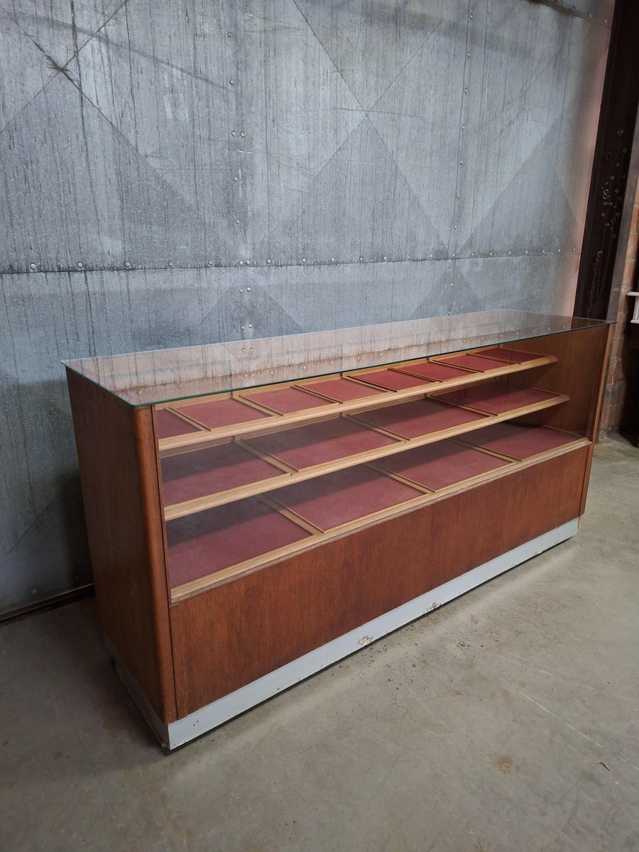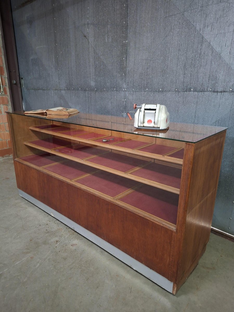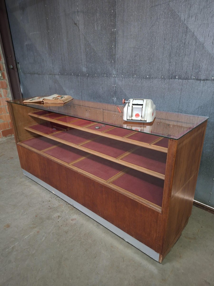 Insgesamt 20 Schubladen – Intelligente und ordentliche Aufbewahrung Glasplatte – Präsentieren Sie Produkte oder Sammlerstücke Warmes Vintage-Holz – Natürlich gealtert, reich an Farbtönen Ehrliche Abnutzung – Gerade genug Patina, um eine Geschichte zu erzählen Passt in Geschäfte, Ateliers oder Wohnungen – Stilvoll und nützlich Abmessungen: 198 x 53,5 x 94 cm Eine Theke mit Charme und Nutzen.