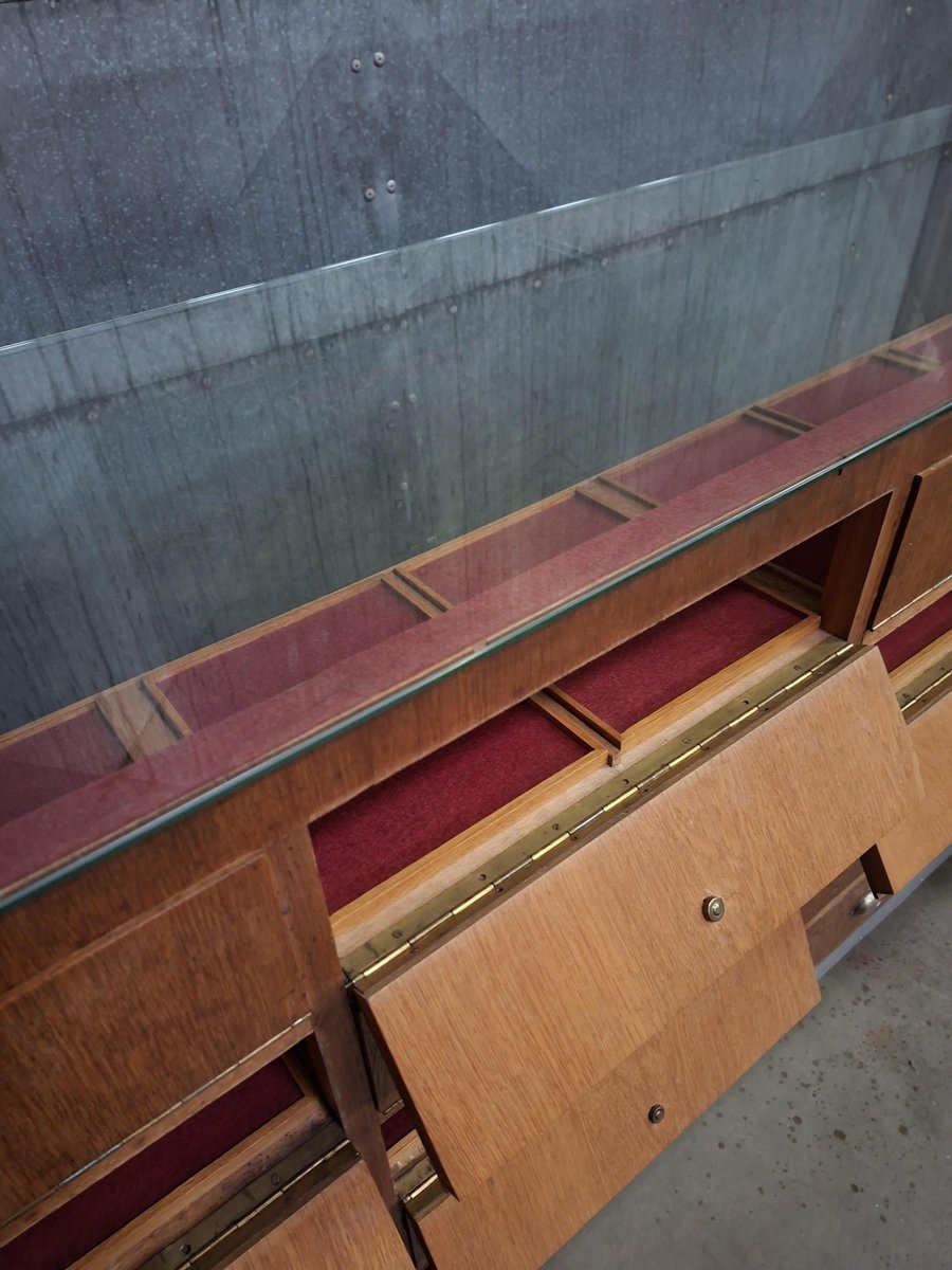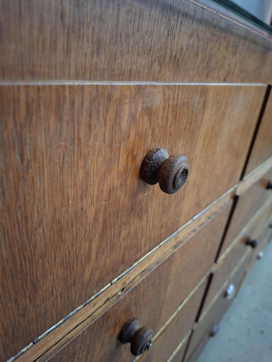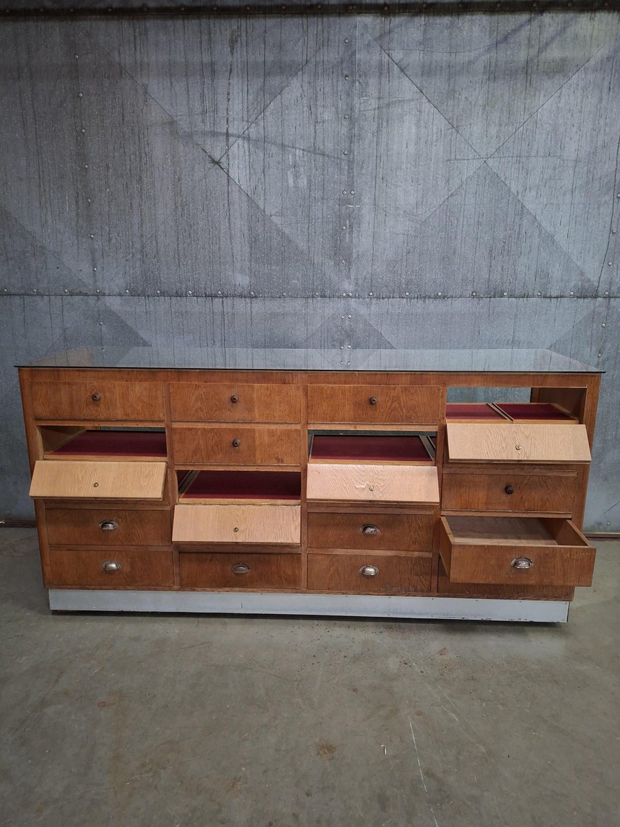 Diese Vintage-Ladentheke ist mehr als nur ein Aufbewahrungsmöbel. Mit 12 Klappfächern, 8 tiefen Schubladen und einer Glasablage ist sie ein praktisches und charaktervolles Möbelstück für Boutiquen, Cafés oder Innenräume mit Geschichte.
