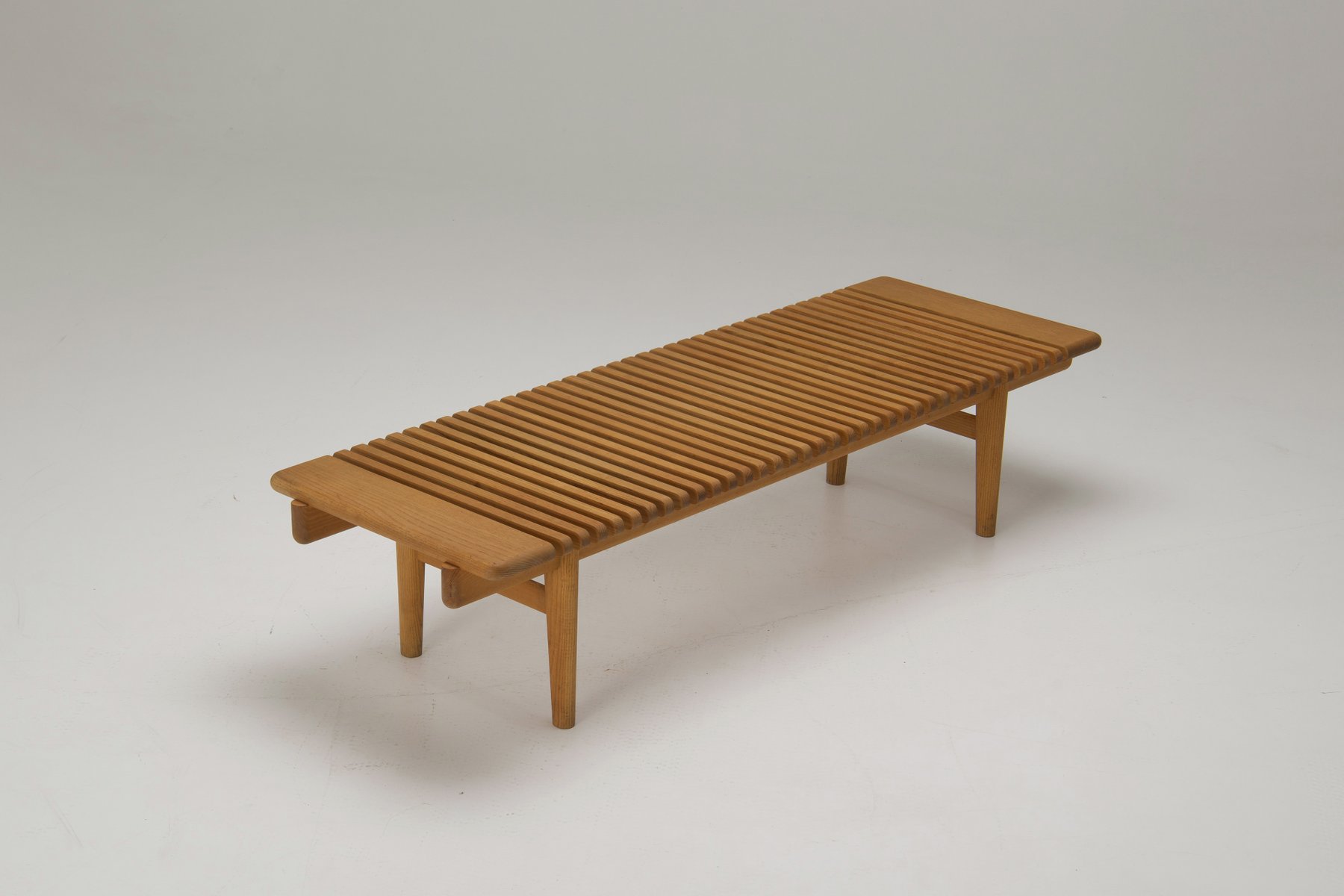 This is a JH589 Bar Bench designed by Hans Wegner in ash wood. Wegner designed this bench for his own hallway in 1953. It was taken into production by Johannes Hansen's Møbelsnedkeri A/S in Denmark the same year. This copy is one of the last ones they manufactured. Production resumed in the 1990s by PP Møbler.