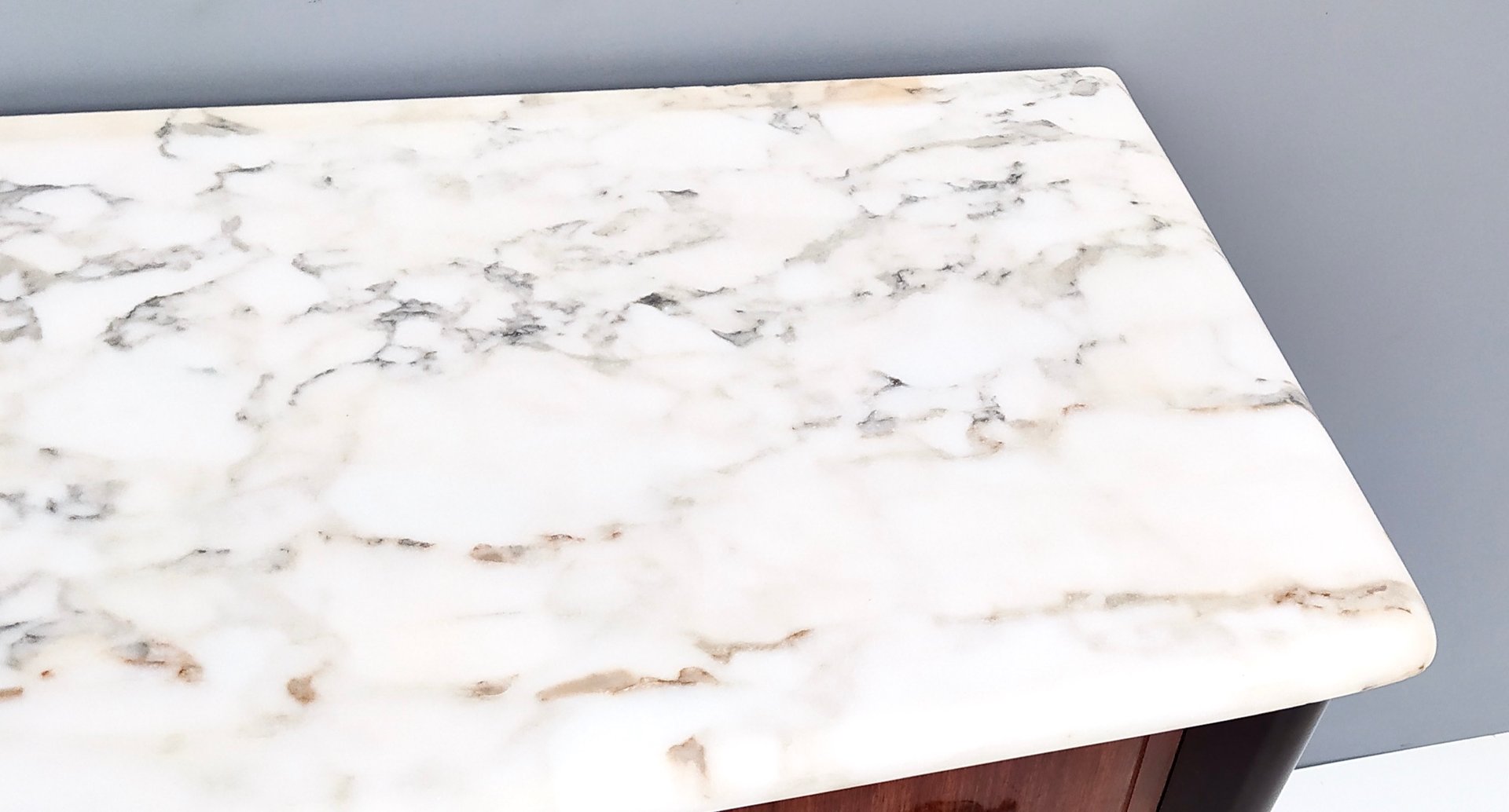 Die Beine sind aus massiver Buche, die Innenausstattung aus massivem Hartmast, die Griffe, Schlüssel und Fußkappen aus Bronze und die Platte aus Carrara-Marmor.
