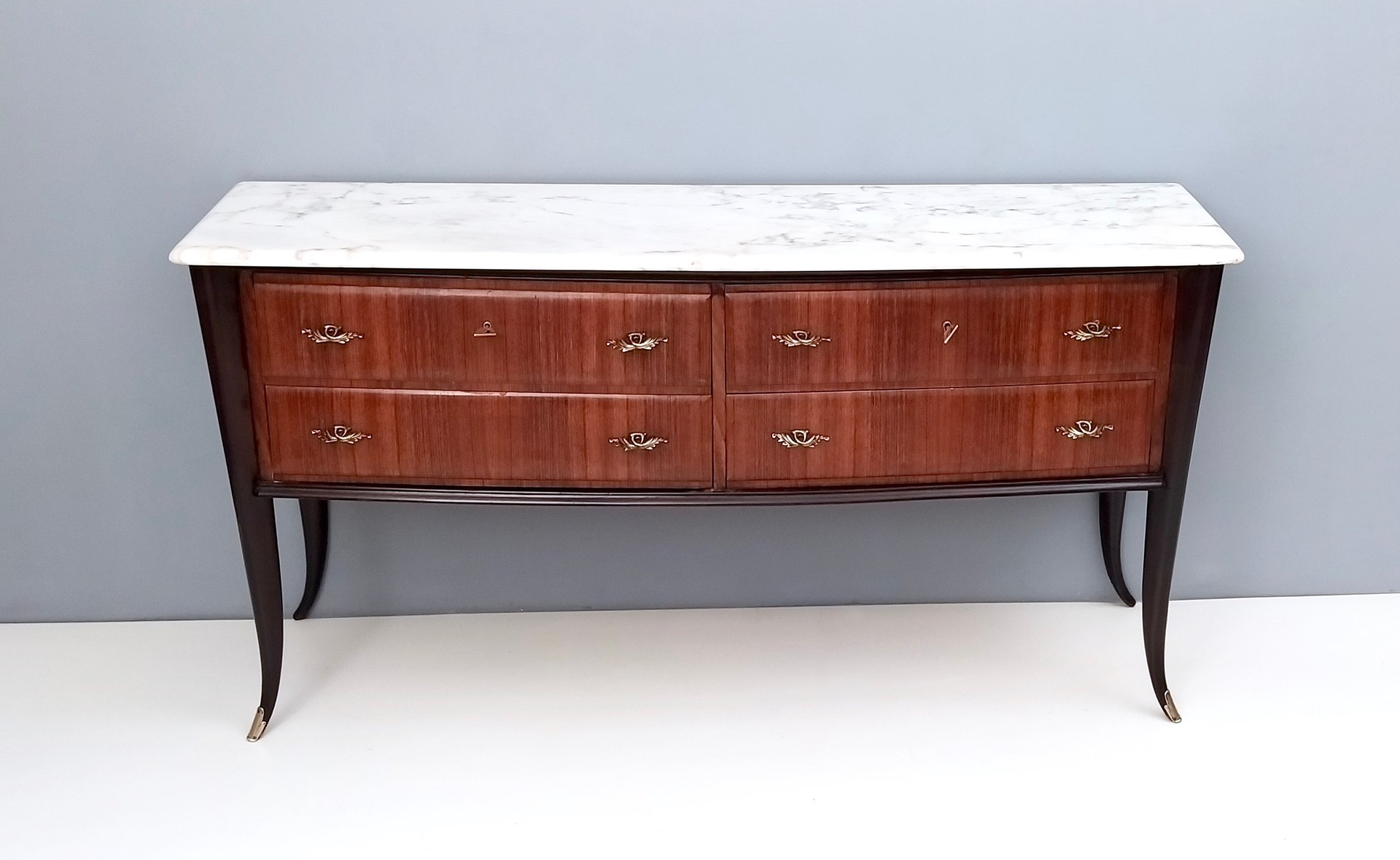 It features solid beech legs, solid durmast interiors, bronze handles, keys and feet caps, and a Carrara marble top.