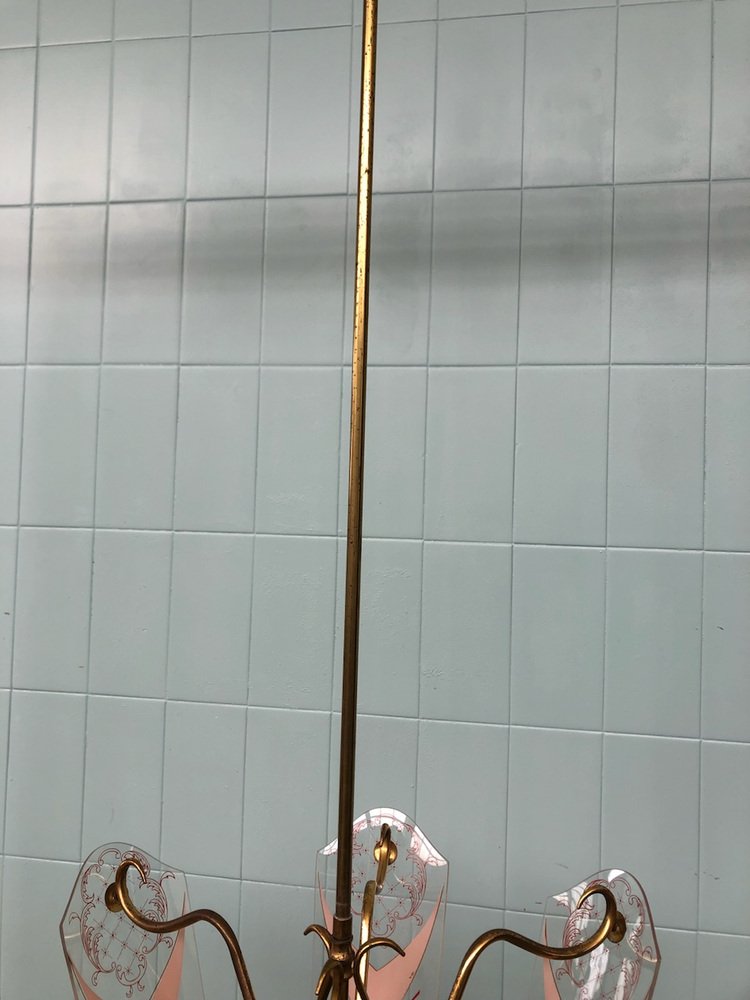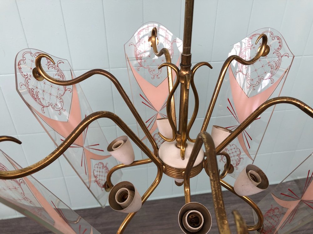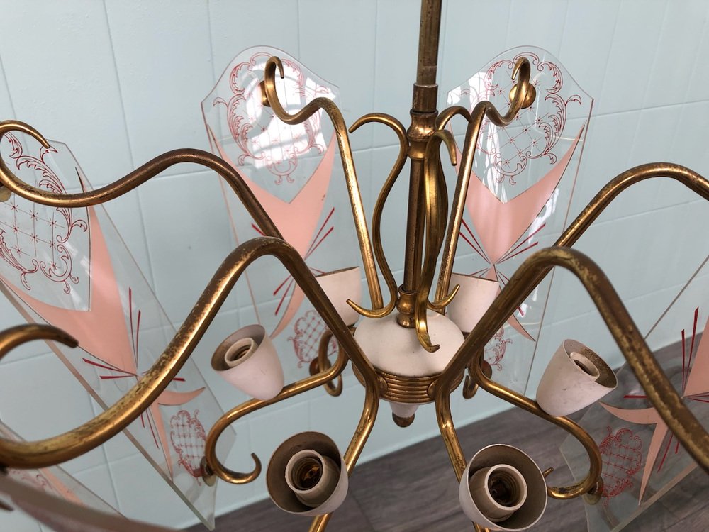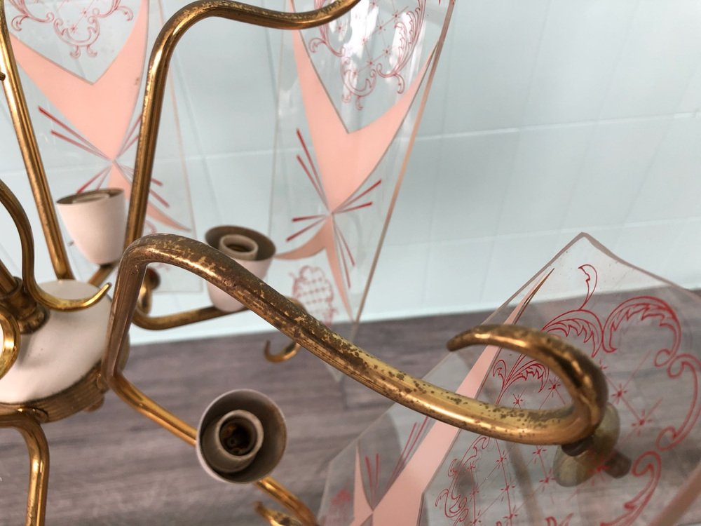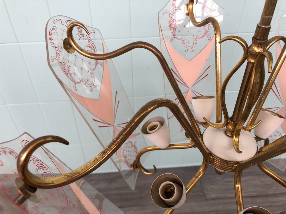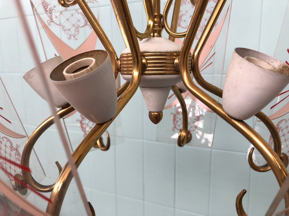 Vintage Kronleuchter aus Messing mit verzierten Glaslampenschirmen, Italien, 1950er