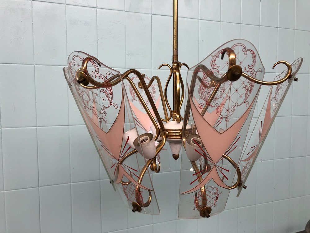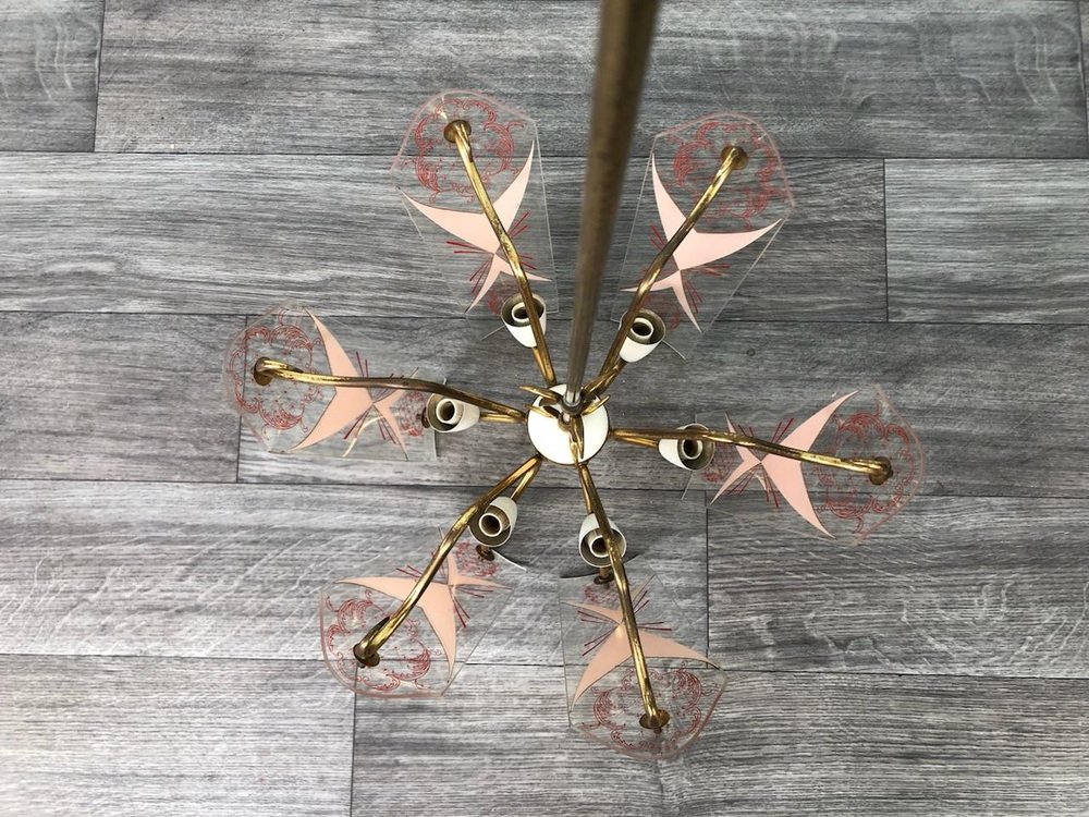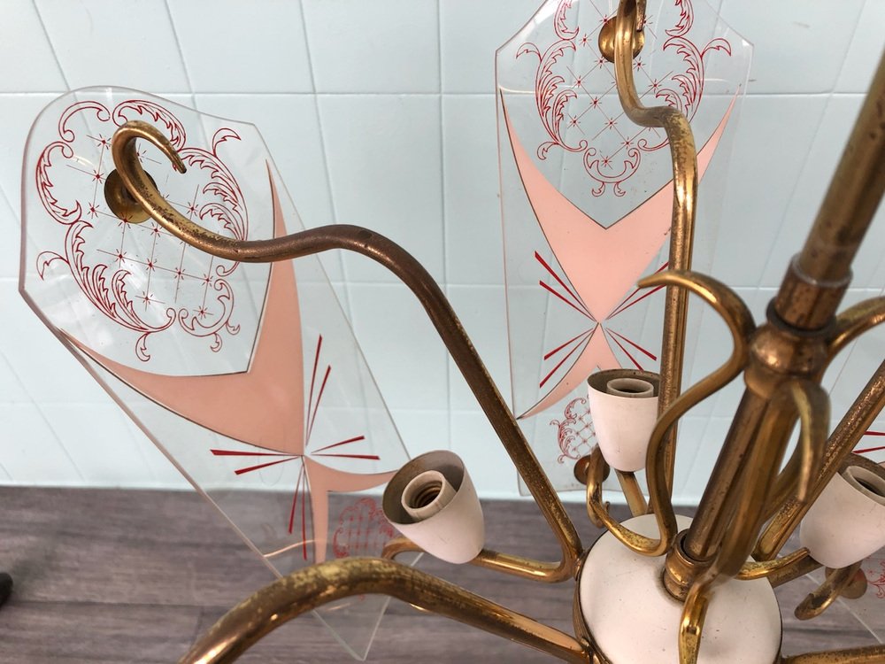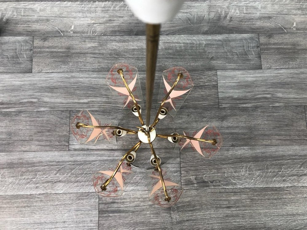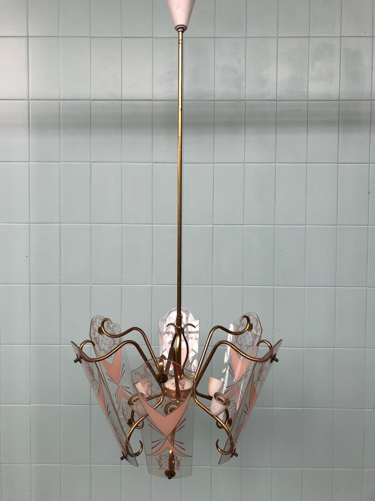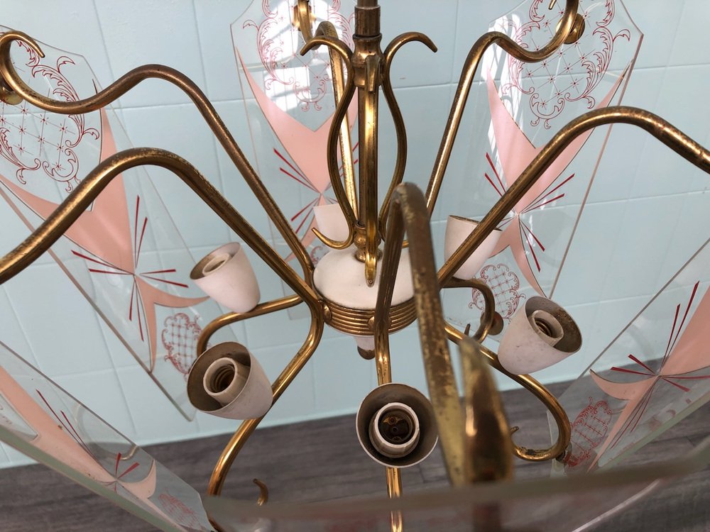 Vintage Kronleuchter aus Messing mit verzierten Glaslampenschirmen, Italien, 1950er